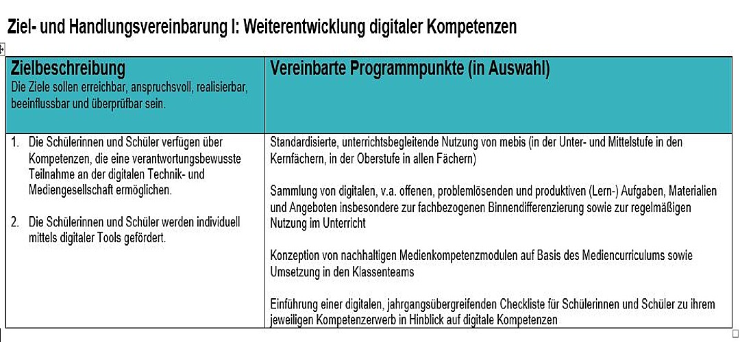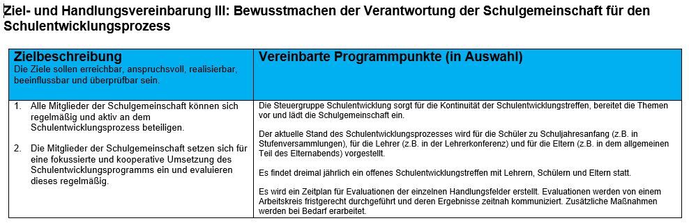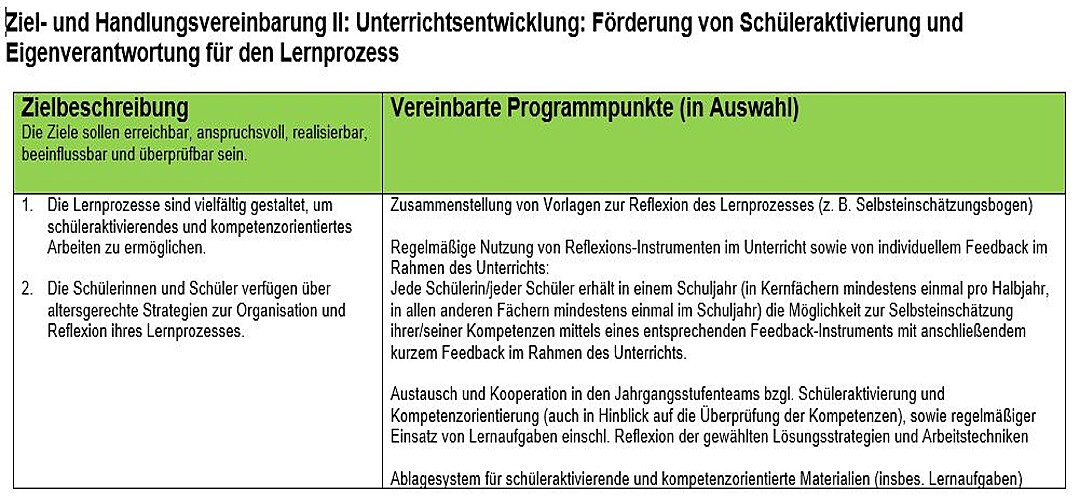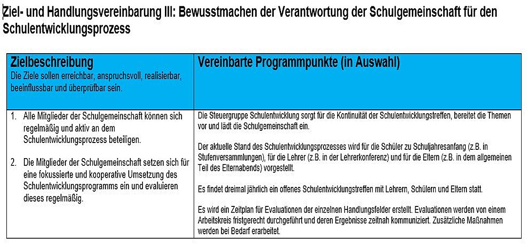 Das aktuelle Schulentwicklungsprogramm besteht aus den drei nachfolgenden Ziel- und Handlungsvereinbarungen, die kontinuierlich evaluiert werden. Der Abschlussbericht steht für Oktober 2026 an.