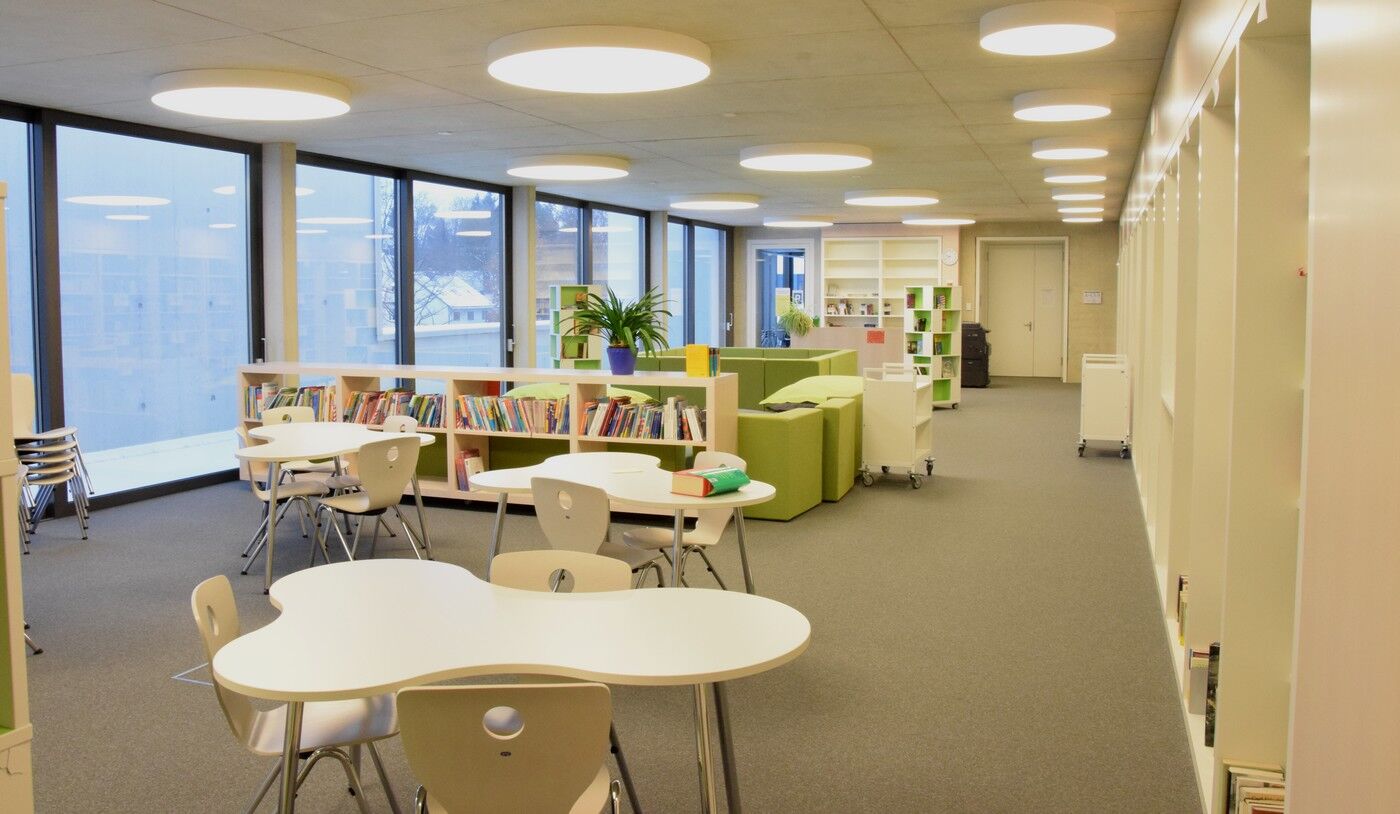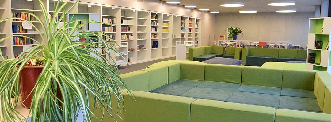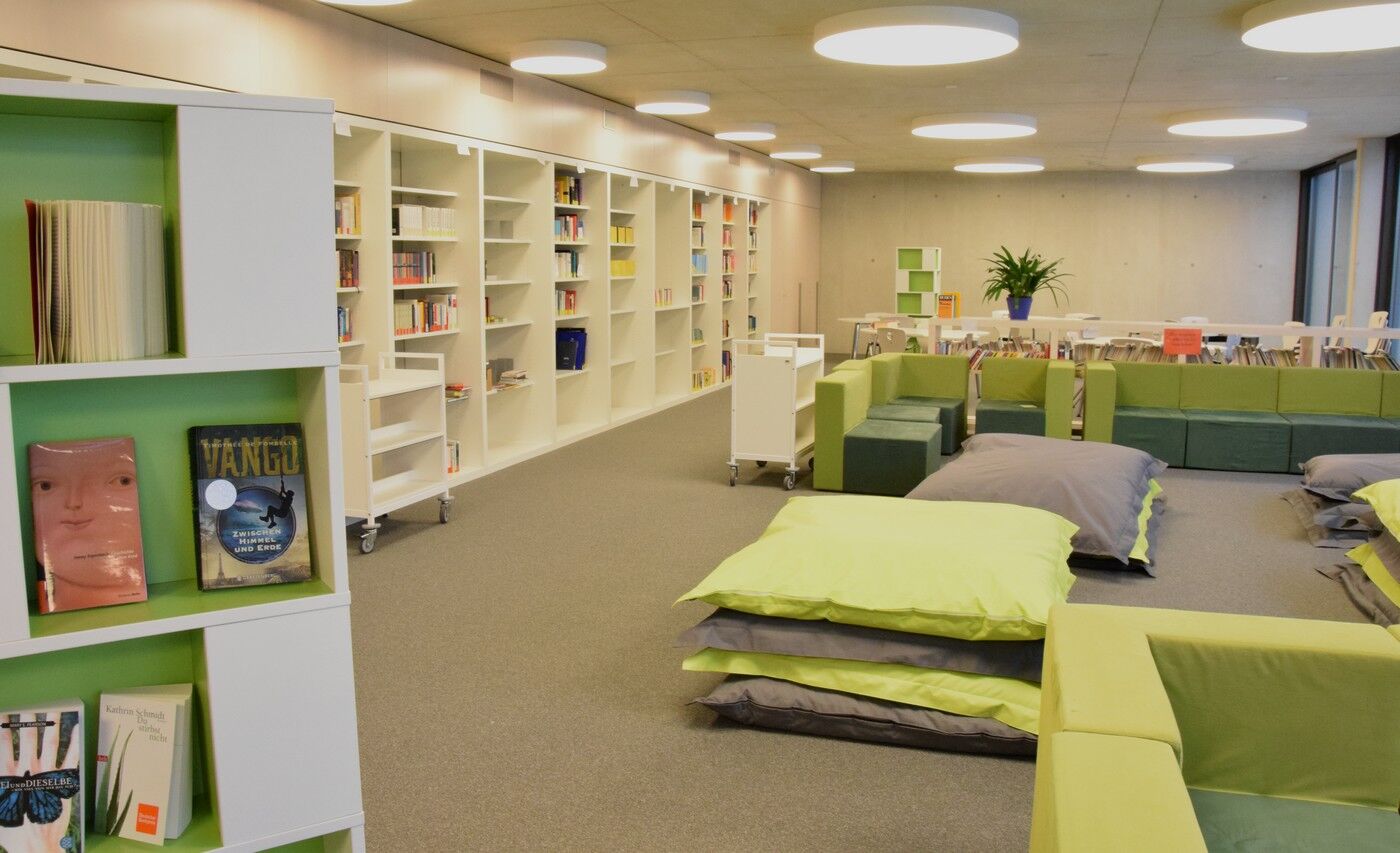 Die Bibliothek befindet sich im Aulagebäude im ersten Obergeschoss. Der große Bibliotheksraum beinhaltet eine Schülerlesebücherei mit einer großen Schmökereck sowie einen Bereich, der mit Arbeitstischen ausgestattet ist. Ebenfalls hier zu finden ist der geisteswissenschaftliche Teil der Oberstufenbibliothek (Deutsch, Geschichte, Sozialkunde, Theologie, Ethik, Sprachen).