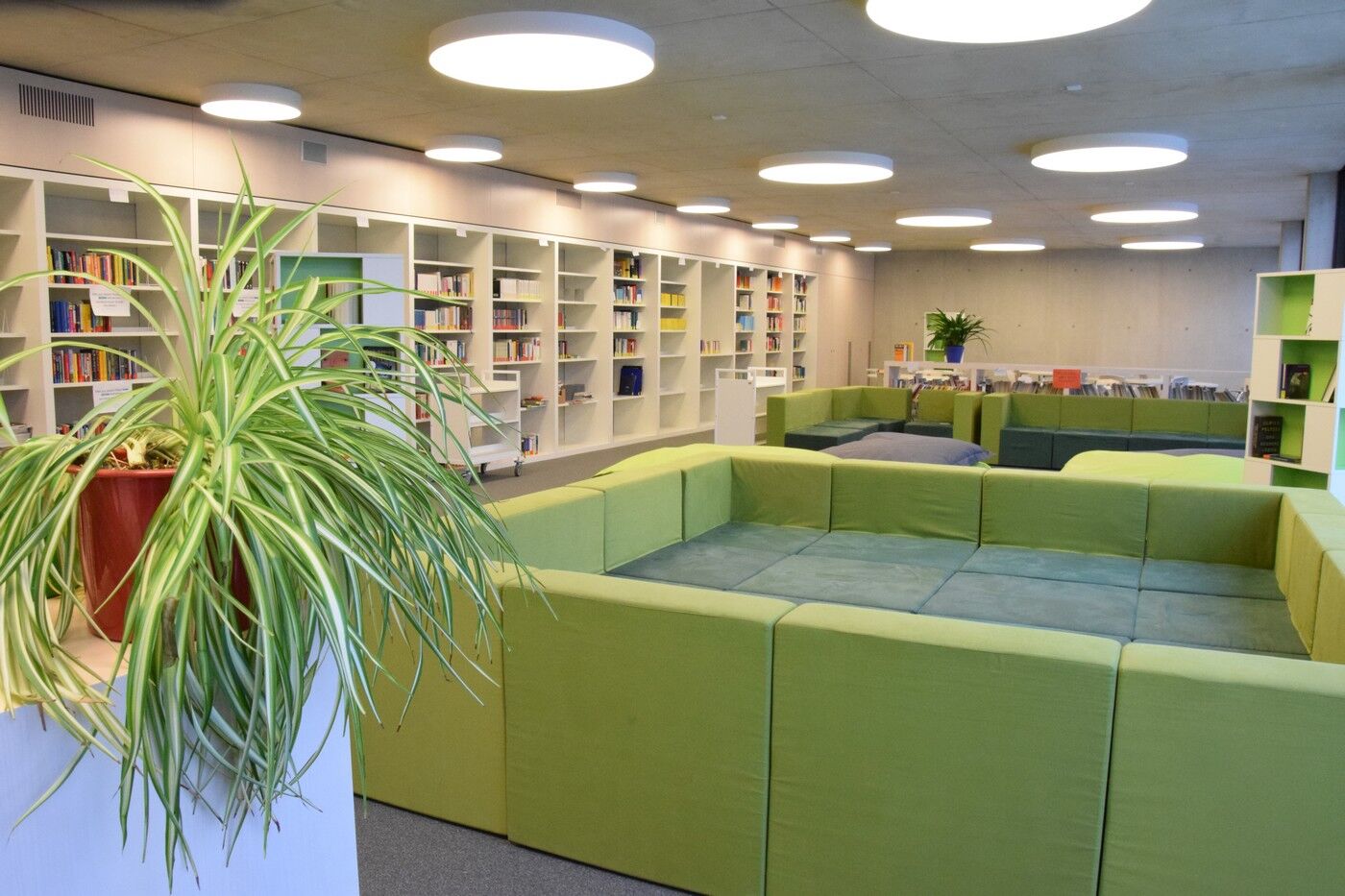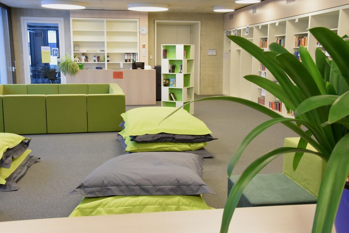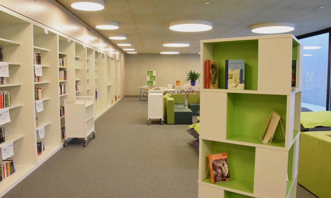 Die Bibliothek befindet sich im Aulagebäude im ersten Obergeschoss. Der große Bibliotheksraum beinhaltet eine Schülerlesebücherei mit einer großen Schmökereck sowie einen Bereich, der mit Arbeitstischen ausgestattet ist. Ebenfalls hier zu finden ist der geisteswissenschaftliche Teil der Oberstufenbibliothek (Deutsch, Geschichte, Sozialkunde, Theologie, Ethik, Sprachen).