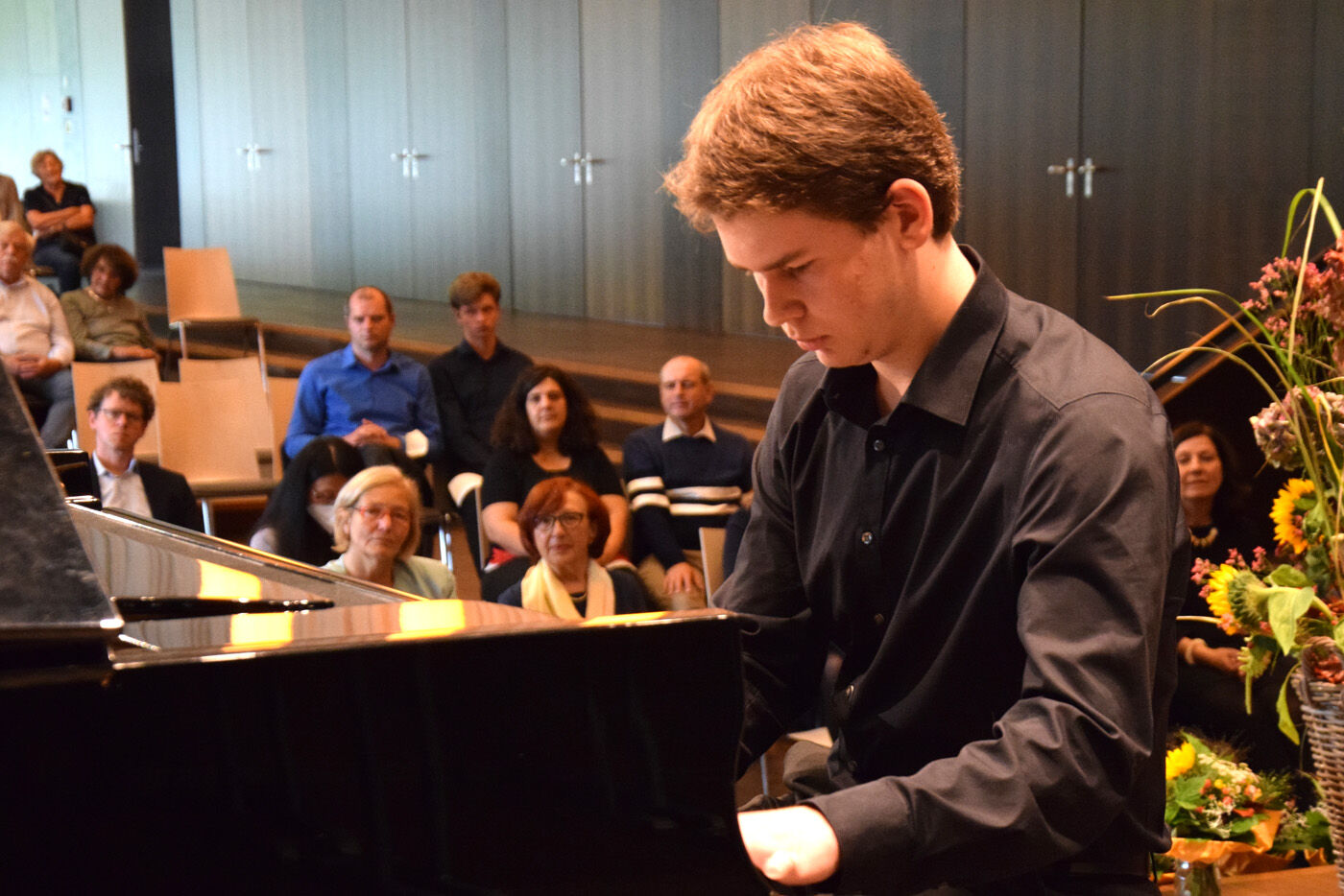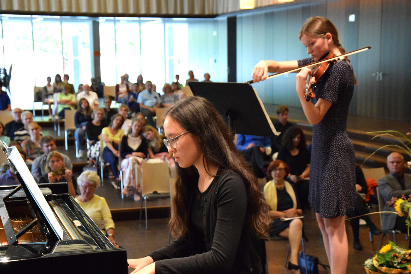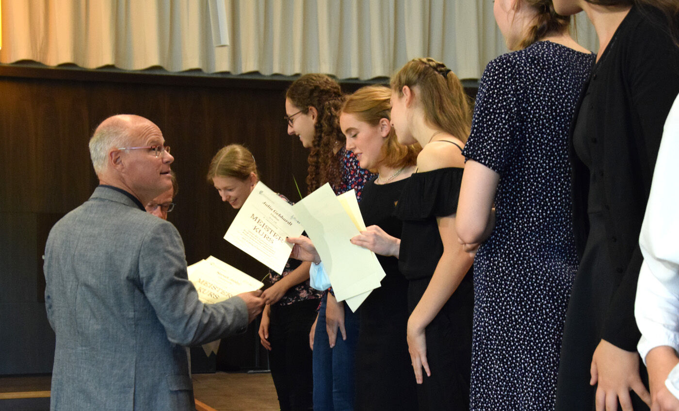 Die Aula war beim Abschlusskonzert des 8. Freisinger Meisterkurses – die aktuellen Abstandsregeln natürlich einhaltend – bis auf den letzten Platz gefüllt. Ein Livekonzert sei einfach ein anderes Erlebnis als ein Streaming-Konzert, so Professor Vogel, der zusammen mit Franz Scheuerer diesen Meisterkurs leitete. Frohe Gesichter bei allen, nicht nur bei den jungen Musikerinnen und Musikern auf der Bühne, sondern auch bei den vielen Zuhörern. Und was ein Streaming-Konzert nicht vermitteln kann, sind die Gespräche nach einem Konzert. So standen Künstler wie Zuschauer noch lange nach Konzertende im Schulhof und ließen gut gelaunt das wunderbare Konzert nochmals Revue passieren.