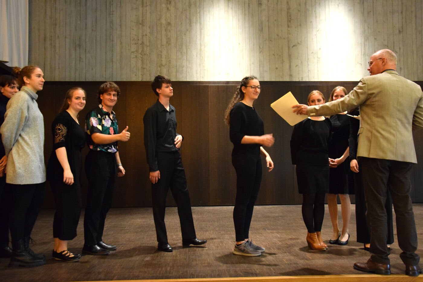 Nicht nur das Meisterkonzert, sondern auch die intensiven Übungsstunden sind öffentlich und können besucht werden. Die Schülerinnen und Schüler optimieren dabei unter äußerst fachkompetenter Anleitung die ihnen bereits bekannten und geübten Stücke. Die Zuhörerinnen und Zuhörer in der gefüllten Aula waren sich einig, dass sich das Üben ausgezahlt hat. Prof. Vogel führte wie immer kurzweilig und anekdotenreich durch den meisterlichen Nachmittag. Neben einer Urkunde erhielten die jungen Musikerinnen und Musiker traditionsgemäß eine überdimensionale Brezen.