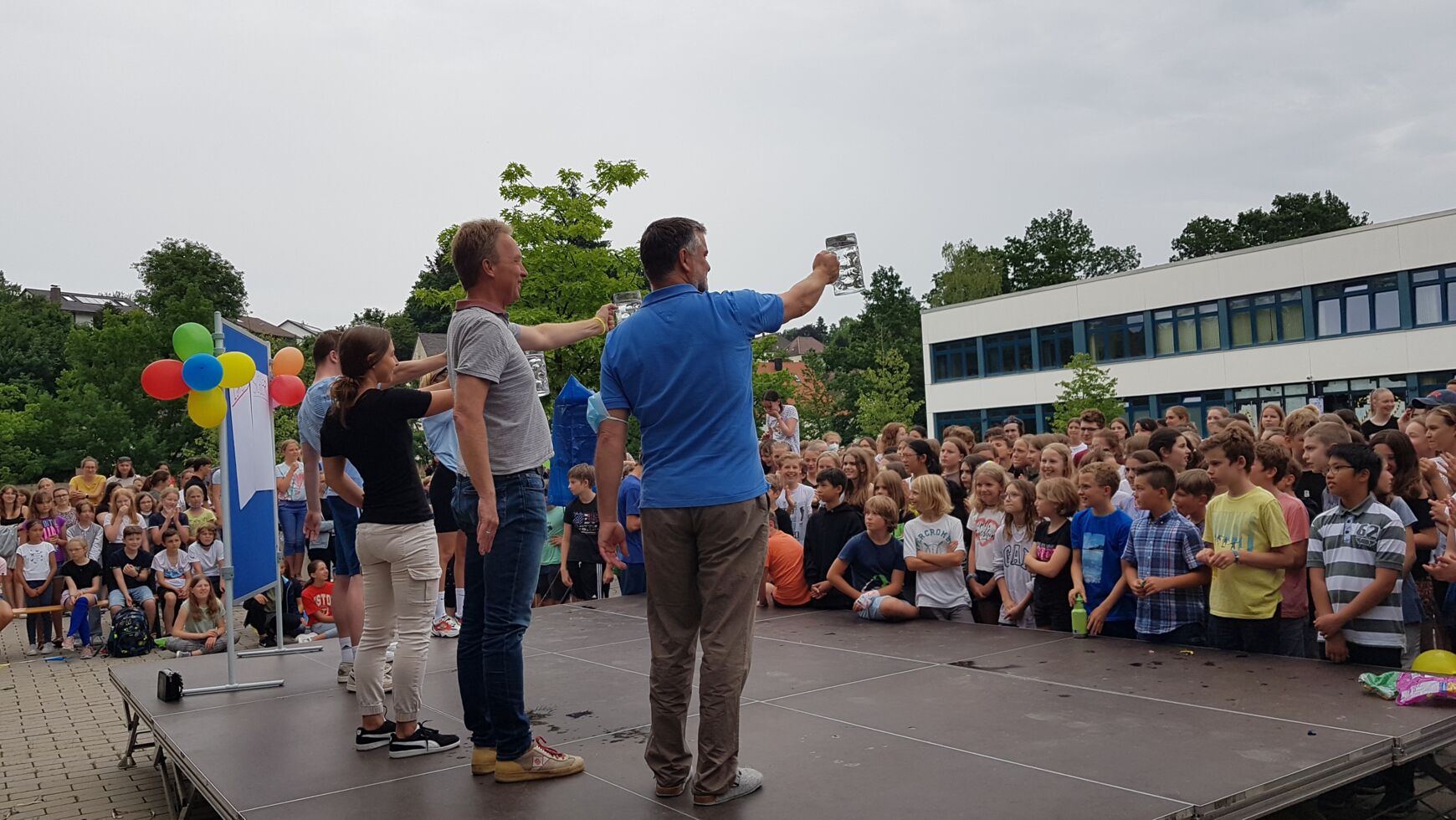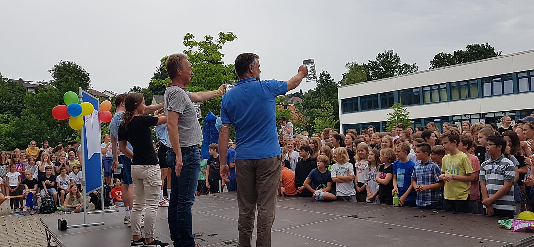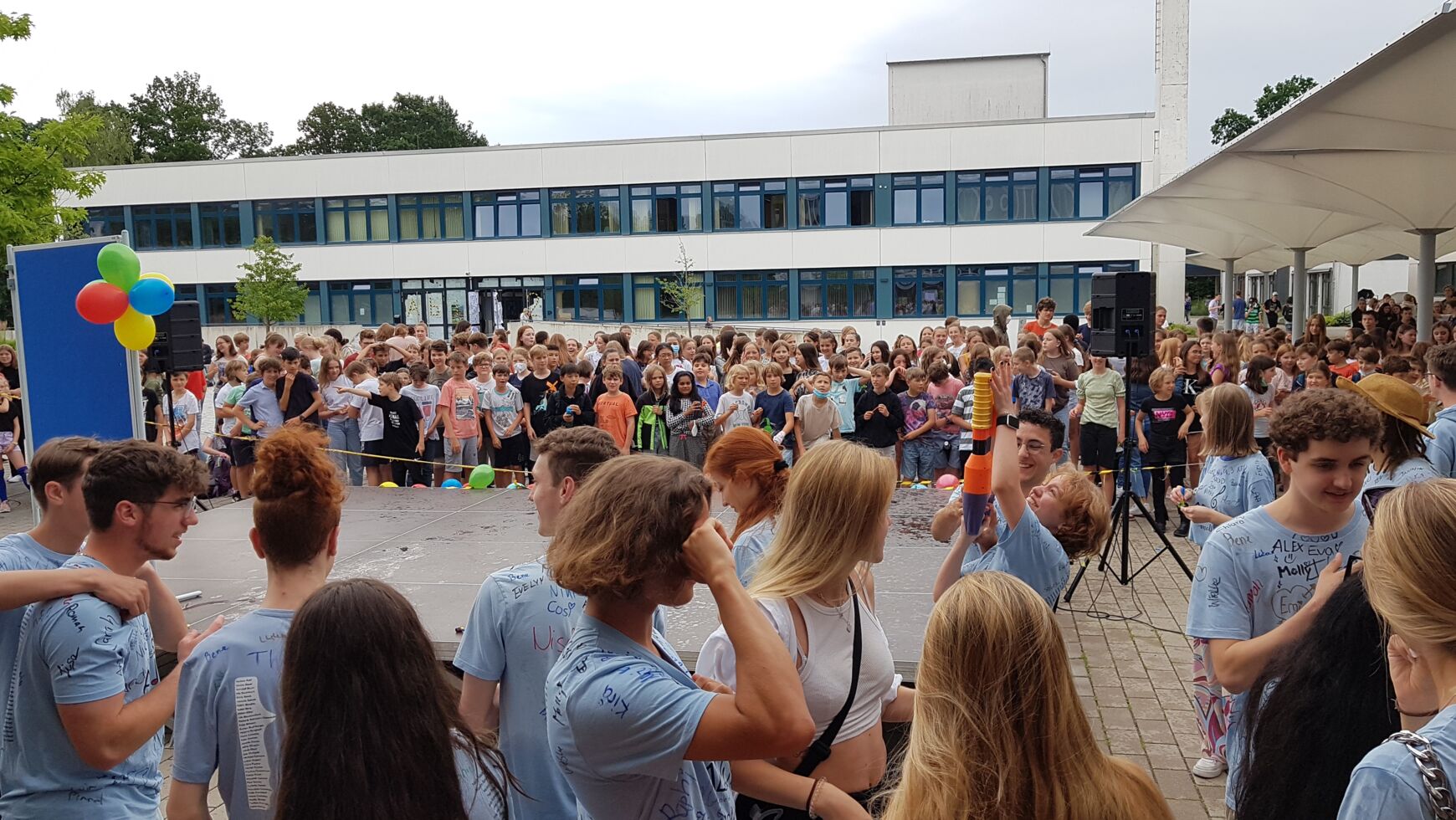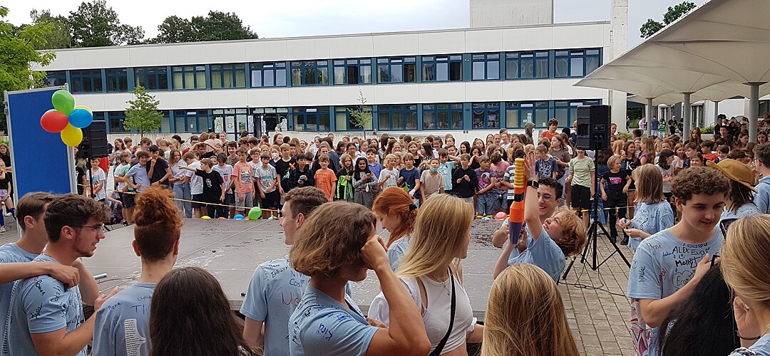 Für Lehrkräfte war sogar in einem eigenen "VIP-Bereich" mit Kuchen, Muffins und Hotdogs ganz hervorragend für das leibliche Wohl gesorgt. Sie konnten sich so für folgende Challenges gegen die Abiturientinnen und Abiturienten stärken: Reise nach Jerusalem, Quiz, Schlager-Song-Contest, Masskrugstemmen, Schokokuss-Wettessen. Doch alle Stärkung half nichts und die Lehrer*innen, die alles gaben und am Ende zu Macarena auf der Bühne tanzen durften, verloren 5:0. Der Abistreich klang dann bei Musik und Tanz aus.