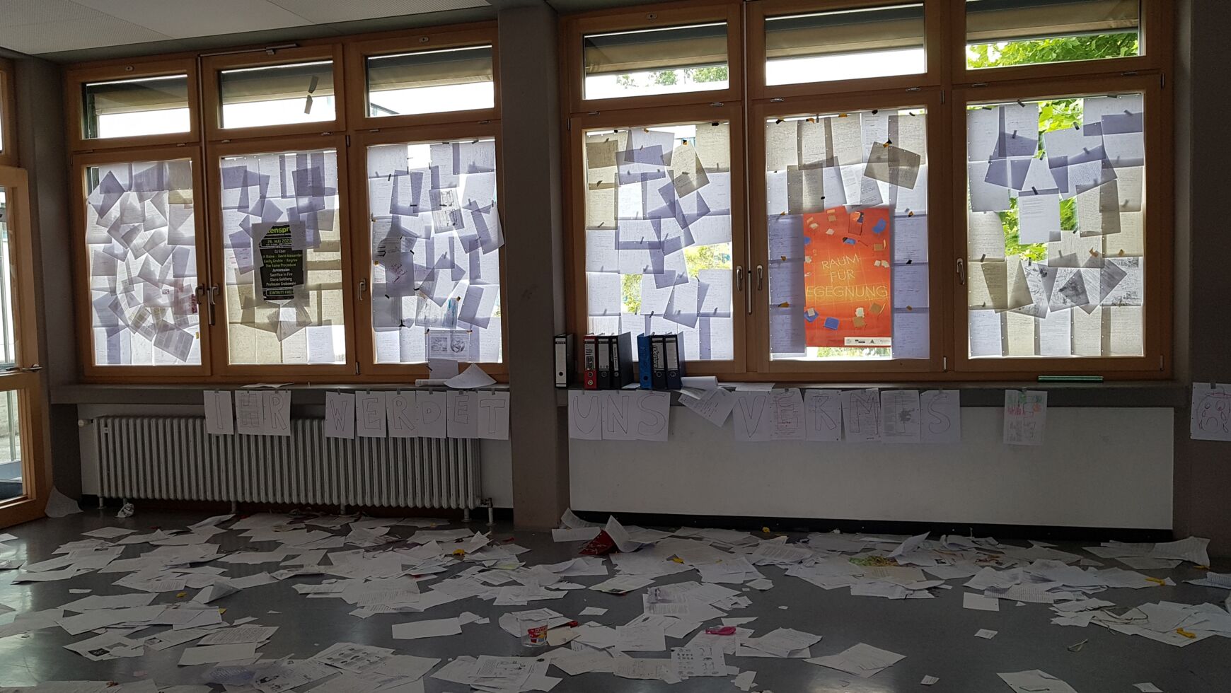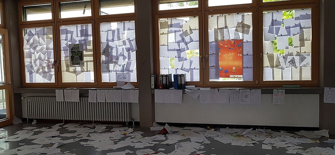 Mit Arbeitsblättern gepflasterte Gänge, vollends zugeklebte Fenster, Treppen mit Hindernissen, mit Klebeband abgeriegelte Lehrerzimmertüren - nicht wenige der Unterstufenschülerinnen und Unterstufenschüler fragten sich, was los ist, als sie am Mittwoch, 22. Juni 22, versuchten die Schule zu betreten - musste doch auch der Abistreich in den letzten Jahren zwangspausieren. Richtig los ging es dann zu Beginn der vierten Stunde, als die Klassen von den Abiturientinnen und Abiturienten und unter Trommelbegleitung auf den Pausenhof geleiteten, wo eine Bühne aufgebaut war.