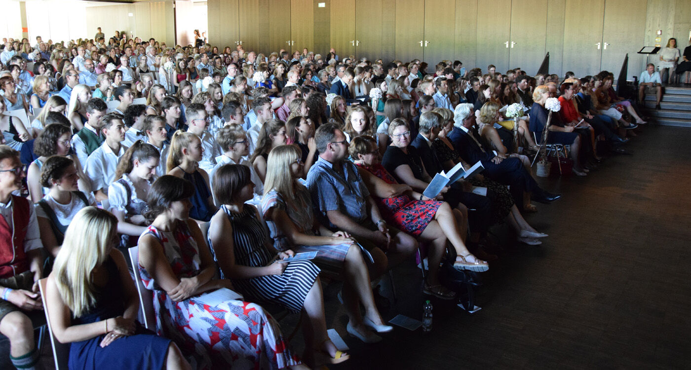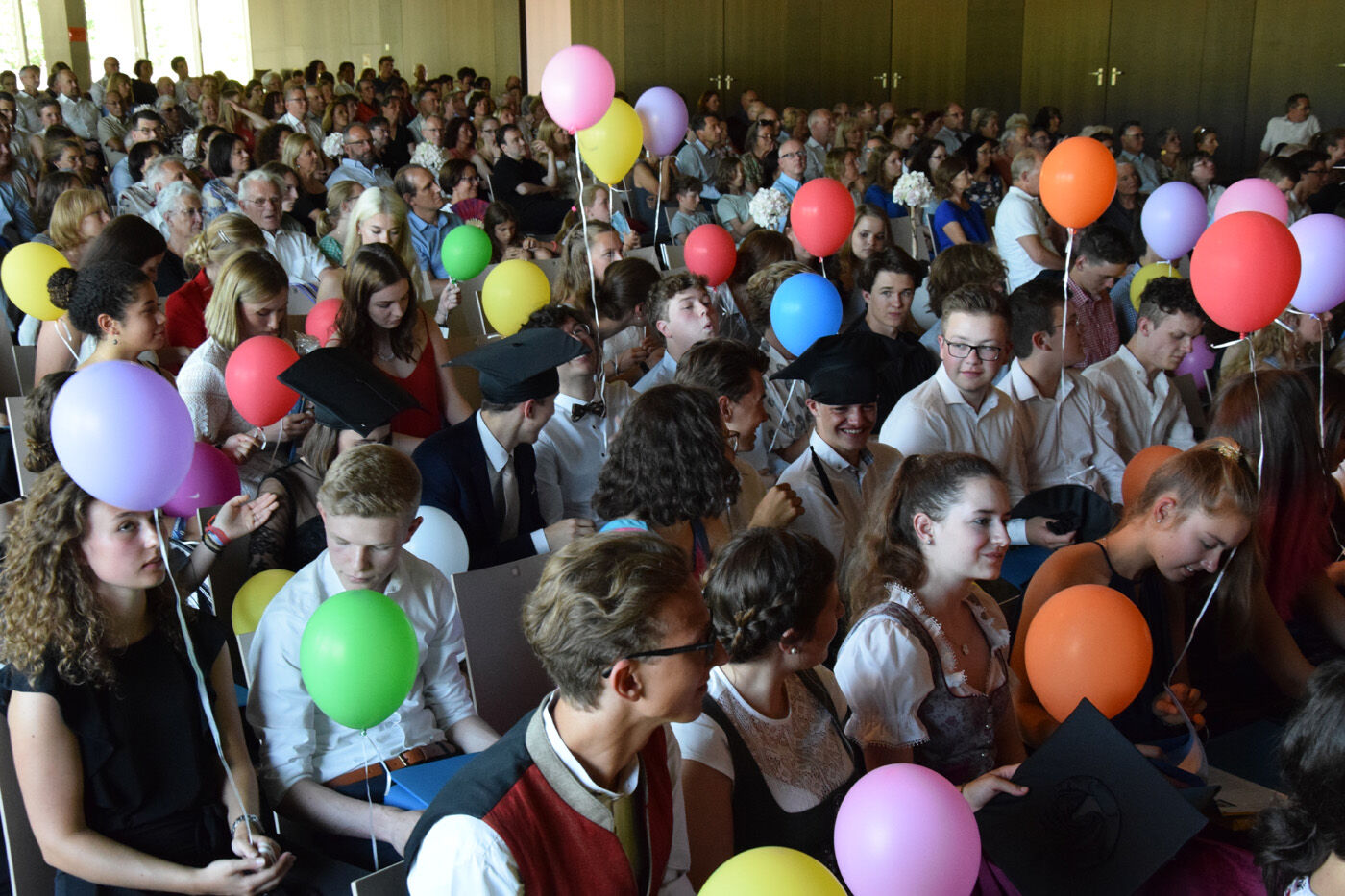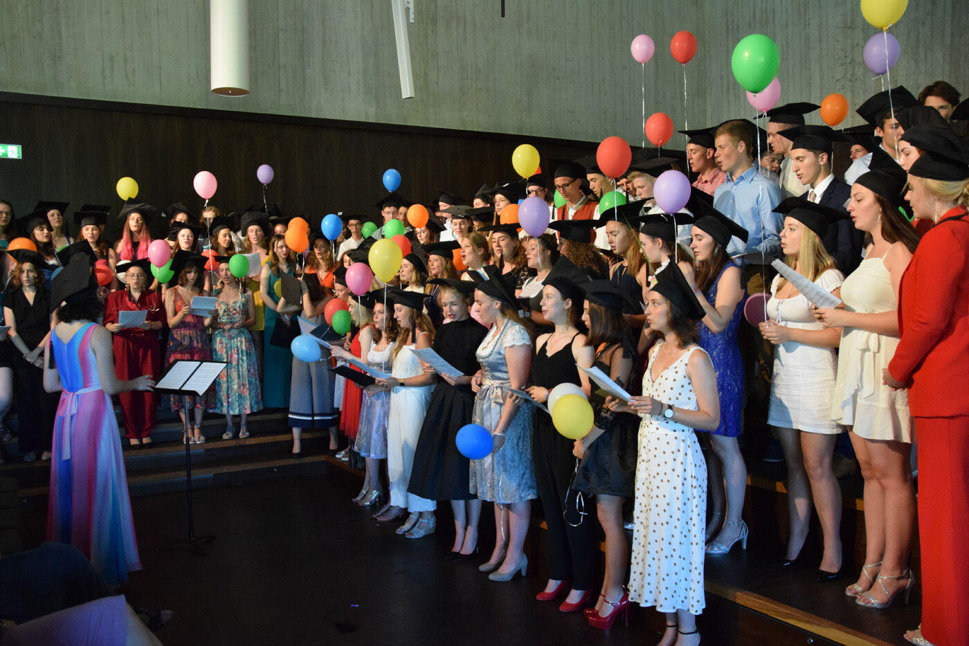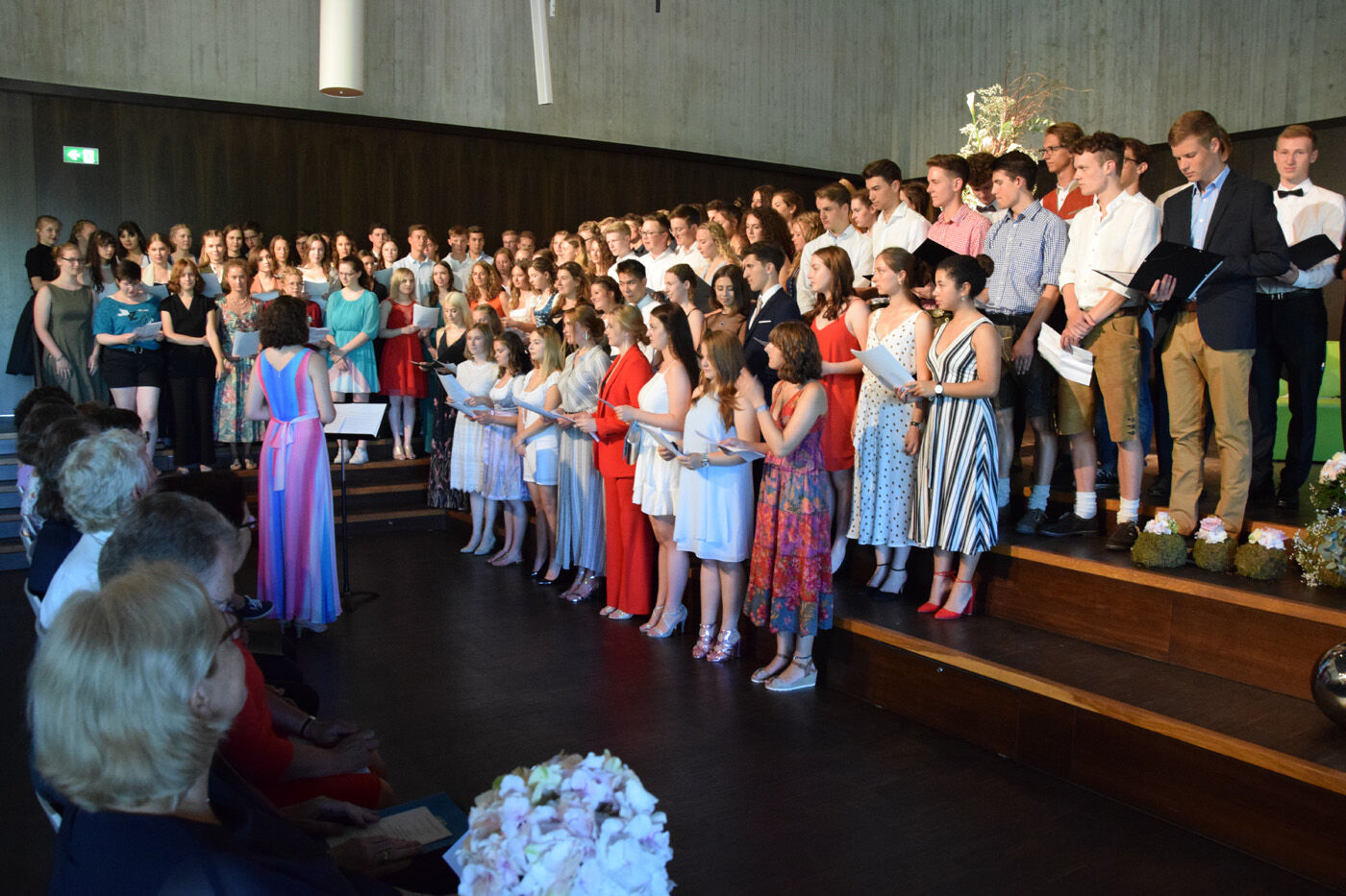 Für die nötige musikalische Umrahmung der Zeugnisvergabe hatte die Absolvia selber gesorgt. Neben dem Abisong von den 99 Luftballons trat das Blechbläserensemble unter der Leitung von Gunther Fendler auf. Cordla Kraetzl und Clara Eglhuber unterhielten mit Scott Joplins „Original Rags“, Matthias Melzer, Rosa Matos Mendoza und Katja Polz mit „I Prelude“ und IV Walzer“ von Dimitri Schostakowitsch und Gabriel Rupp mit der Arie „Brindisi“ von Verdi. Die Absolvia entließ das Publikum mit dem gemeinsamen Lied „Viva La Vida“ von Coldplay. sp