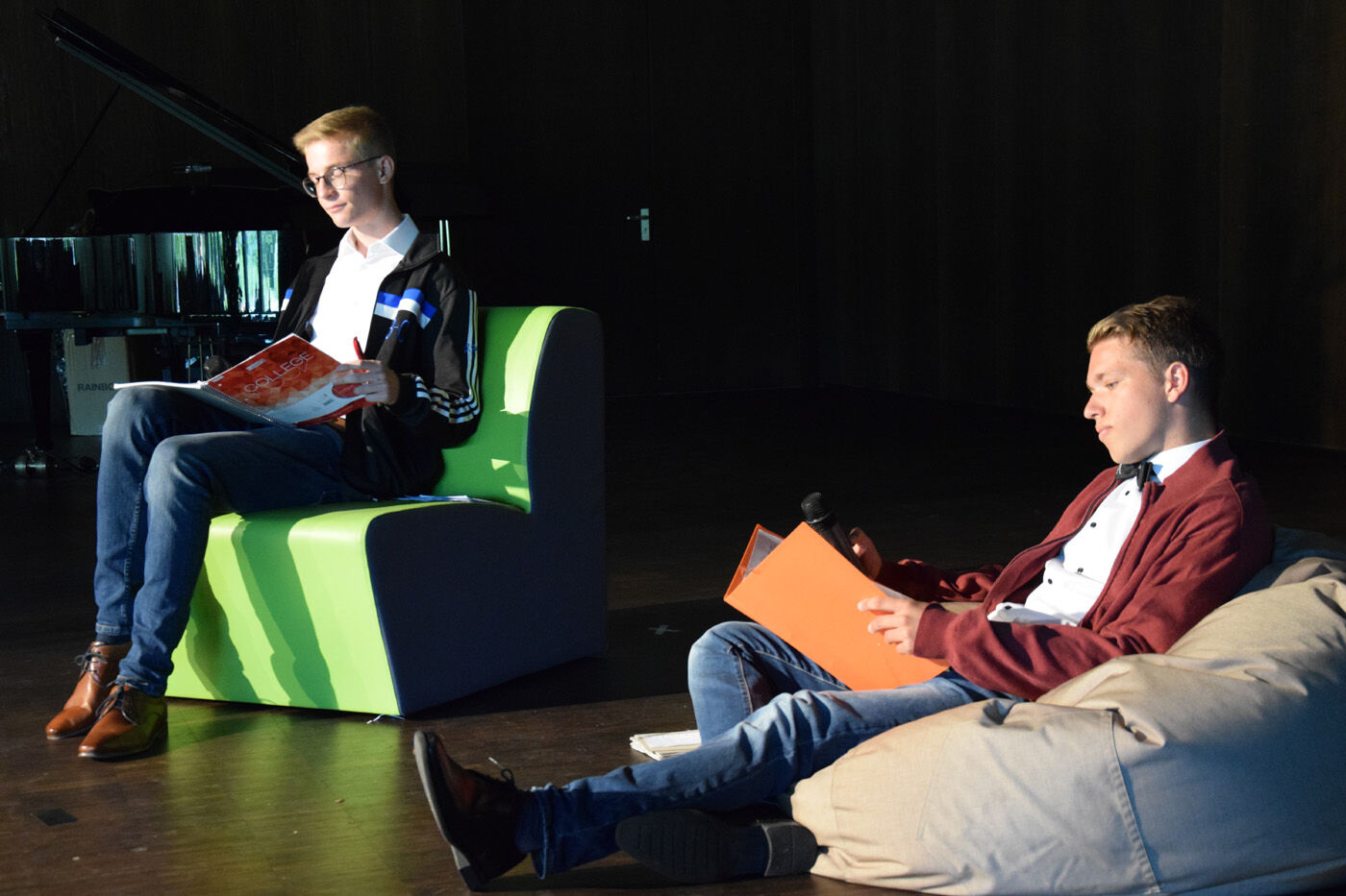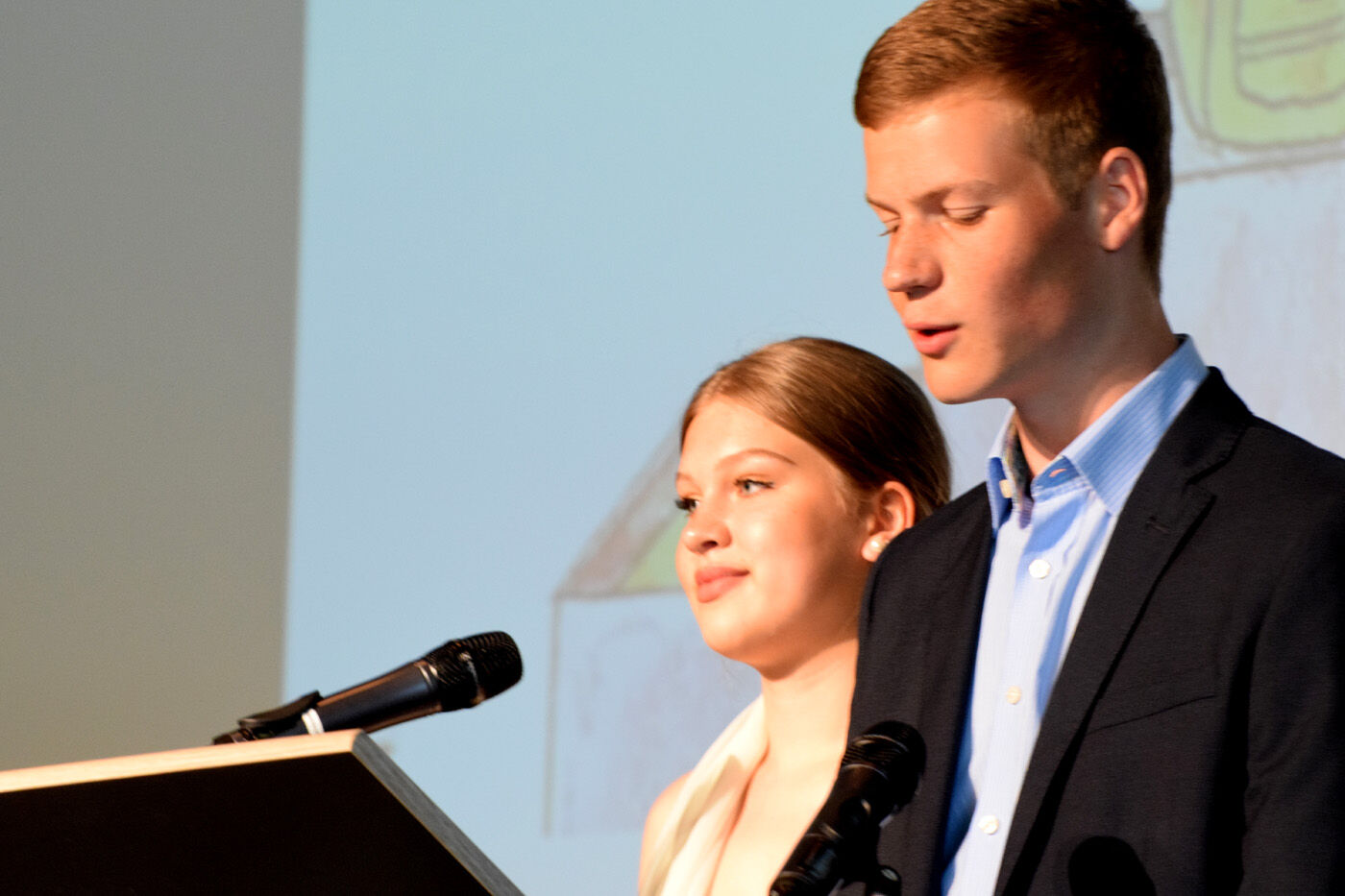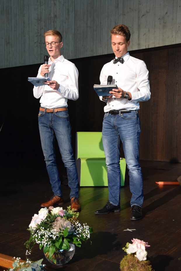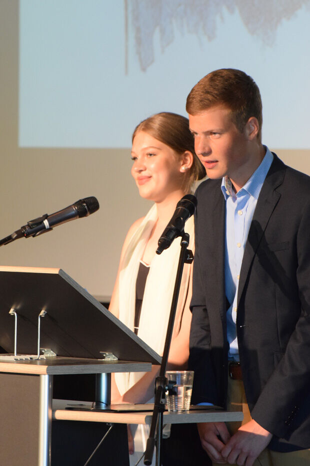 Gekonnt professionell führten die beiden Moderatoren Sebastian Bergsteiner und Benedikt Lühr durch das Programm. In ihrer Begrüßung verglichen sie eine Abiturverabschiedung mit Wagner Opern:Überlänge und dramatischer Ausgang. Das mit der Überlänge traf zu. Dramatisch war der Ausgang nicht. Denn die Abiturientinnen und Abiturienten blickten auf eine schöne Schulzeit zurück. „Wir haben das Cameloher als Schulfamilie erlebt“, so Johanna Gumm und Franz Hanrieder in ihrer Abiturrede. Nur dadurch sei es möglich gewesen, außerhalb des Unterrichts viele Großprojekte zu stemmen wie beispielsweise Offenbachs Operette „Die Banditen“ in diesem Schuljahr. „Wir haben deshalb vom Camerloher mehr mitgenommen als nur Lerninhalte.“ Johanna Gumm und Franz Hanrieder bedankten sich bei allen, die sie in den letzten Jahren auf ihrem Schulweg begleitet haben, vor allem bei ihrer Oberstufenkoordinatorin Silvia Betz für ihr „unglaubliches Engagement“.