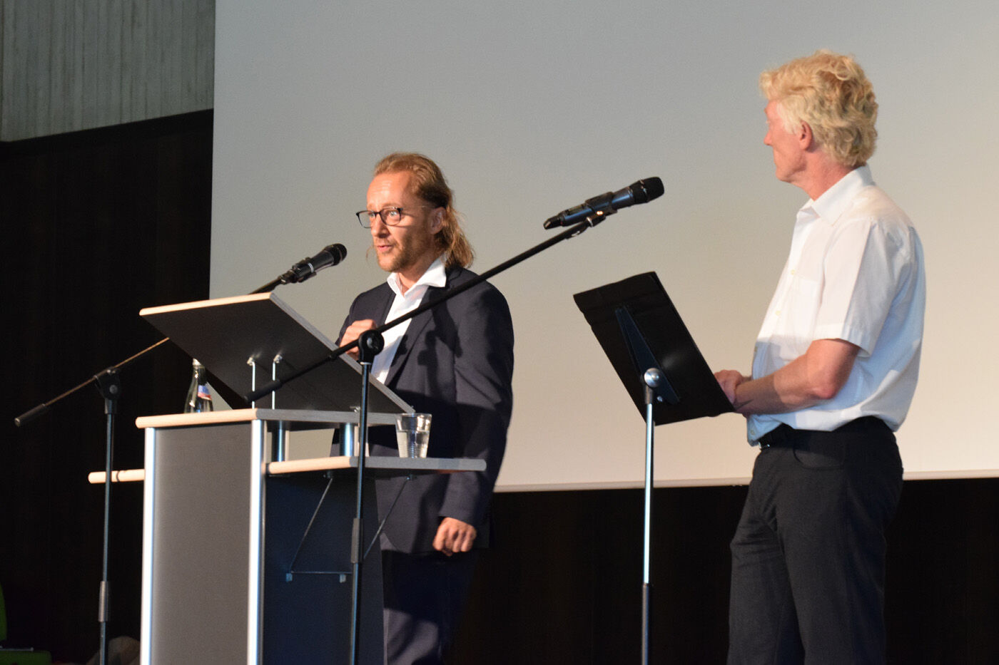 Launisch, pointiert, spritzig und vor allem witzig blickten die beiden Lehrkräfte Jochen Meyer und Martin Wilgruber auf die letzten acht Jahre zurück. Gespickt mit vielen Insidern ernteten sie immer wieder spontanen Beifall. Die beiden Lehrer bauten ihre Rede um den Begriff „Werte“ mit all seinen Nuancen und Schattierungn auf, um ihn zu drehen und zu wenden und so immer wieder für überraschende und witzige Wendungen zu sorgen. „Rettet die Zukunft morgen! Feiert heute!“, so das Ende der Lehrerrede.
