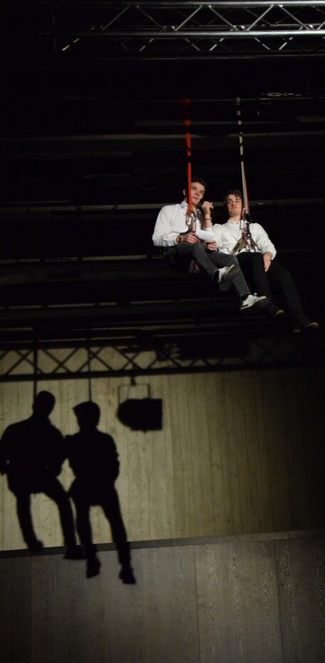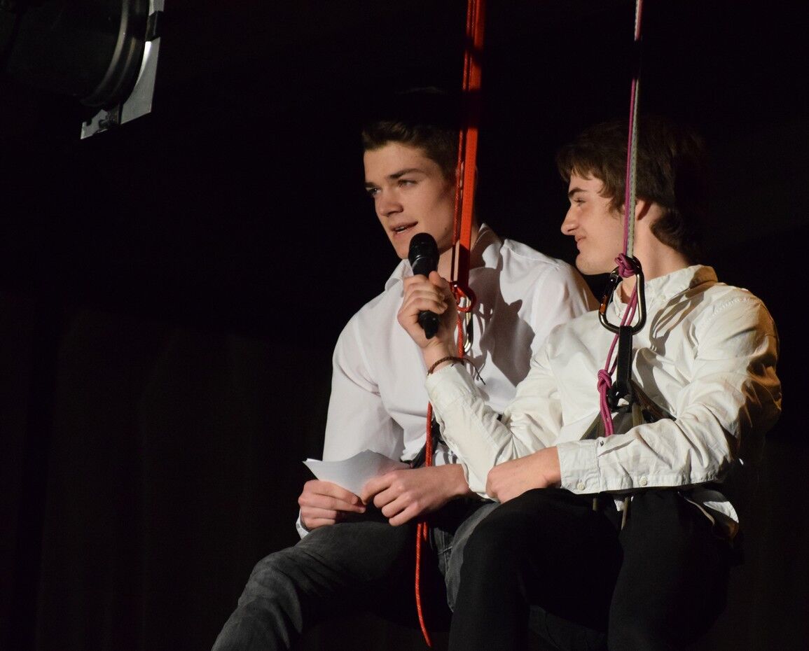 Für Staunen sorgten auch die beiden Moderatoren, Simon Endl und Tim Bäuerle. Die hingen zunächst verdeckt hinter einem schwarzen Tuch an der Bühnen-Decke, machten ihre Anmoderation von oben und schwebten dann sanft auf die Bühne.