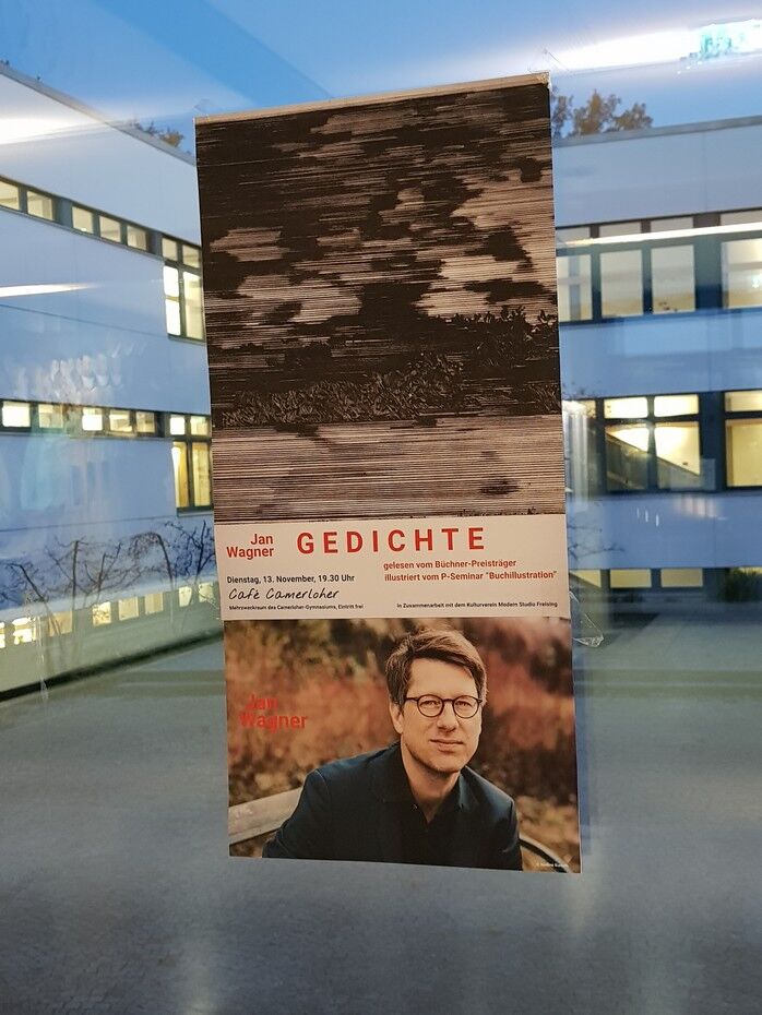 Das P-Seminar „Illustration“ am Camerloher-Gymnasium hat mit dem Kulturverein „Modern Studio“ einen externen Partner, der das Freisinger Kulturleben seit Jahren mit Ausstellungen und Lesungen von hochkarätigen Künstlern und Schriftstellern bereichert. Die 10 Schülerinnen und Schüler des Seminars konnten mehrfach Einblick in die Arbeit des Kulturvereins nehmen, unter anderem bei einem Besuch der Ausstellung von Dirk Steinhöfelim Herbst 2017 im Alten Gefängnis. Nachdem klar war, dass der Kulturverein den bekannten Lyriker und Büchner-Preisträger Jan Wagner für eine Lesung am Camerloher-Gymnasium gewinnen konnte, haben die SchülerInnen die Chance ergriffen und sich über ein Jahr lang, in der 11. und mittlerweile 12. Jahrgangsstufe, intensiv damit beschäftigt, wie es gelingen kann, Jan Wagners Gedichte mit Illustrationen in einen spannungsreichen Dialog zu setzen. Besonders wichtig war es den GestalterInnen des Seminars dabei, sich nicht auf eine simple Doppelung des Gedichtinhalts durch die Bilder zu beschränken, sondern daran zu arbeiten, wie Text und Bild im Sinne einer gegenseitigen Bereicherung einen gemeinsamen poetischen Assoziationsraum eröffnen können. Um eine fundierte Auseinandersetzung zu befördern, holten sich die SchülerInnen Unterstützung aus unterschiedlichen Bereichen. So wurde Jörg Breuer aus der Fachschaft Deutsch in eine Seminarsitzung eingeladen, ebenso wie die Illustratorin Martina Mair.