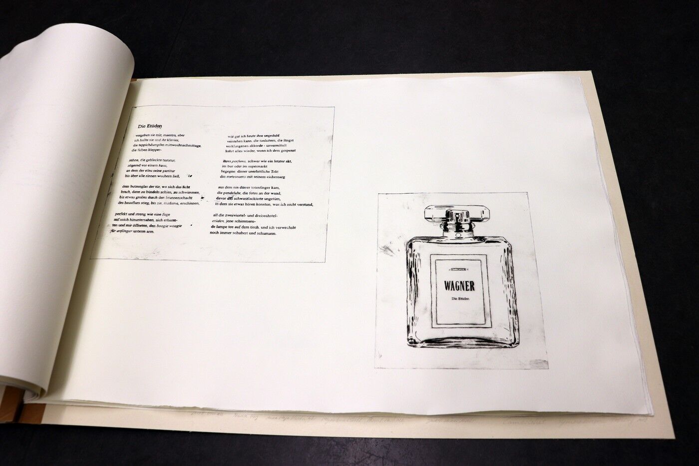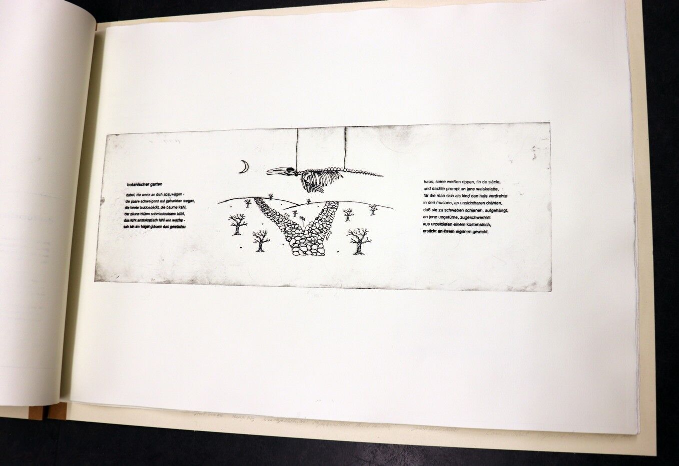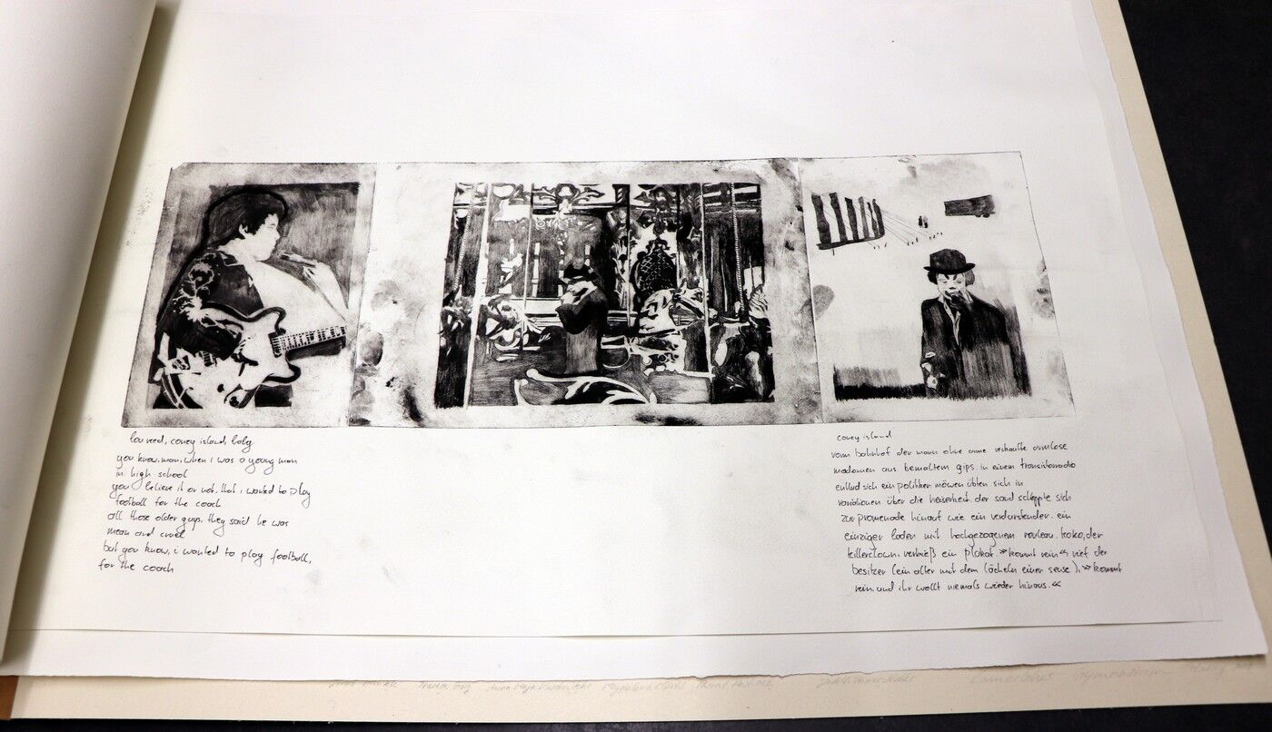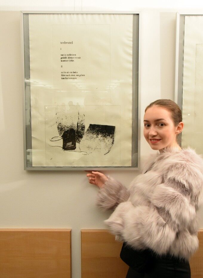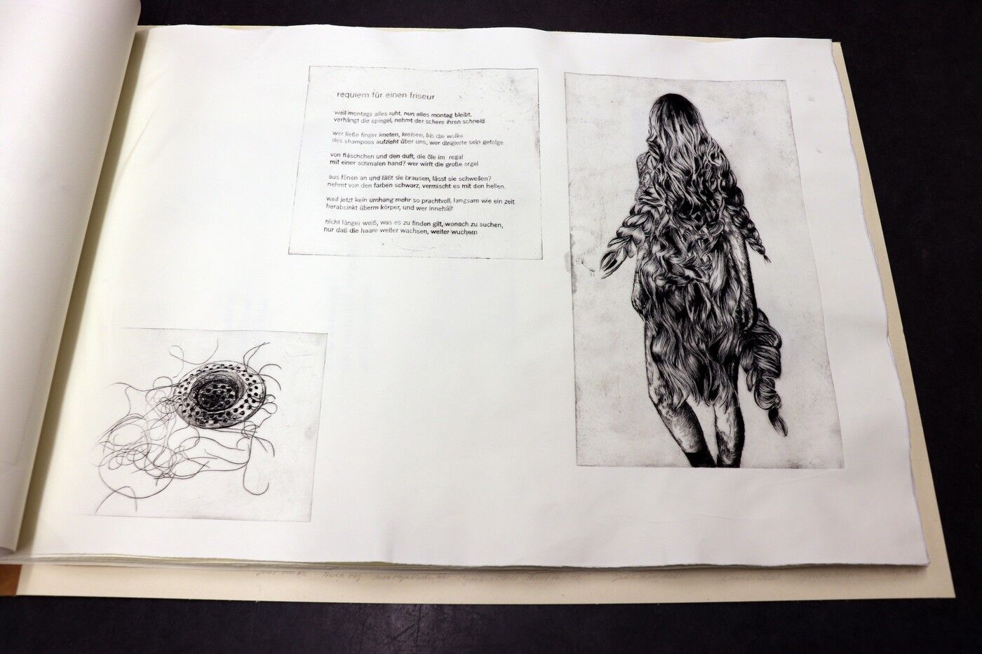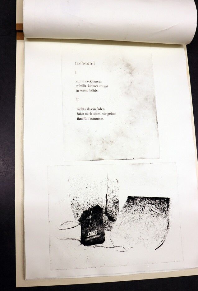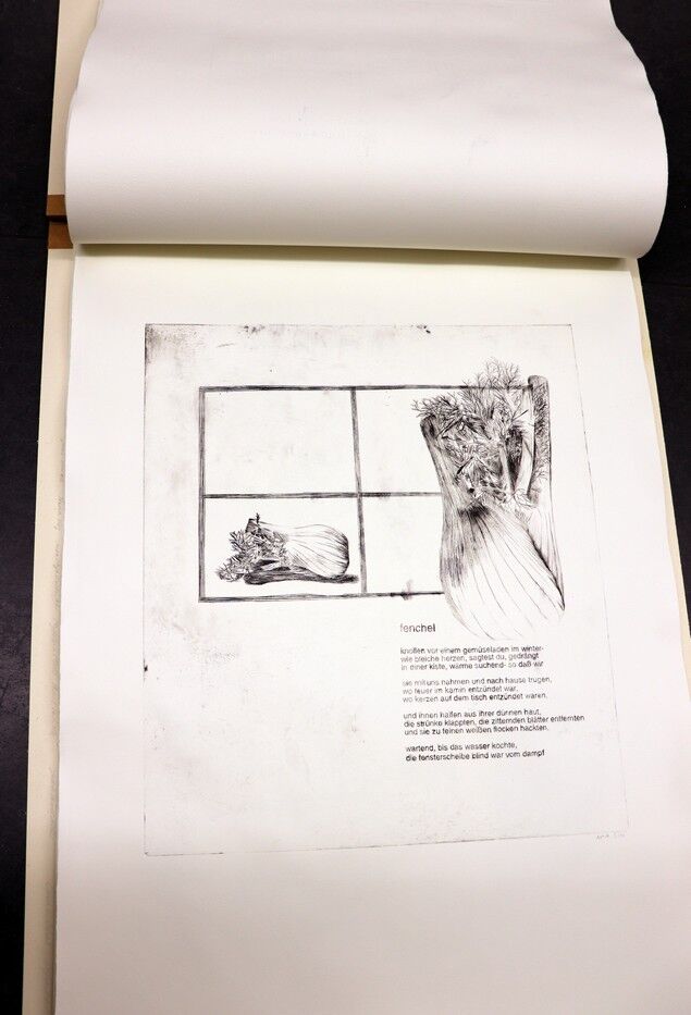 Die Ergebnisse der intensiven gestalterischen und handwerklichen Arbeit sollten natürlich auch öffentlich präsentiert werden. Von Anfang an stand der Gedanke im Raum, die Text-Bild-Kombinationen im Rahmen einer Ausstellung begleitend zu Jan Wagners Lesung im Café Camerloher zu zeigen. Da das Druckverfahren mehrere Abzüge der Grafiken erlaubt, entschloss man sich auch bald, eine kleine Auflage zu produzieren und die Radierungen zu einem Künstlerbuch zu binden, um es dem Autor nach der Lesung überreichen zu können.