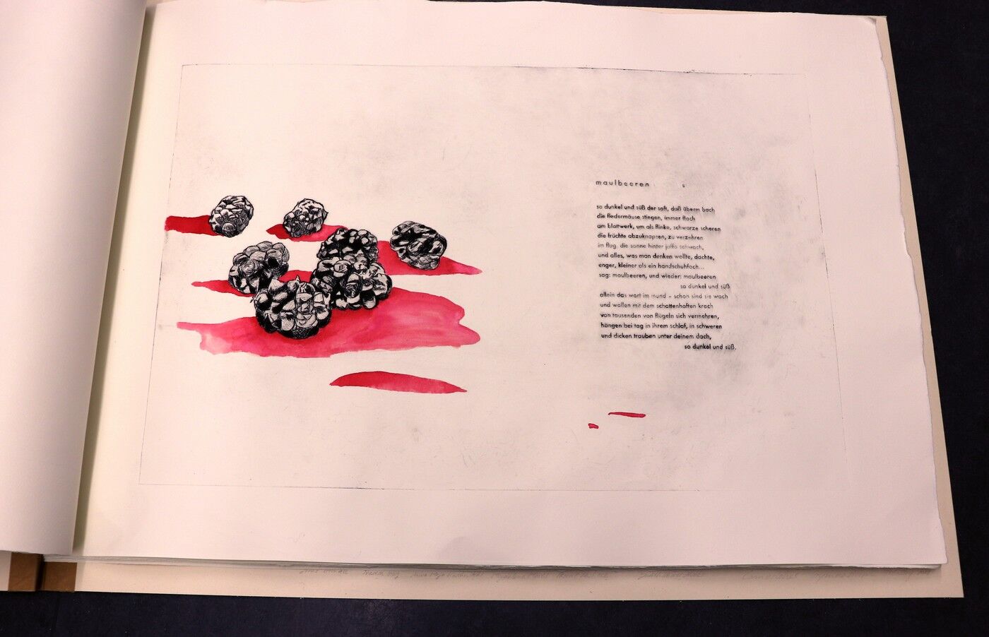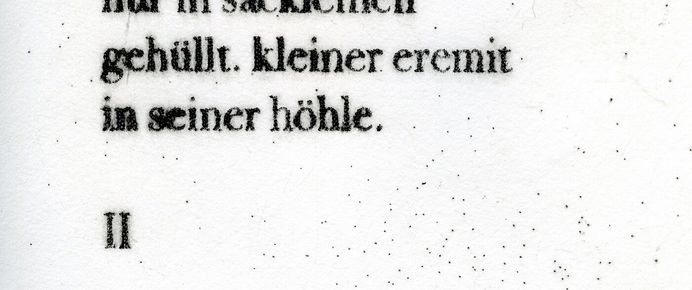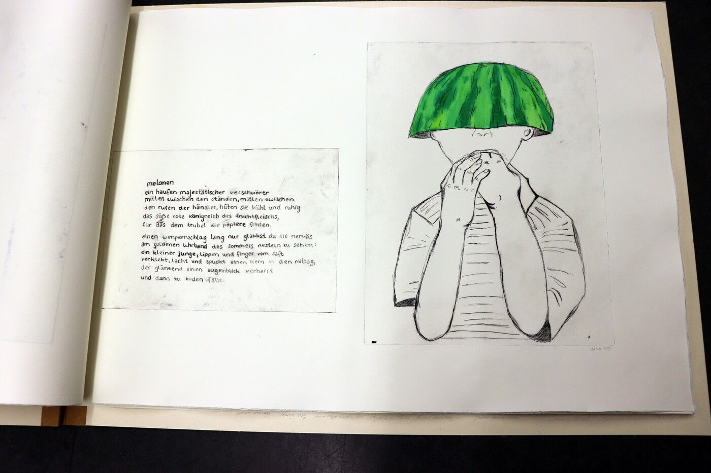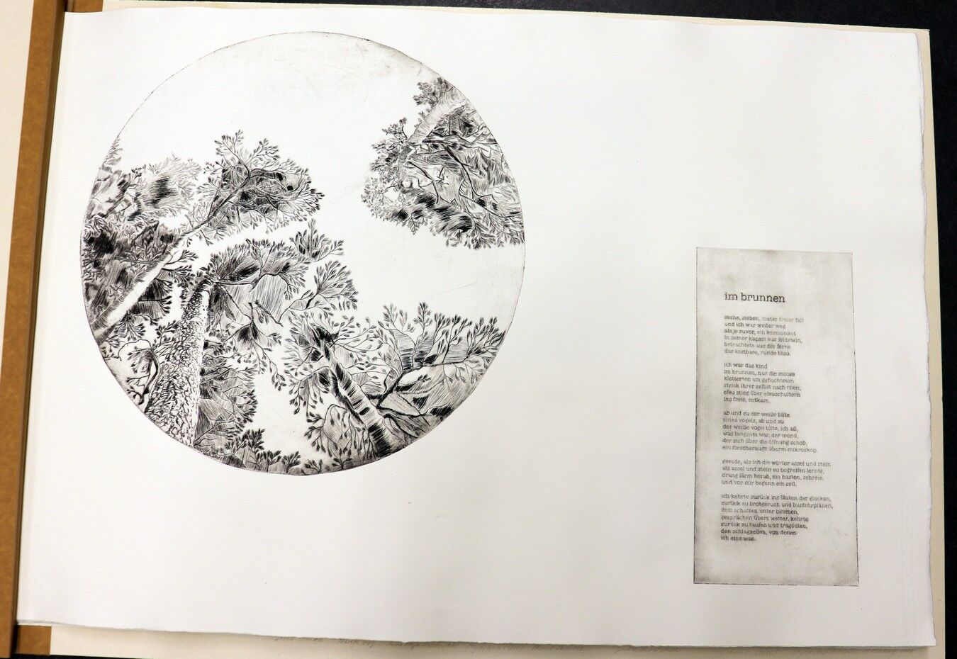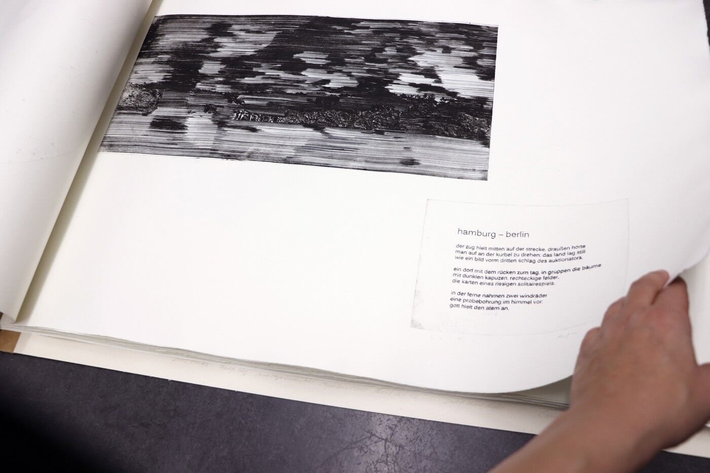 Die Ergebnisse der intensiven gestalterischen und handwerklichen Arbeit sollten natürlich auch öffentlich präsentiert werden. Von Anfang an stand der Gedanke im Raum, die Text-Bild-Kombinationen im Rahmen einer Ausstellung begleitend zu Jan Wagners Lesung im Café Camerloher zu zeigen. Da das Druckverfahren mehrere Abzüge der Grafiken erlaubt, entschloss man sich auch bald, eine kleine Auflage zu produzieren und die Radierungen zu einem Künstlerbuch zu binden, um es dem Autor nach der Lesung überreichen zu können.