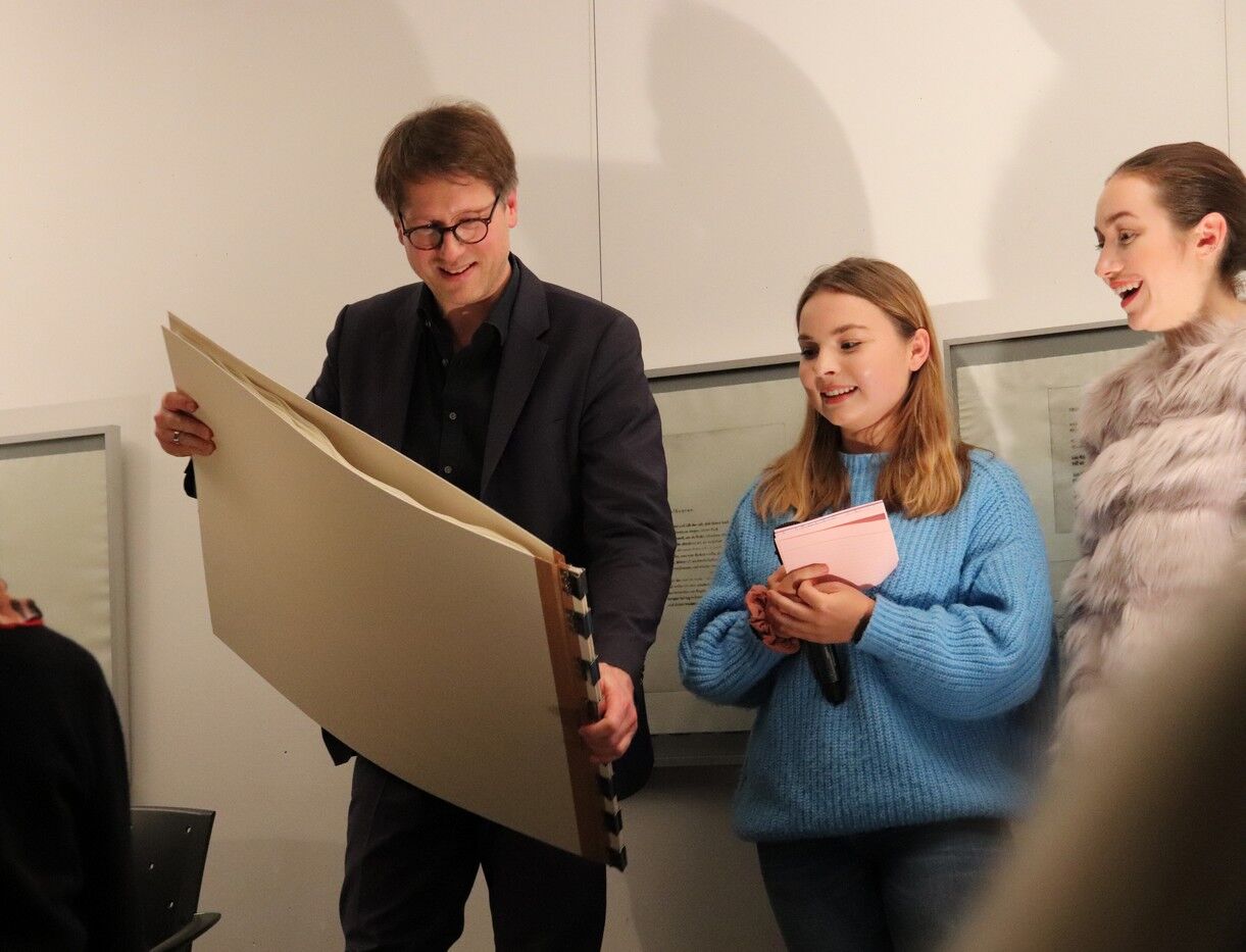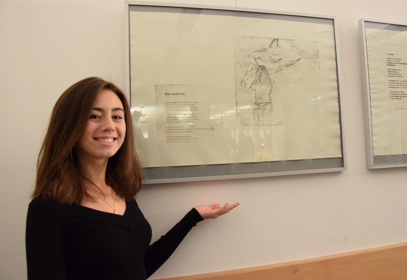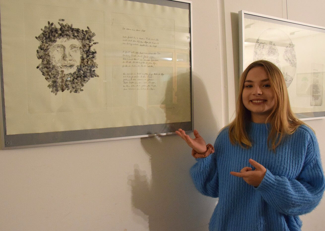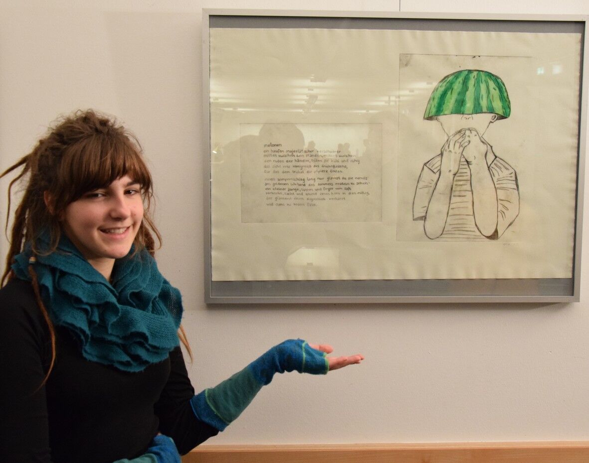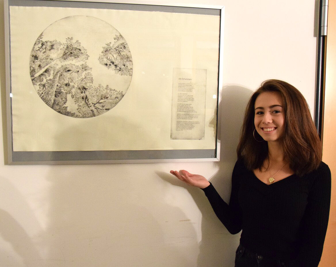 Dieses wies schließlich eine so stattliche Größe auf, dass die Übergabe des Geschenks nach der Lesung am Abend des 13. November fast performativen Charakter bekam. Jan Wagner zeigte sich sehr angetan von den Illustrationen und freute sich, diese in seinem Buch zu Hause auch in Ruhe betrachten zu können. Für die IllustratorInnen der Q12 stellte die Ausstellung im Café Camerloher einen gelungenen Höhepunkt nach der langen Arbeitsphase dar. Die P-SeminarteilnehmerInnen bekamen vor und nach der Lesung viel positive Rückmeldung. Beeindruckt zeigte sich das Publikum von der künstlerischen Qualität der Grafiken. Aber auch die Tiefe der inhaltlichen Auseinandersetzung wurde immer wieder angesprochen, spürbar in den fertigen Drucken, aber auch in den Portfolios, die in Vitrinen zu sehen waren und Einblick gaben in den Entwicklungs- und Entstehungsprozess der Arbeiten.