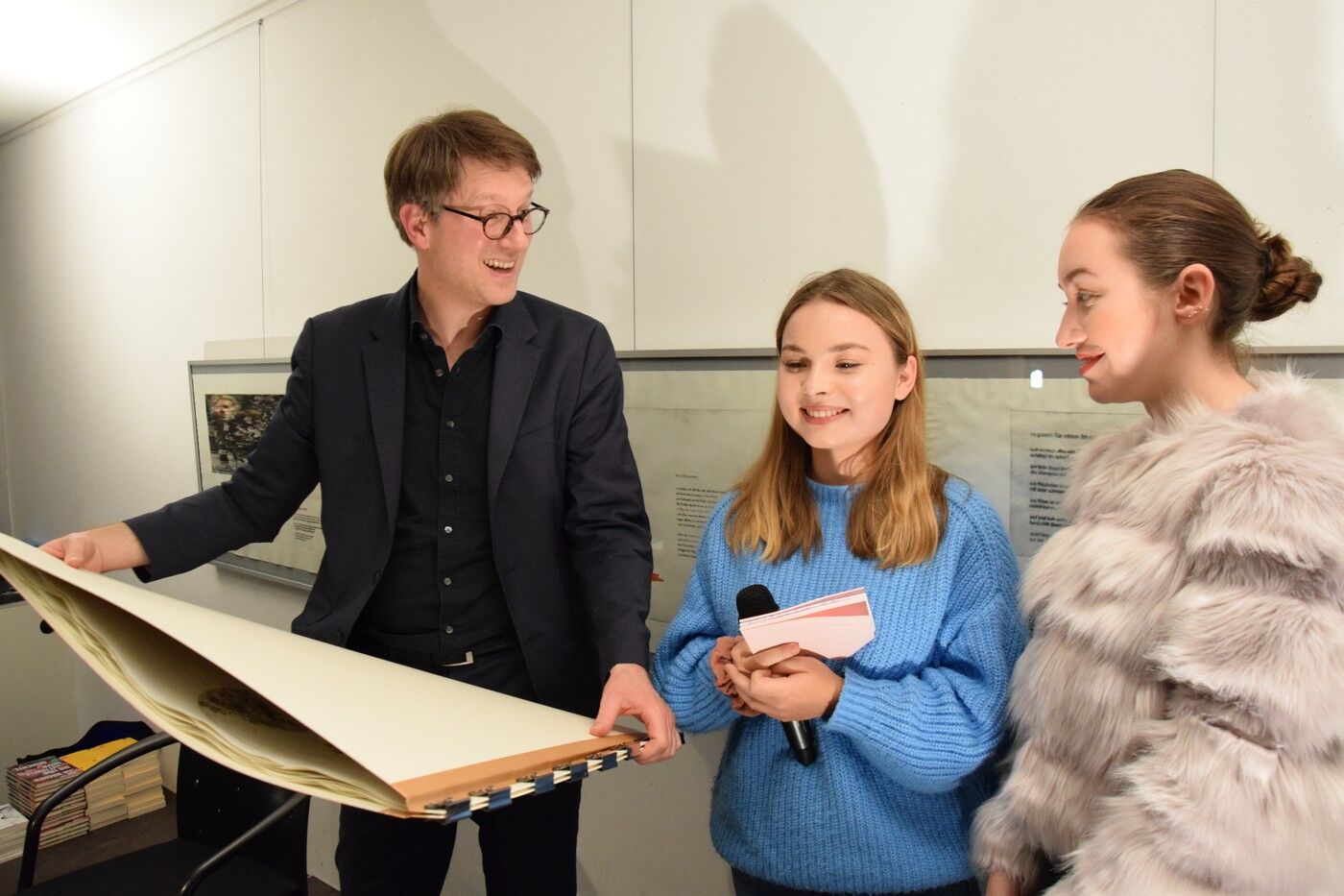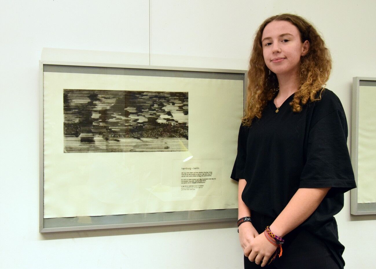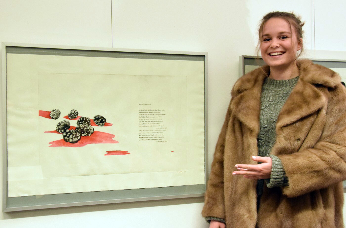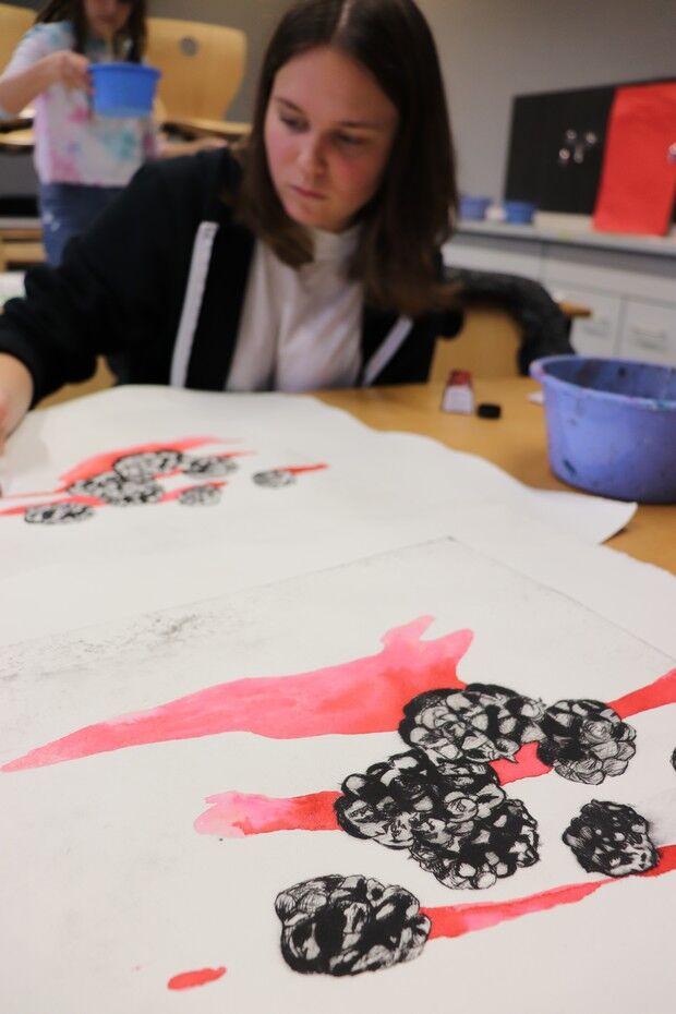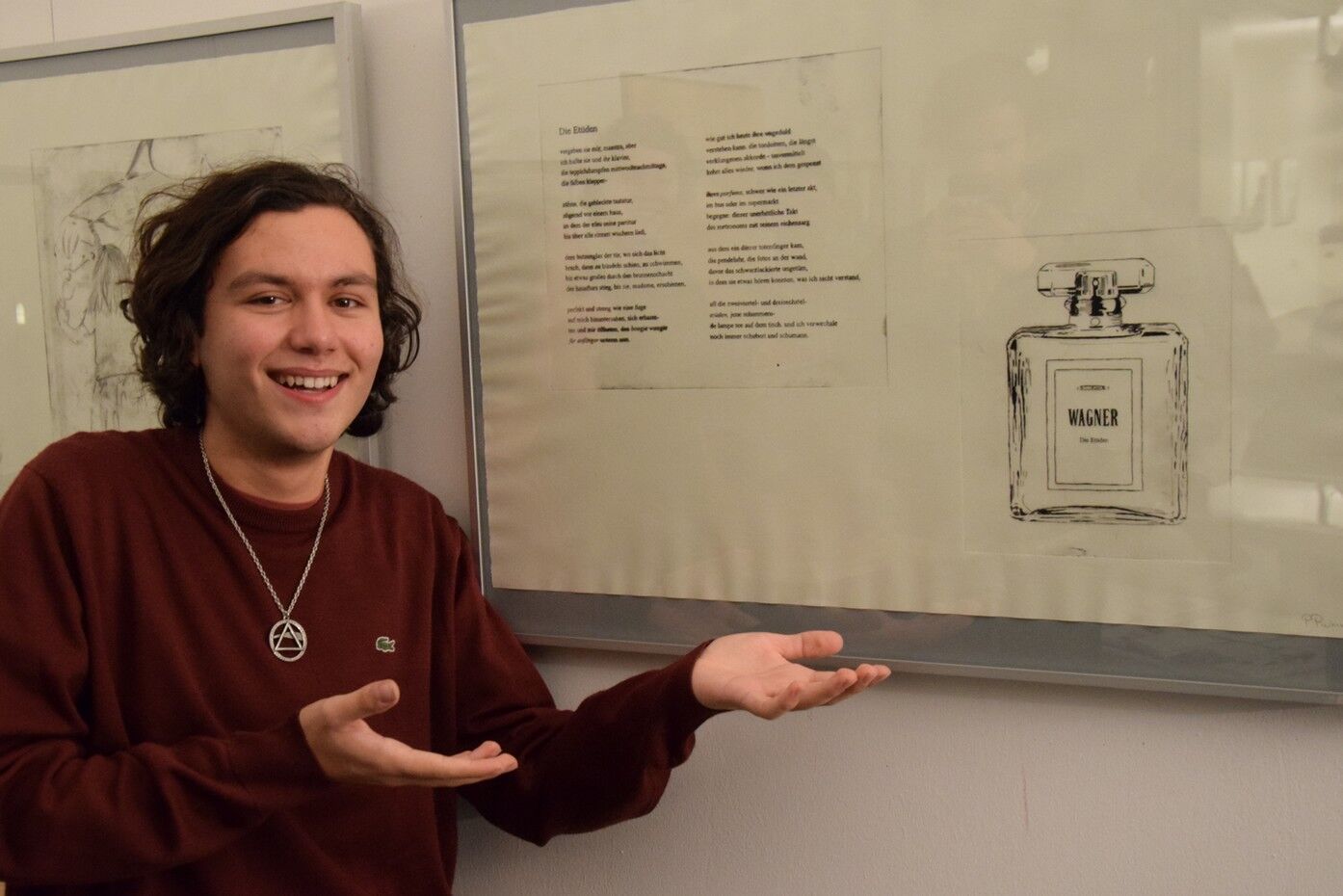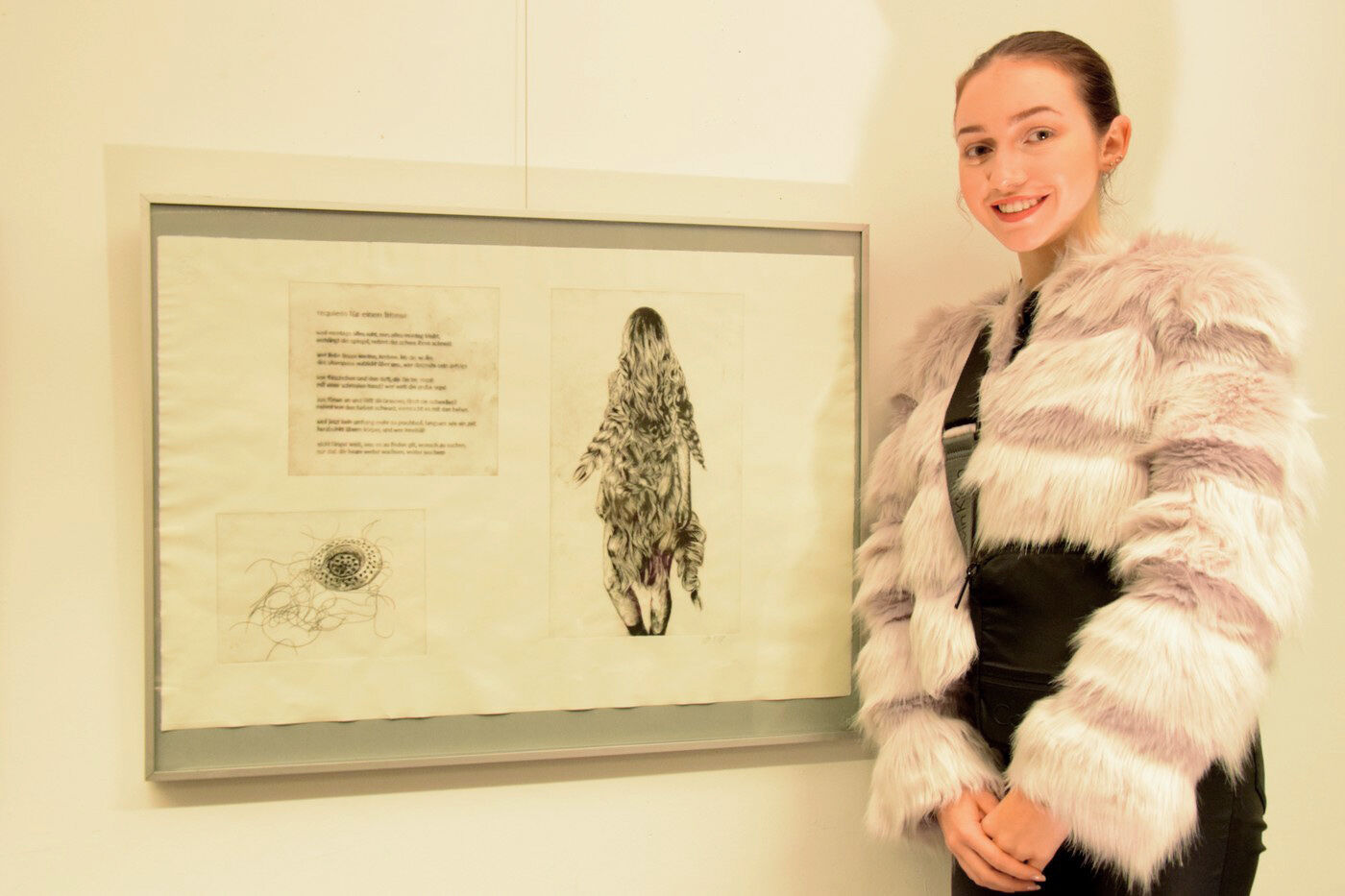 Dieses wies schließlich eine so stattliche Größe auf, dass die Übergabe des Geschenks nach der Lesung am Abend des 13. November fast performativen Charakter bekam. Jan Wagner zeigte sich sehr angetan von den Illustrationen und freute sich, diese in seinem Buch zu Hause auch in Ruhe betrachten zu können. Für die IllustratorInnen der Q12 stellte die Ausstellung im Café Camerloher einen gelungenen Höhepunkt nach der langen Arbeitsphase dar. Die P-SeminarteilnehmerInnen bekamen vor und nach der Lesung viel positive Rückmeldung. Beeindruckt zeigte sich das Publikum von der künstlerischen Qualität der Grafiken. Aber auch die Tiefe der inhaltlichen Auseinandersetzung wurde immer wieder angesprochen, spürbar in den fertigen Drucken, aber auch in den Portfolios, die in Vitrinen zu sehen waren und Einblick gaben in den Entwicklungs- und Entstehungsprozess der Arbeiten.