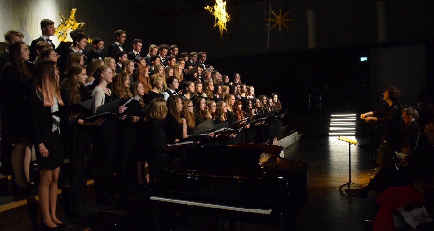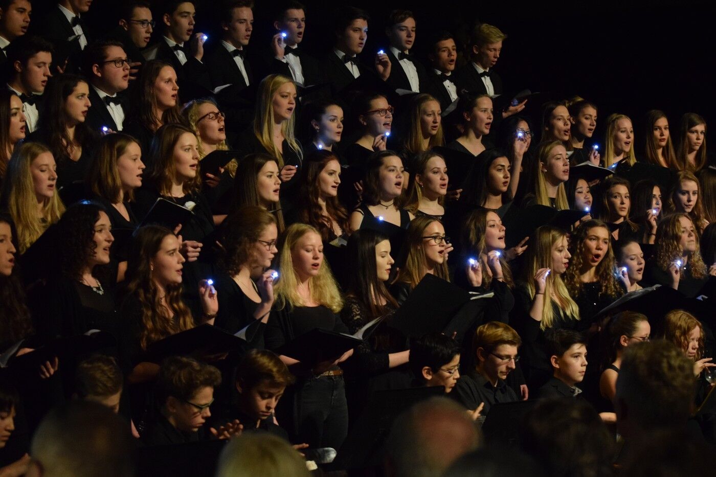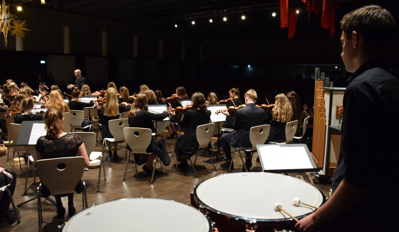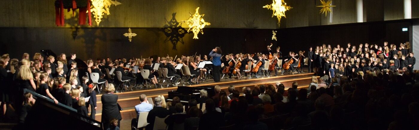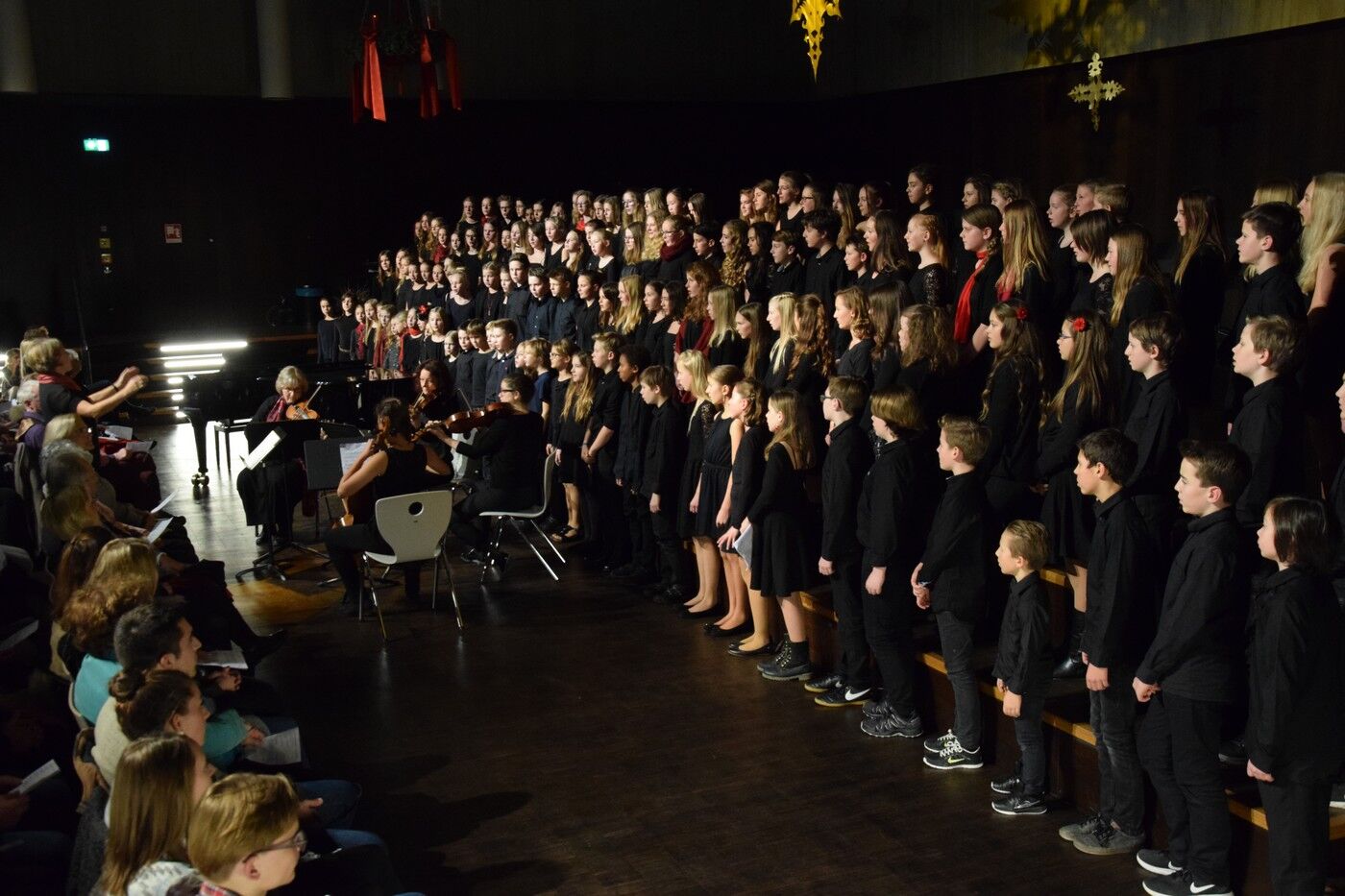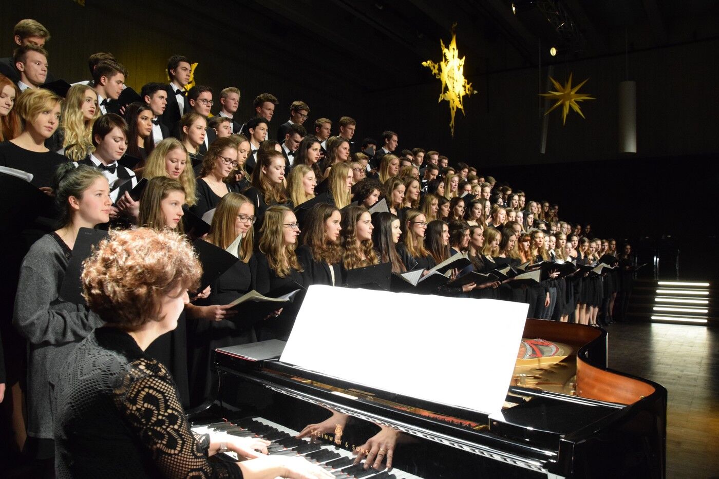 Beim Konzert der „Großen“ hatten die Schülerinnen und Schüler der Jahrgangsstufen neun bis zwölf ebenfalls ein abwechslungsreiches und stimmungsvolles Programm einstudiert und sorgten damit ebenfalls für einen lang anhaltenden Schlussapplaus der über 800 Zuhörerinnen und Zuhörer. Das Sinfonieorchester brillierte beispielsweise mit Gabirel Faurés „Elegie für Solovioloncello und Sinfonieorchester, das Holzbläserensemble mit Astor Piazollas „Oblivion“, das Blechbläserensemble mit Johann Sebastian Bachs „Jesus bleibet meine Freude“, der Mittelstufenchor mit Paul Edwards „Nos mall wonder“ oder das Vokalensemble mit Johann Sebastian Bachs „Wie schön leuchtet der Morgenstern“. Einer der Höhepunkte war sicherlich Erik Esenvalds „Stars“, präsentiert vom Oberstufenchor und begleitet von der Klasse 8a an der Glasharfe. Mit dem „Gloria!“ von Carole Steophens verabschiedete der Große Chor die Zuhörer.
