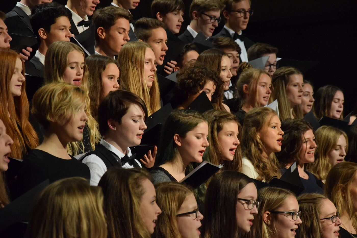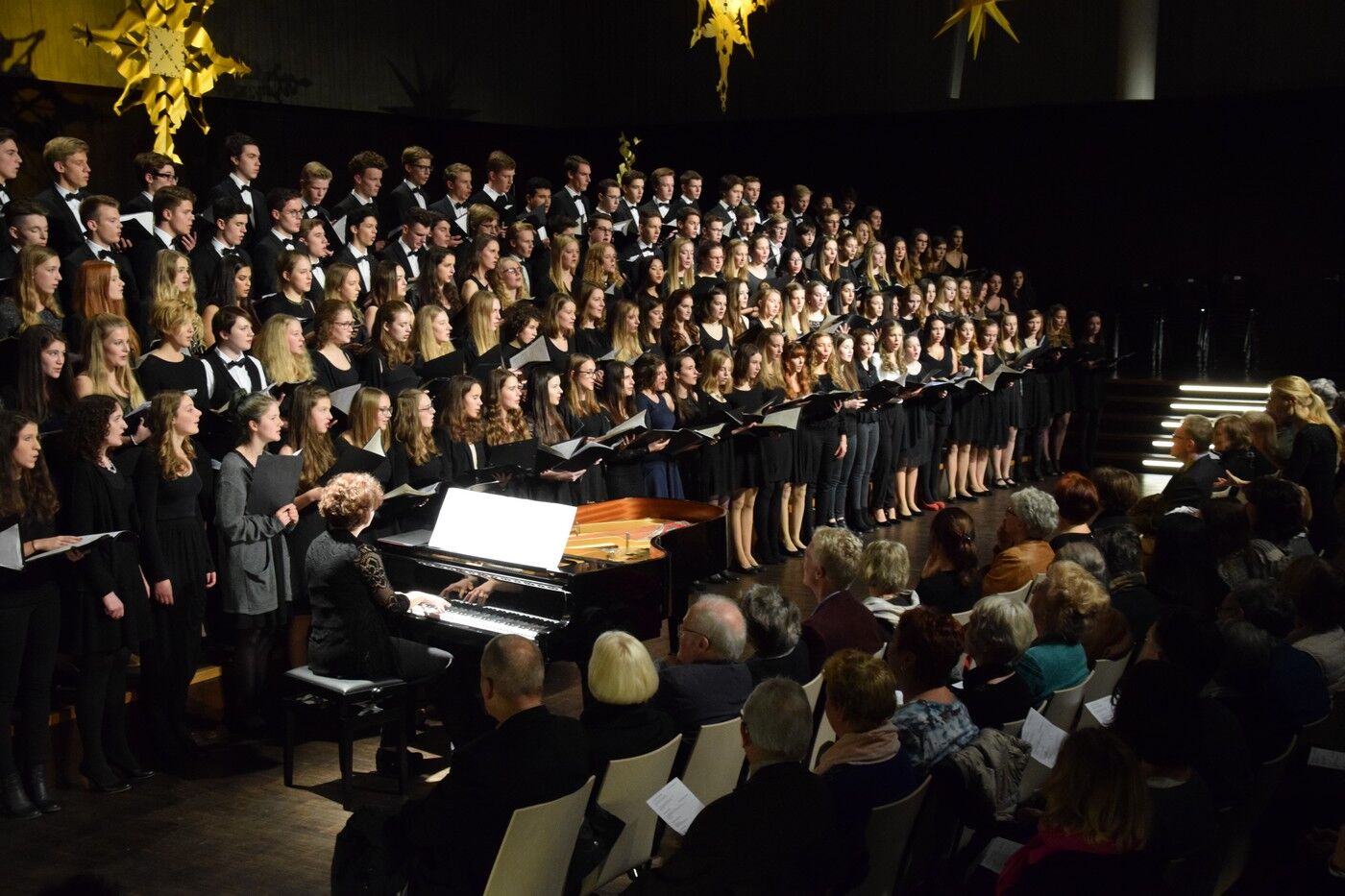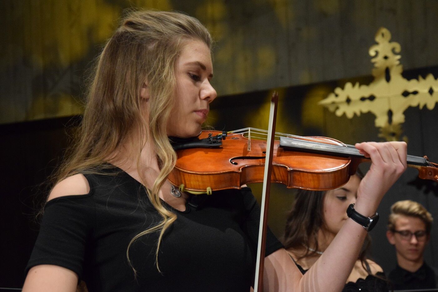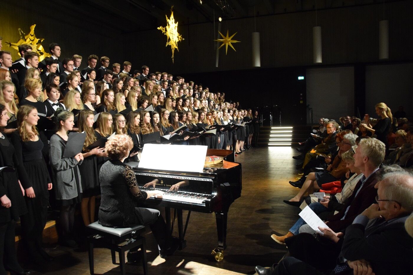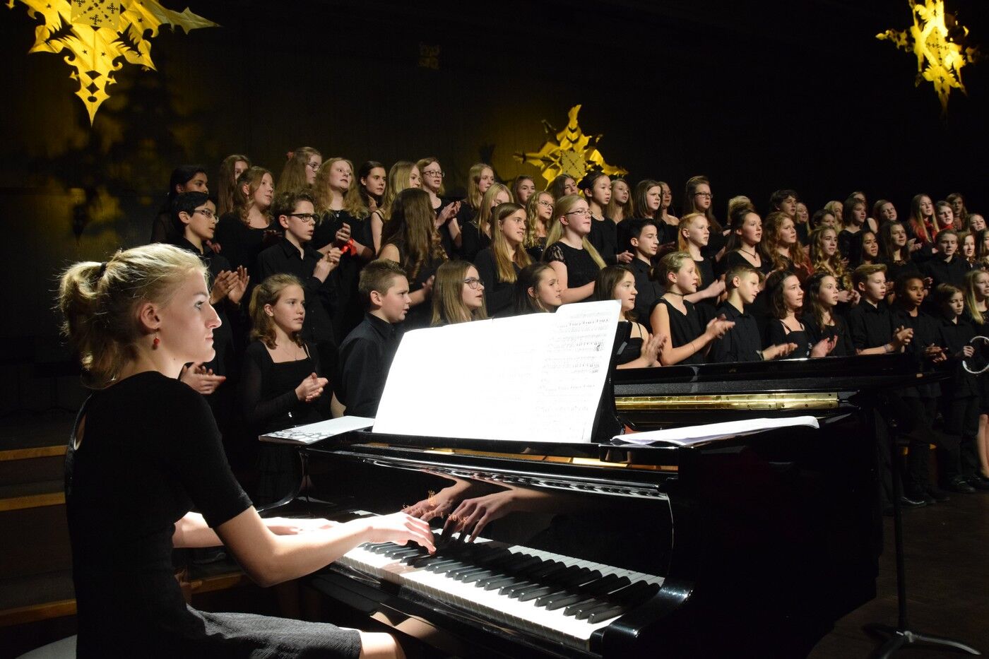 Beim Konzert der „Großen“ hatten die Schülerinnen und Schüler der Jahrgangsstufen neun bis zwölf ebenfalls ein abwechslungsreiches und stimmungsvolles Programm einstudiert und sorgten damit ebenfalls für einen lang anhaltenden Schlussapplaus der über 800 Zuhörerinnen und Zuhörer. Das Sinfonieorchester brillierte beispielsweise mit Gabirel Faurés „Elegie für Solovioloncello und Sinfonieorchester, das Holzbläserensemble mit Astor Piazollas „Oblivion“, das Blechbläserensemble mit Johann Sebastian Bachs „Jesus bleibet meine Freude“, der Mittelstufenchor mit Paul Edwards „Nos mall wonder“ oder das Vokalensemble mit Johann Sebastian Bachs „Wie schön leuchtet der Morgenstern“. Einer der Höhepunkte war sicherlich Erik Esenvalds „Stars“, präsentiert vom Oberstufenchor und begleitet von der Klasse 8a an der Glasharfe. Mit dem „Gloria!“ von Carole Steophens verabschiedete der Große Chor die Zuhörer.