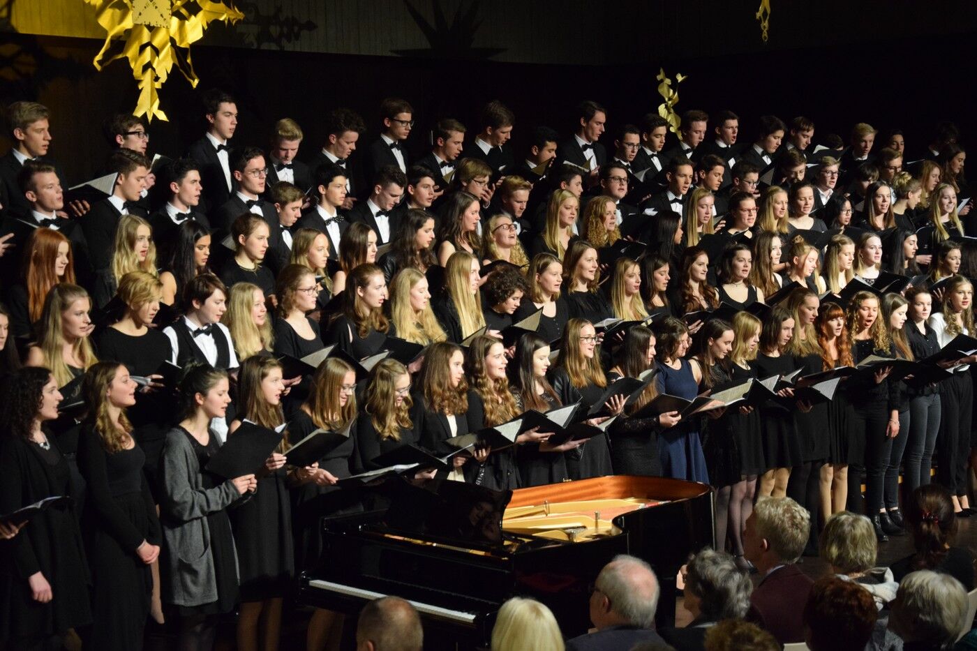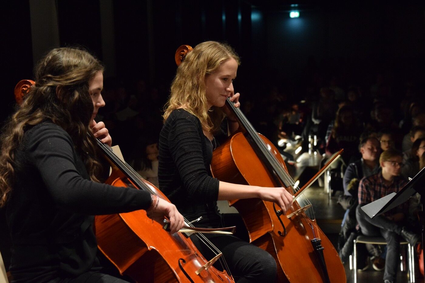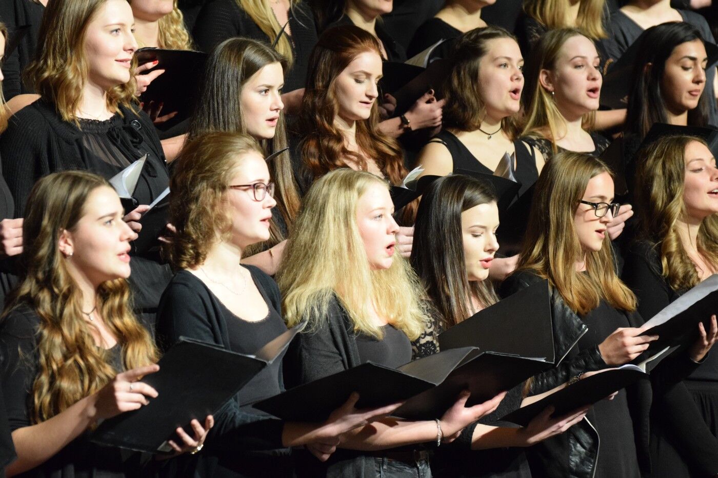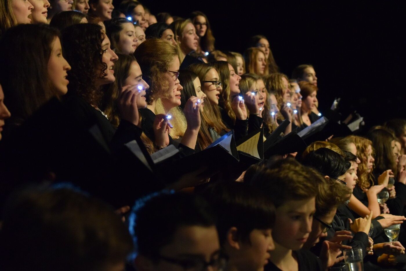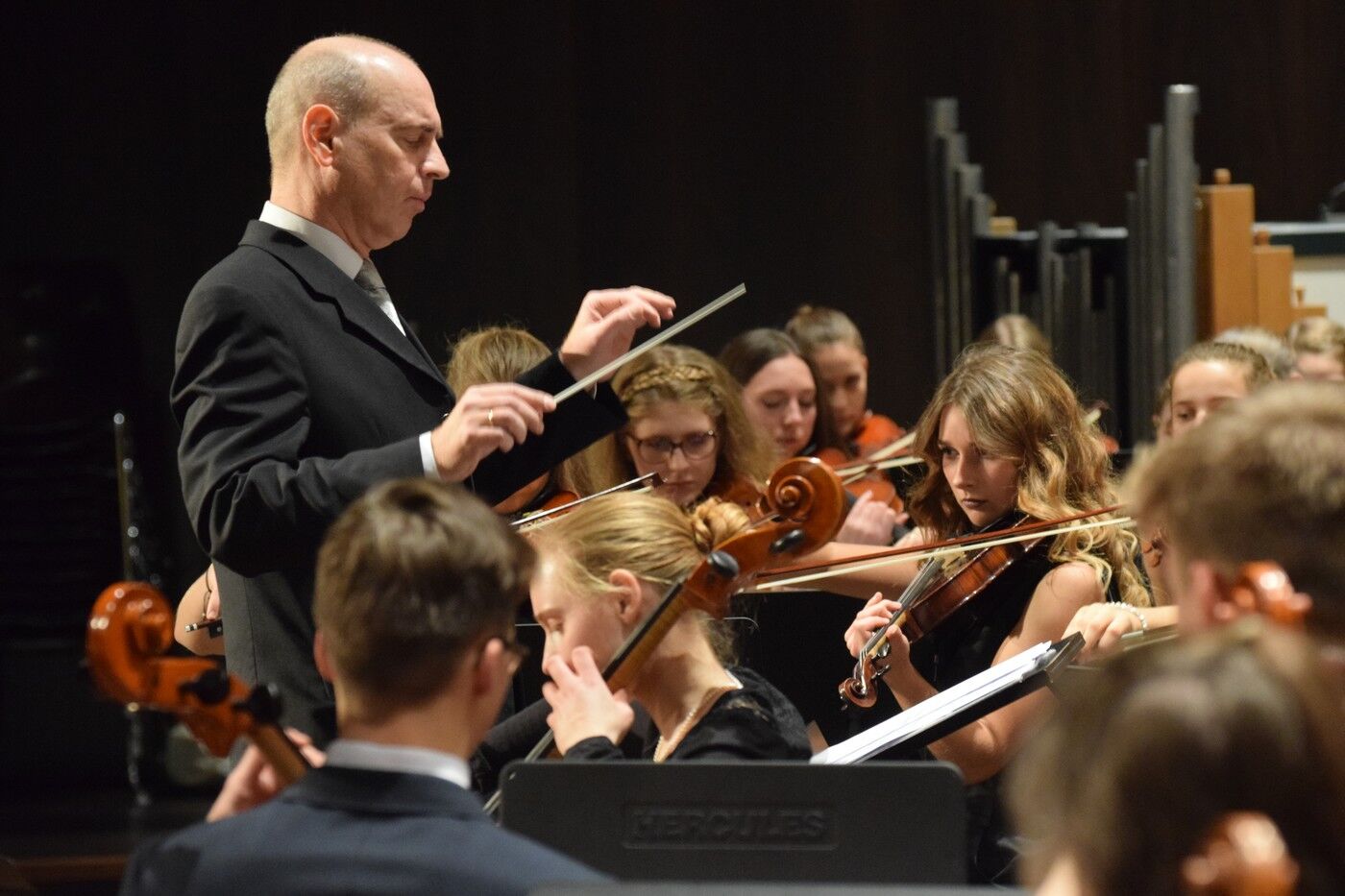 Beim Konzert der „Großen“ hatten die Schülerinnen und Schüler der Jahrgangsstufen neun bis zwölf ebenfalls ein abwechslungsreiches und stimmungsvolles Programm einstudiert und sorgten damit ebenfalls für einen lang anhaltenden Schlussapplaus der über 800 Zuhörerinnen und Zuhörer. Das Sinfonieorchester brillierte beispielsweise mit Gabirel Faurés „Elegie für Solovioloncello und Sinfonieorchester, das Holzbläserensemble mit Astor Piazollas „Oblivion“, das Blechbläserensemble mit Johann Sebastian Bachs „Jesus bleibet meine Freude“, der Mittelstufenchor mit Paul Edwards „Nos mall wonder“ oder das Vokalensemble mit Johann Sebastian Bachs „Wie schön leuchtet der Morgenstern“. Einer der Höhepunkte war sicherlich Erik Esenvalds „Stars“, präsentiert vom Oberstufenchor und begleitet von der Klasse 8a an der Glasharfe. Mit dem „Gloria!“ von Carole Steophens verabschiedete der Große Chor die Zuhörer.