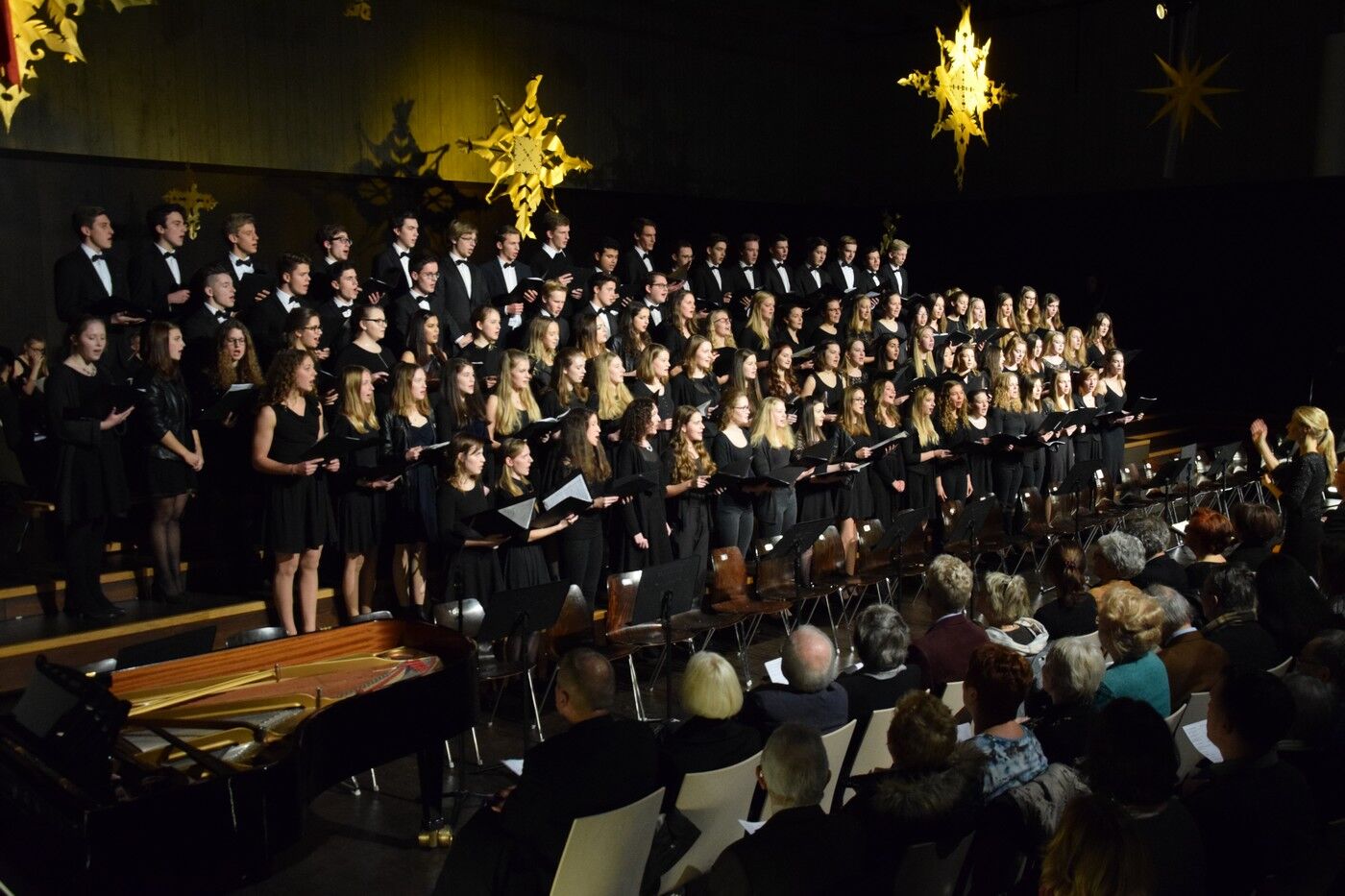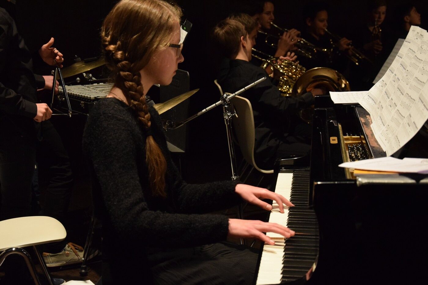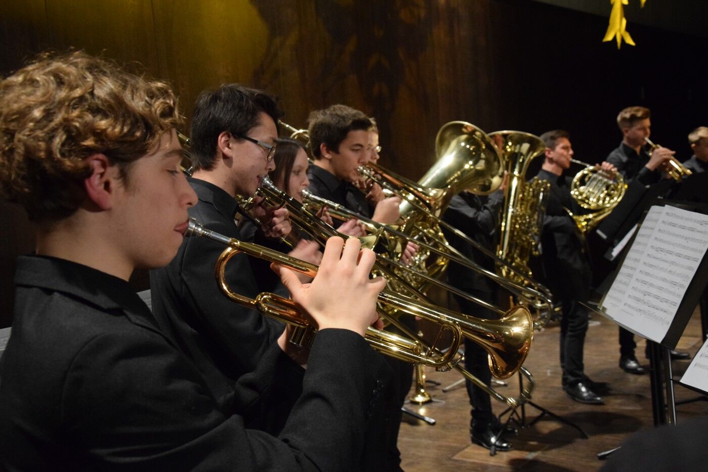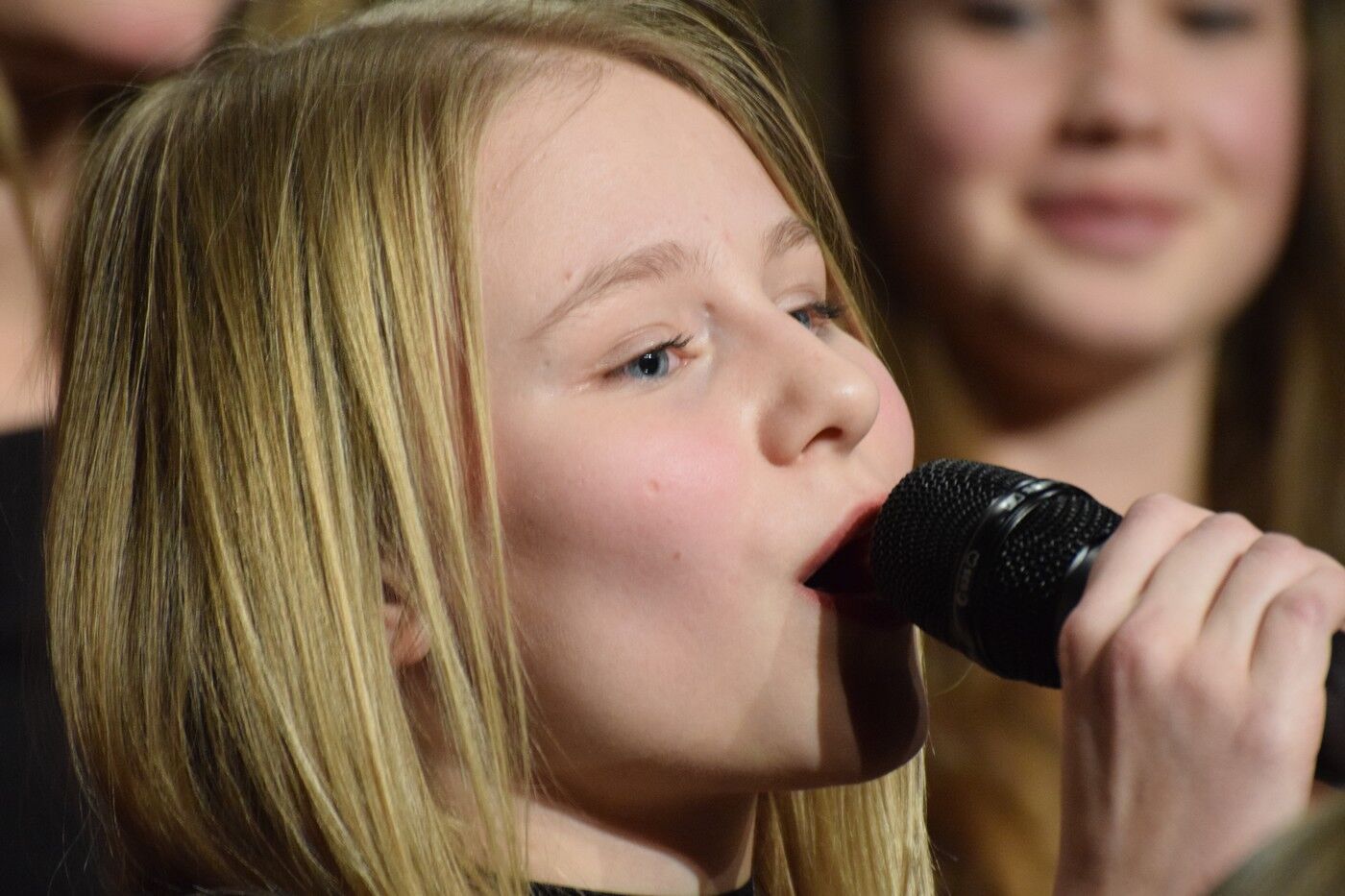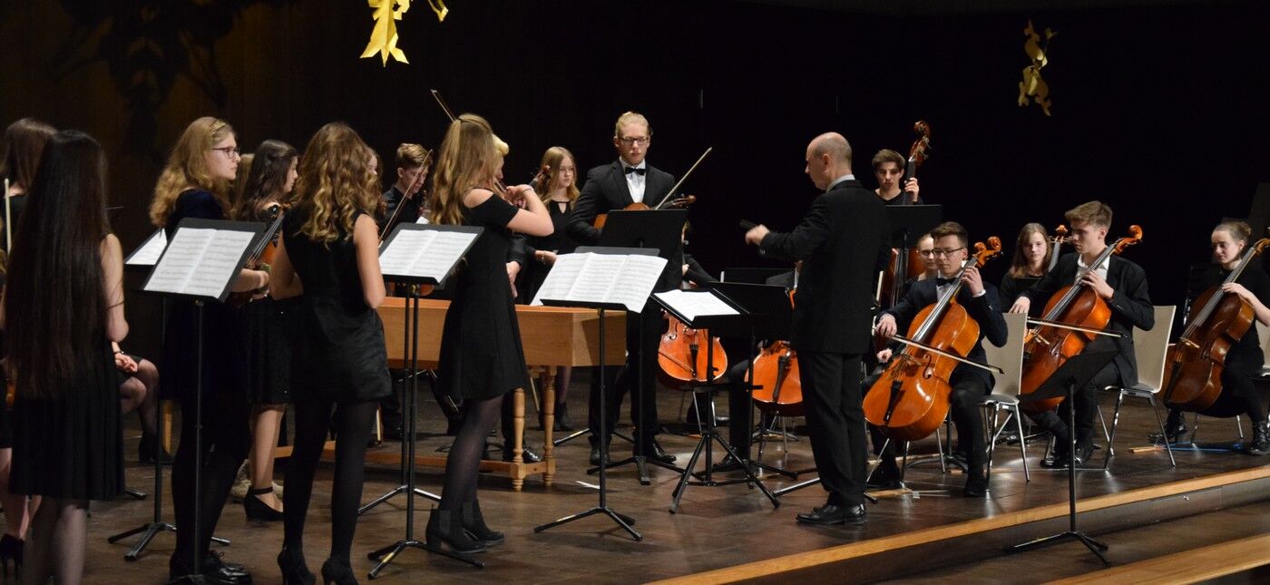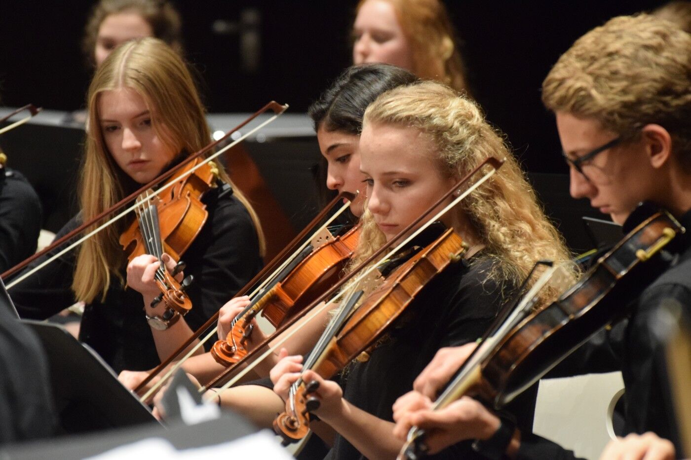 Beim Konzert der „Großen“ hatten die Schülerinnen und Schüler der Jahrgangsstufen neun bis zwölf ebenfalls ein abwechslungsreiches und stimmungsvolles Programm einstudiert und sorgten damit ebenfalls für einen lang anhaltenden Schlussapplaus der über 800 Zuhörerinnen und Zuhörer. Das Sinfonieorchester brillierte beispielsweise mit Gabirel Faurés „Elegie für Solovioloncello und Sinfonieorchester, das Holzbläserensemble mit Astor Piazollas „Oblivion“, das Blechbläserensemble mit Johann Sebastian Bachs „Jesus bleibet meine Freude“, der Mittelstufenchor mit Paul Edwards „Nos mall wonder“ oder das Vokalensemble mit Johann Sebastian Bachs „Wie schön leuchtet der Morgenstern“. Einer der Höhepunkte war sicherlich Erik Esenvalds „Stars“, präsentiert vom Oberstufenchor und begleitet von der Klasse 8a an der Glasharfe. Mit dem „Gloria!“ von Carole Steophens verabschiedete der Große Chor die Zuhörer.