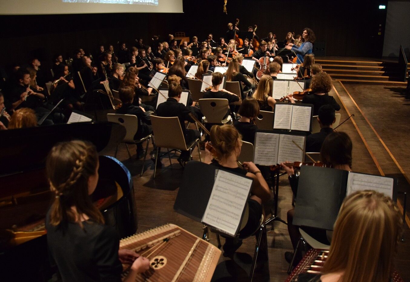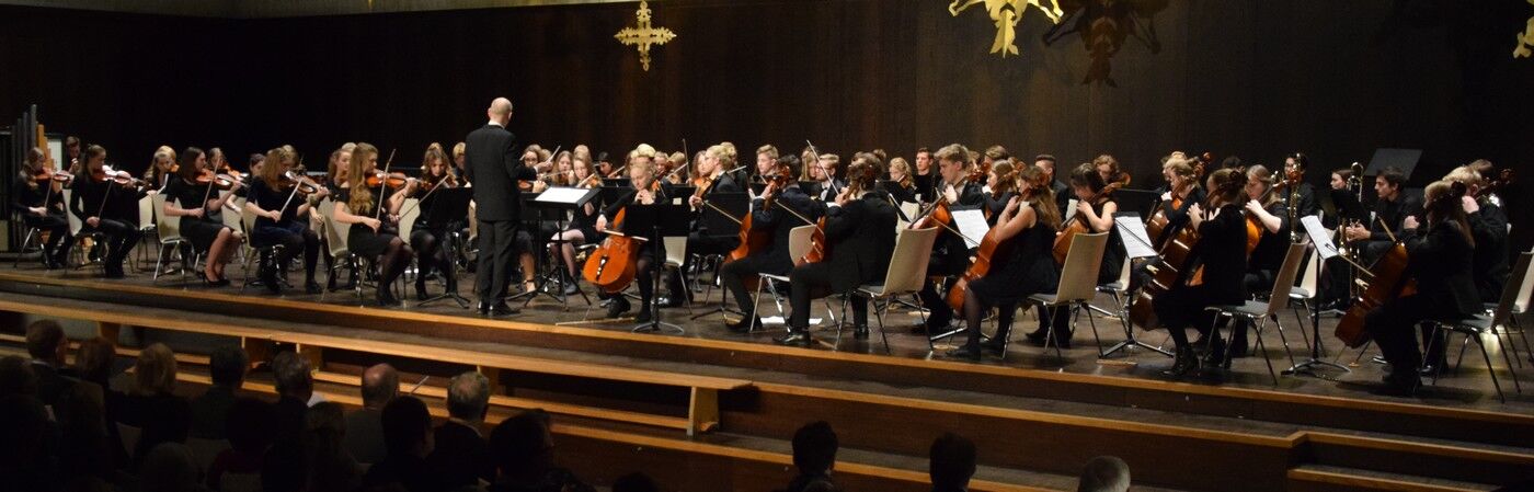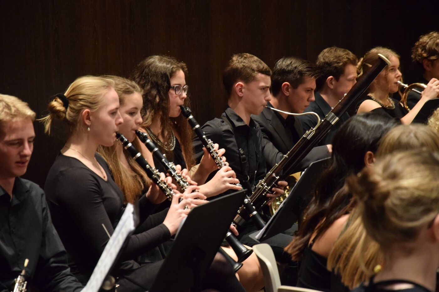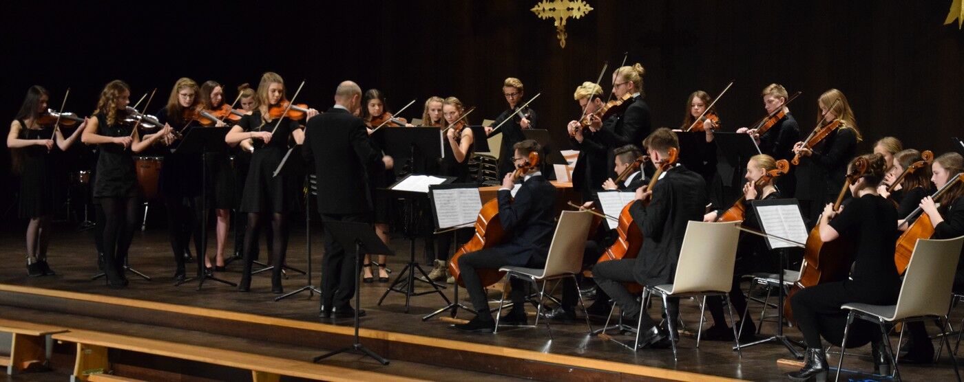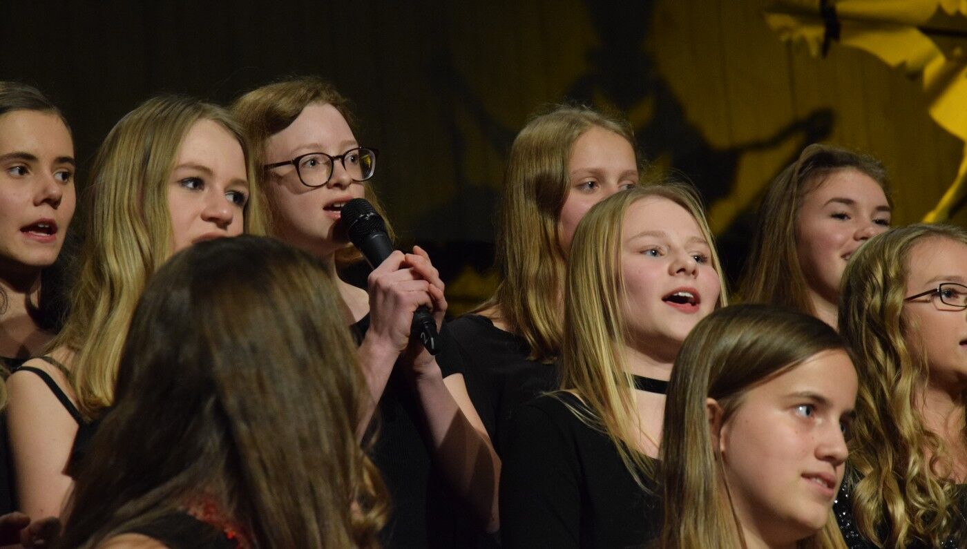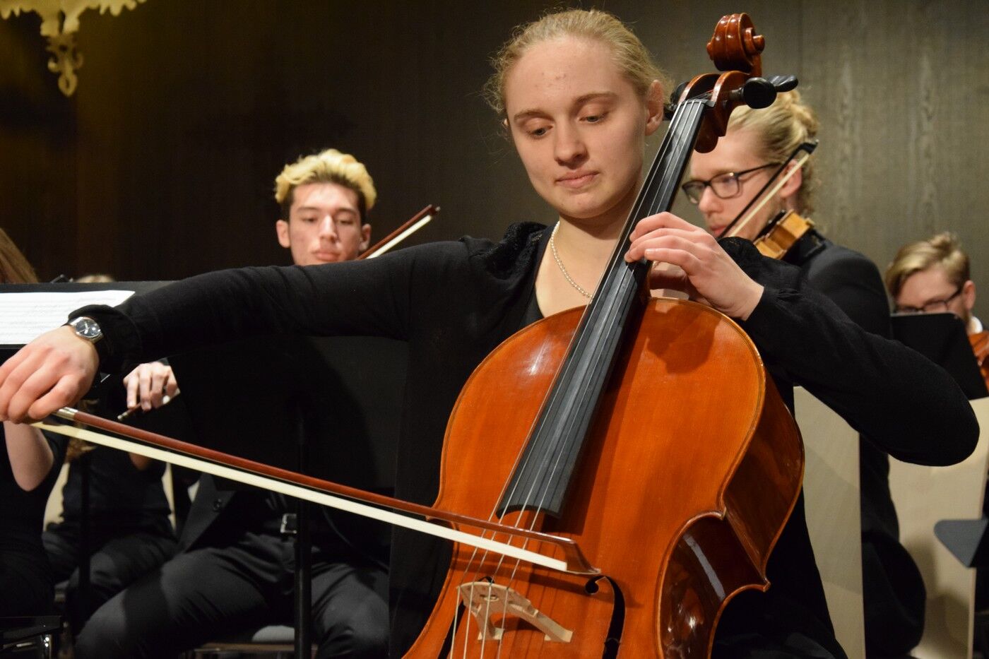 Beim Konzert der „Großen“ hatten die Schülerinnen und Schüler der Jahrgangsstufen neun bis zwölf ebenfalls ein abwechslungsreiches und stimmungsvolles Programm einstudiert und sorgten damit ebenfalls für einen lang anhaltenden Schlussapplaus der über 800 Zuhörerinnen und Zuhörer. Das Sinfonieorchester brillierte beispielsweise mit Gabirel Faurés „Elegie für Solovioloncello und Sinfonieorchester, das Holzbläserensemble mit Astor Piazollas „Oblivion“, das Blechbläserensemble mit Johann Sebastian Bachs „Jesus bleibet meine Freude“, der Mittelstufenchor mit Paul Edwards „Nos mall wonder“ oder das Vokalensemble mit Johann Sebastian Bachs „Wie schön leuchtet der Morgenstern“. Einer der Höhepunkte war sicherlich Erik Esenvalds „Stars“, präsentiert vom Oberstufenchor und begleitet von der Klasse 8a an der Glasharfe. Mit dem „Gloria!“ von Carole Steophens verabschiedete der Große Chor die Zuhörer.