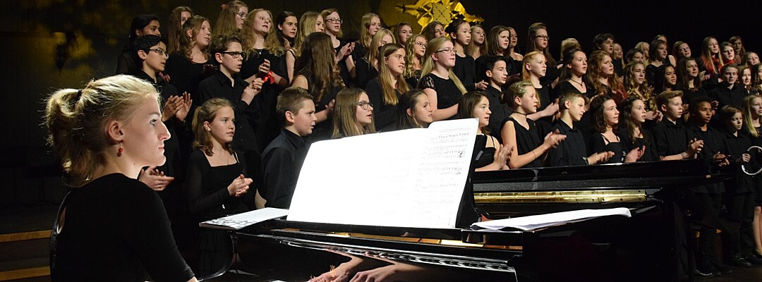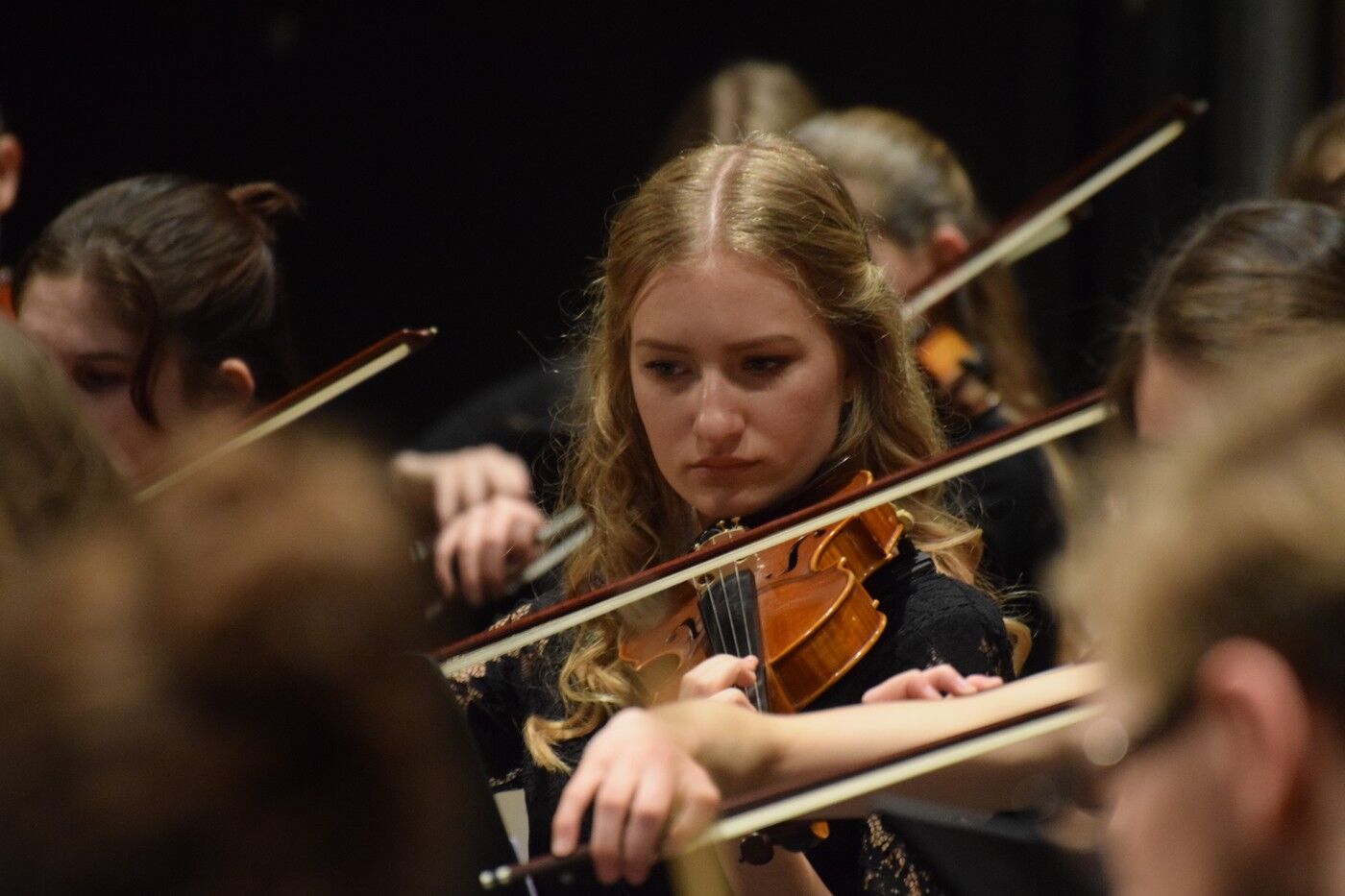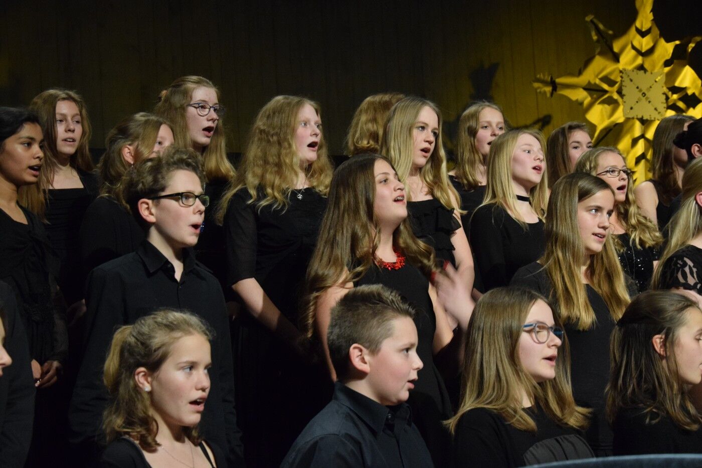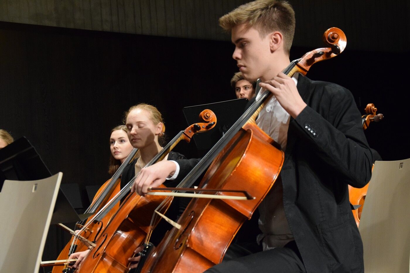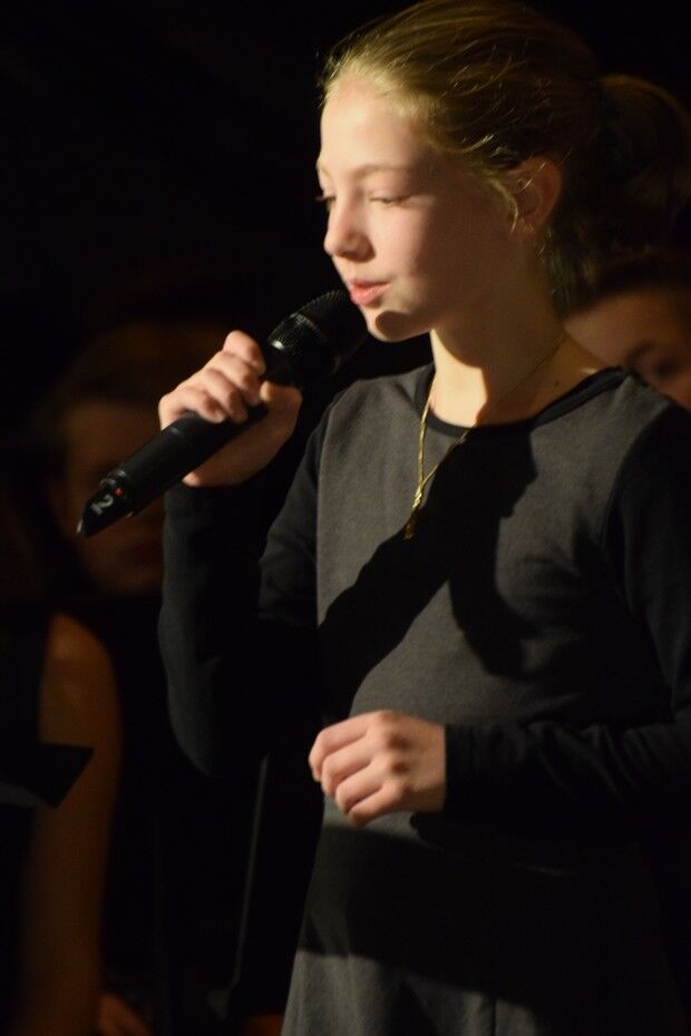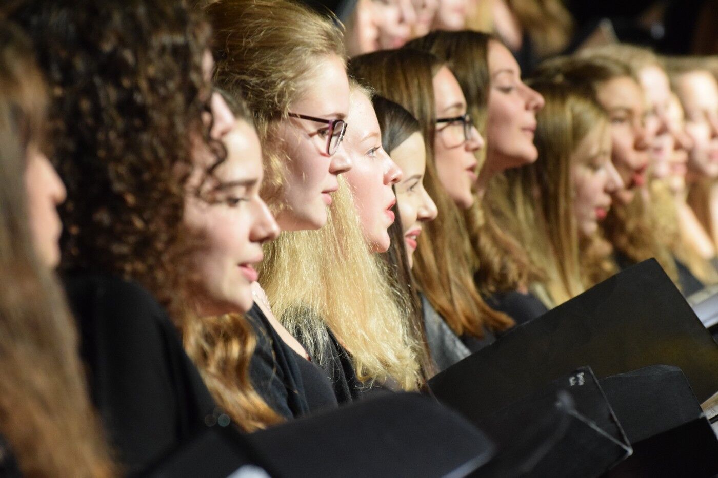 Beim Konzert der „Großen“ hatten die Schülerinnen und Schüler der Jahrgangsstufen neun bis zwölf ebenfalls ein abwechslungsreiches und stimmungsvolles Programm einstudiert und sorgten damit ebenfalls für einen lang anhaltenden Schlussapplaus der über 800 Zuhörerinnen und Zuhörer. Das Sinfonieorchester brillierte beispielsweise mit Gabirel Faurés „Elegie für Solovioloncello und Sinfonieorchester, das Holzbläserensemble mit Astor Piazollas „Oblivion“, das Blechbläserensemble mit Johann Sebastian Bachs „Jesus bleibet meine Freude“, der Mittelstufenchor mit Paul Edwards „Nos mall wonder“ oder das Vokalensemble mit Johann Sebastian Bachs „Wie schön leuchtet der Morgenstern“. Einer der Höhepunkte war sicherlich Erik Esenvalds „Stars“, präsentiert vom Oberstufenchor und begleitet von der Klasse 8a an der Glasharfe. Mit dem „Gloria!“ von Carole Steophens verabschiedete der Große Chor die Zuhörer.