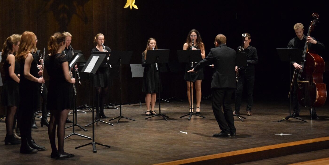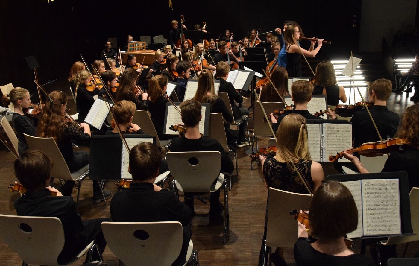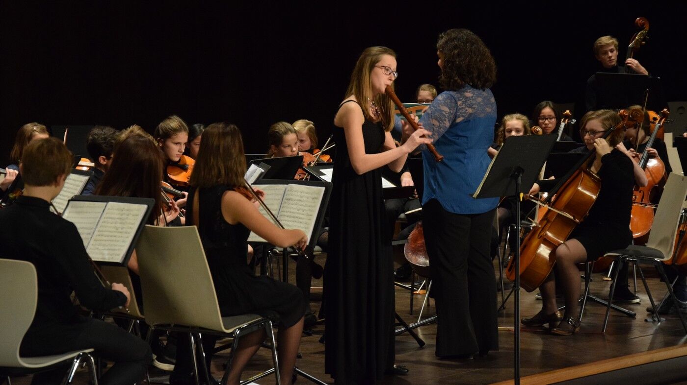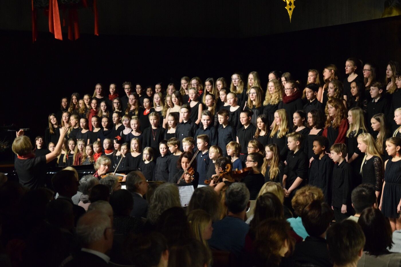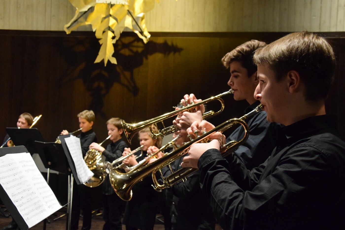 Von diesem Klangchaos der intensiven Probenarbeit war dann bei den beiden Konzertabenden nichts mehr zu hören. Die verschiedenen Ensembles präsentierten zusammen mit ihren Musiklehrkräften beispielsweise beim Montags-Konzert der Jahrgangsstufen fünf bis acht ein buntes und abwechslungsreiches Programm. Für den schwungvollen Auftakt sorgte das Jugendstreichorchester mit Antonin Vivaldis „Konzert für Blockflöte und Streicher in C-Dur“. Der Jugendchor der 5. und 6. Klassen stimmte mit „Zu Bethlehem übern Stall“ und „Angel’s Carol“ ebenso auf Weihnachten ein wie auch das Jugendholzbläserensemble mit „Jingle Bells“ oder „Rudolp, the rednose reindeer.“ Das Jugendblechbläserensemble glänzte beispielsweise mit Canalis „Canzona per sonare no. 18“ und der Jugendchor mit Johann Michael Haydns „Puer natus in Bethlehem“. Alle Chöre und das große Jugendsinfonieorchester versammelten sich am Ende zum großen Finale auf der Bühne. Mit Felix Mendelssohn-Barholdys „Hark! The Herald Angels Sing“, arrangiert von Ted Ricketts verabschiedeten sich die Schülerinnen und Schüler das Publikum.