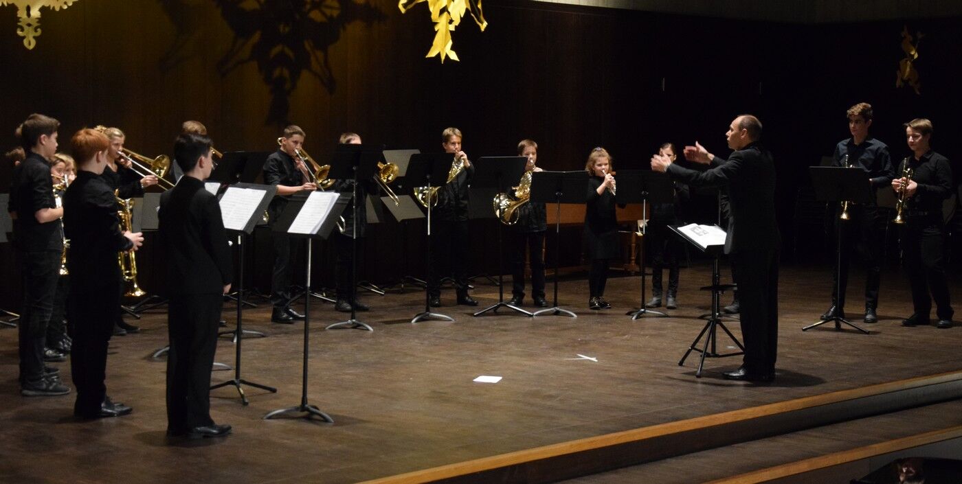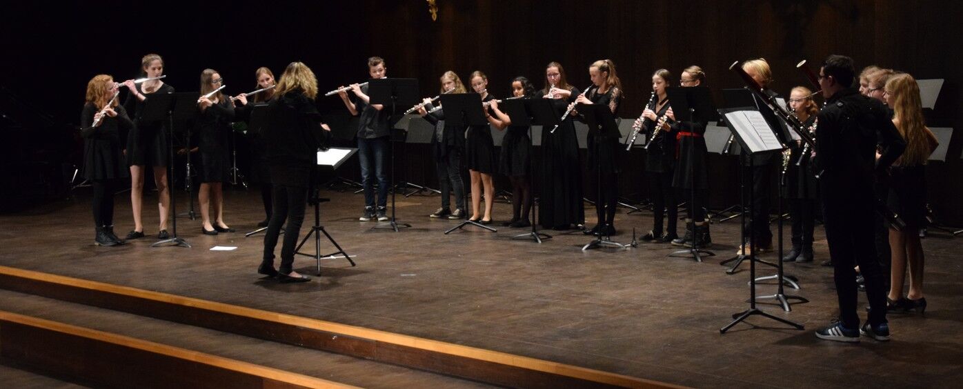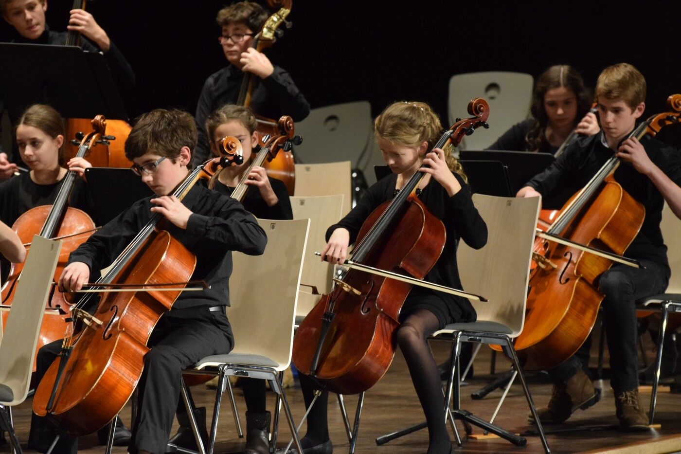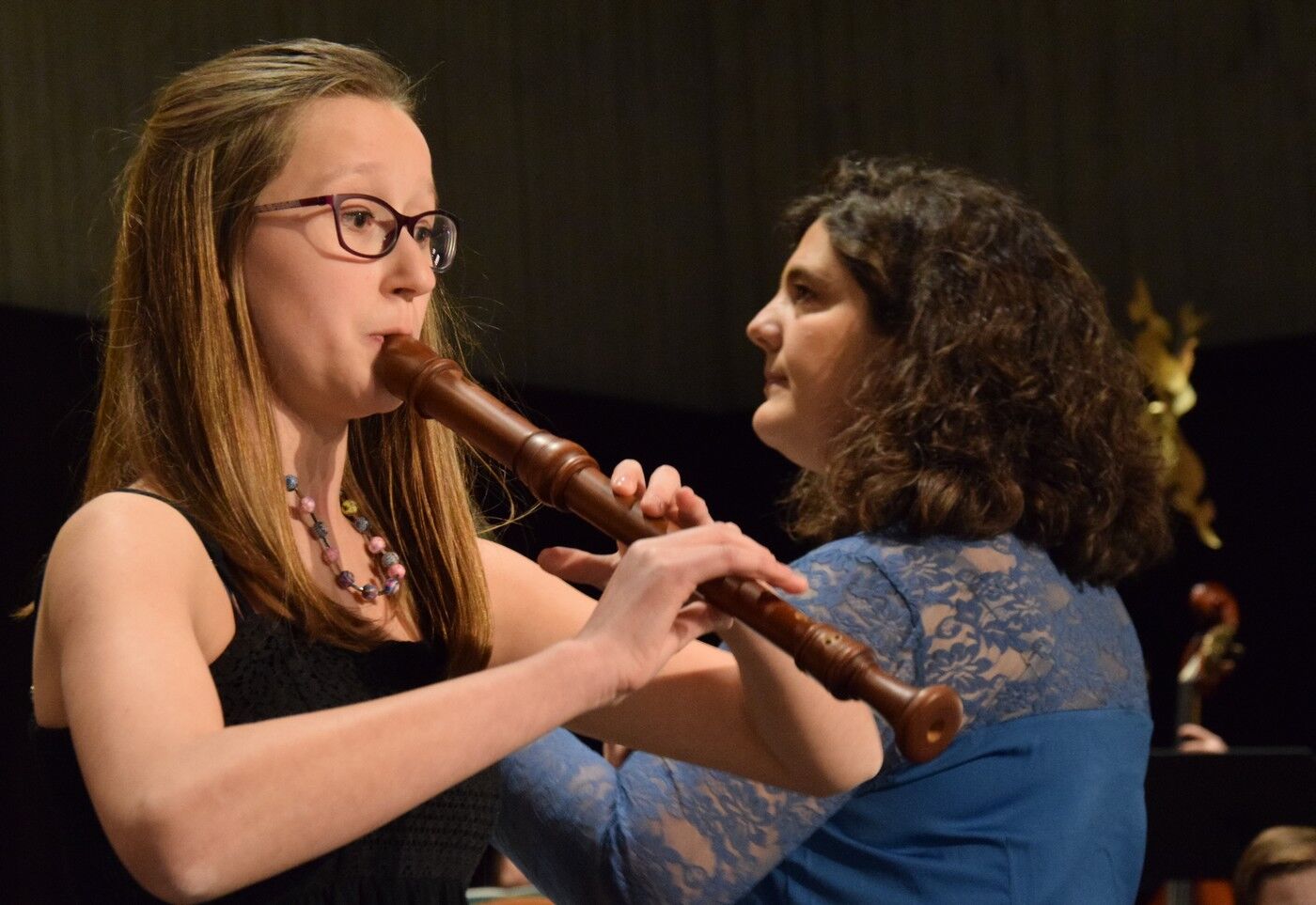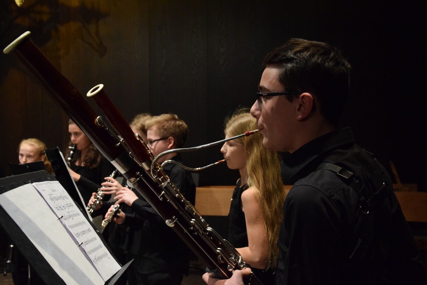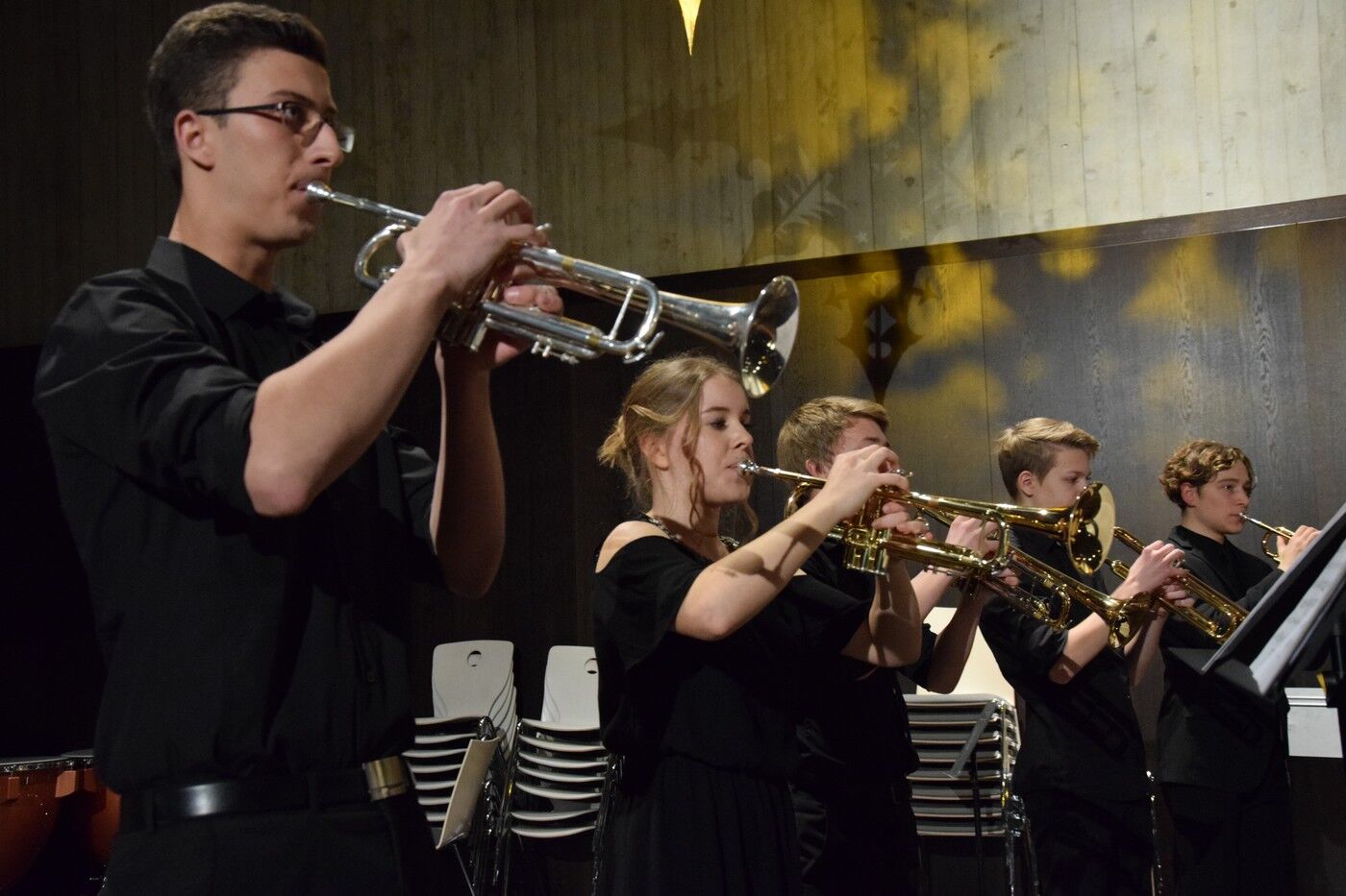 Von diesem Klangchaos der intensiven Probenarbeit war dann bei den beiden Konzertabenden nichts mehr zu hören. Die verschiedenen Ensembles präsentierten zusammen mit ihren Musiklehrkräften beispielsweise beim Montags-Konzert der Jahrgangsstufen fünf bis acht ein buntes und abwechslungsreiches Programm. Für den schwungvollen Auftakt sorgte das Jugendstreichorchester mit Antonin Vivaldis „Konzert für Blockflöte und Streicher in C-Dur“. Der Jugendchor der 5. und 6. Klassen stimmte mit „Zu Bethlehem übern Stall“ und „Angel’s Carol“ ebenso auf Weihnachten ein wie auch das Jugendholzbläserensemble mit „Jingle Bells“ oder „Rudolp, the rednose reindeer.“ Das Jugendblechbläserensemble glänzte beispielsweise mit Canalis „Canzona per sonare no. 18“ und der Jugendchor mit Johann Michael Haydns „Puer natus in Bethlehem“. Alle Chöre und das große Jugendsinfonieorchester versammelten sich am Ende zum großen Finale auf der Bühne. Mit Felix Mendelssohn-Barholdys „Hark! The Herald Angels Sing“, arrangiert von Ted Ricketts verabschiedeten sich die Schülerinnen und Schüler das Publikum.