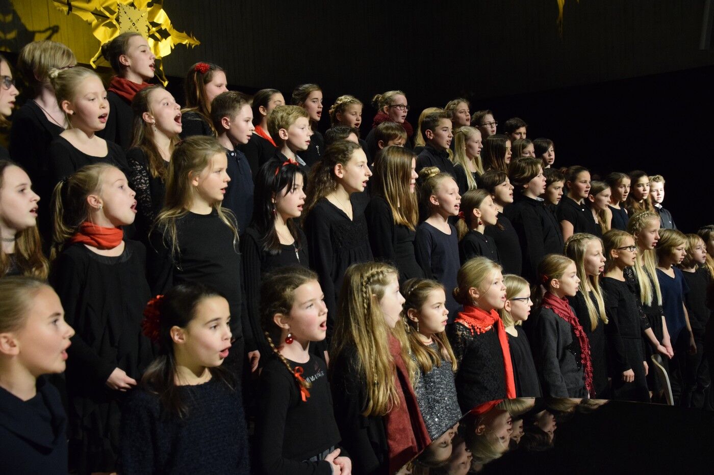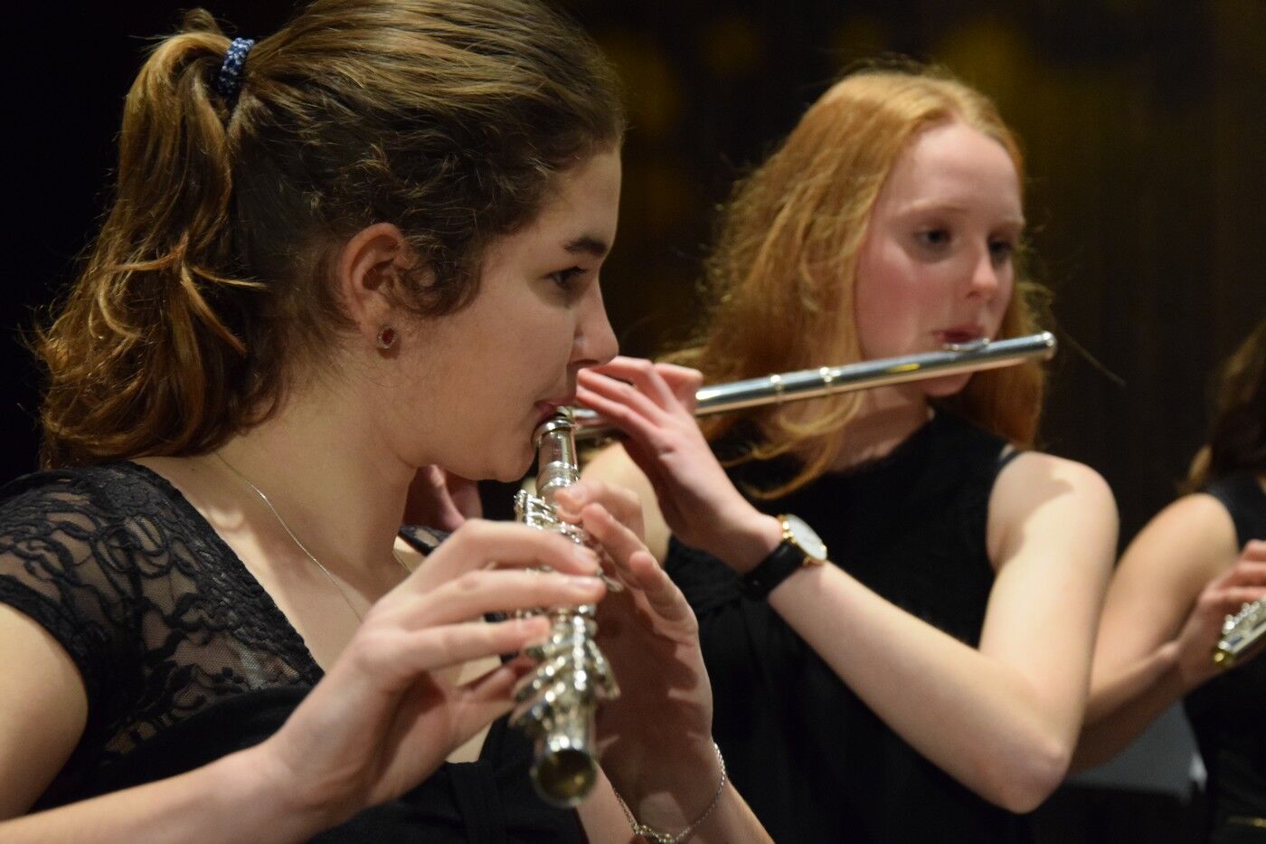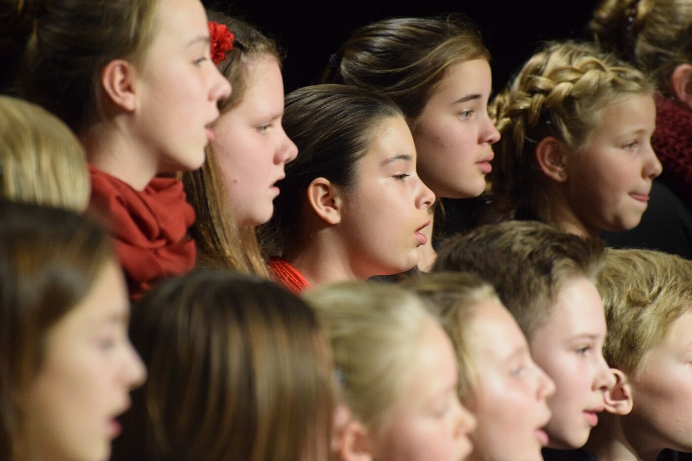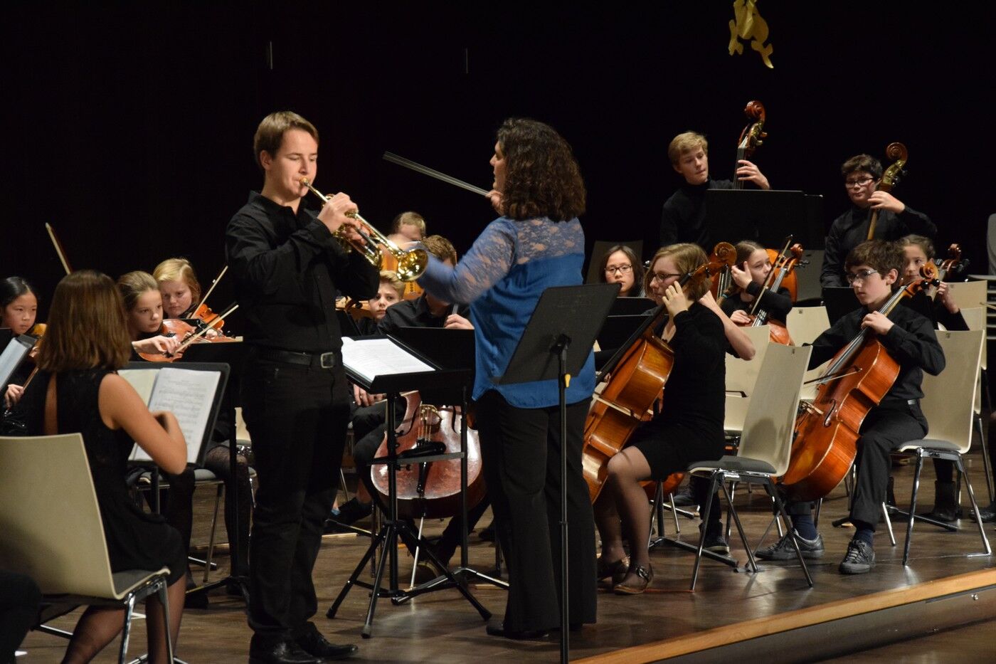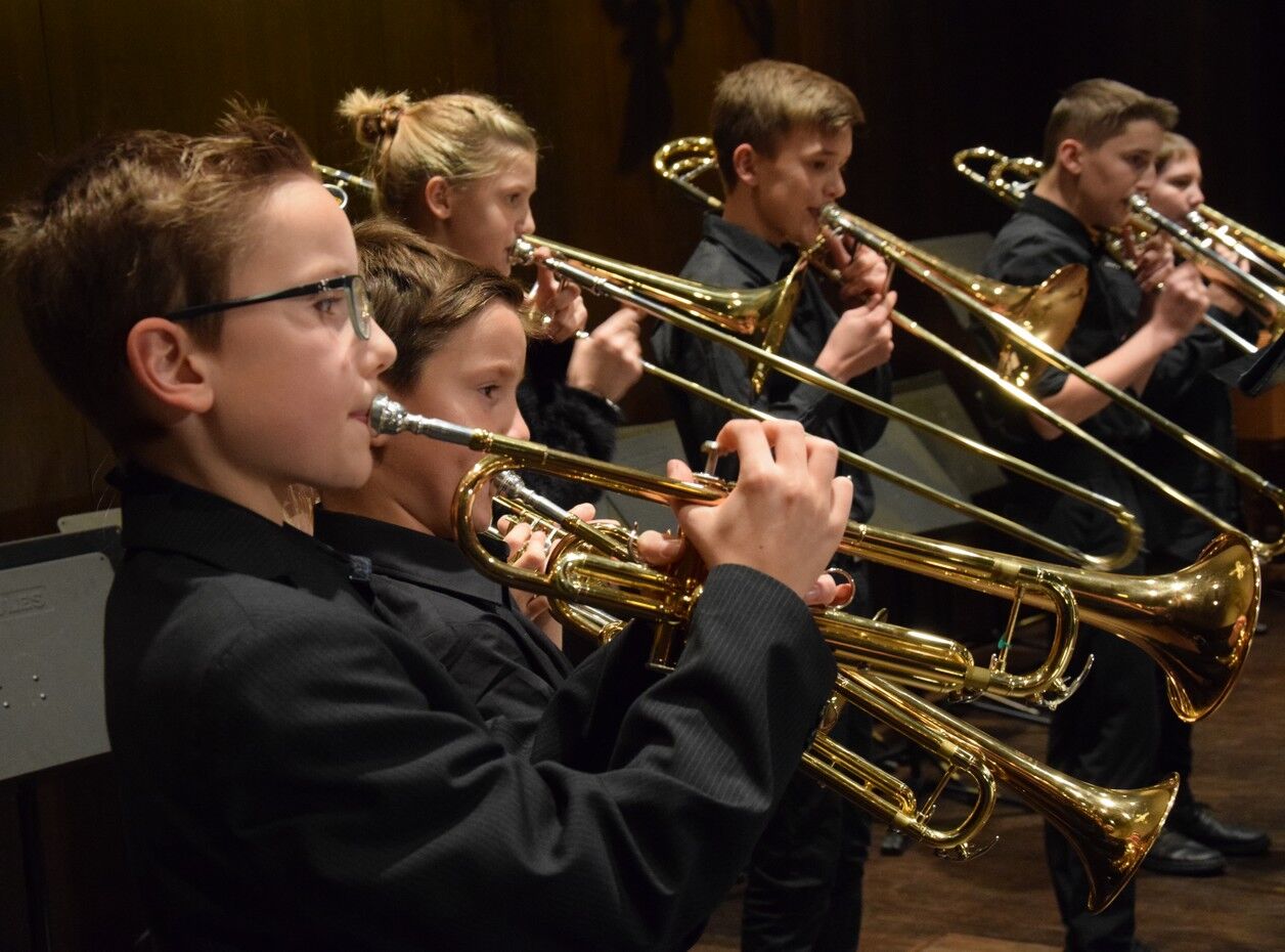 Von diesem Klangchaos der intensiven Probenarbeit war dann bei den beiden Konzertabenden nichts mehr zu hören. Die verschiedenen Ensembles präsentierten zusammen mit ihren Musiklehrkräften beispielsweise beim Montags-Konzert der Jahrgangsstufen fünf bis acht ein buntes und abwechslungsreiches Programm. Für den schwungvollen Auftakt sorgte das Jugendstreichorchester mit Antonin Vivaldis „Konzert für Blockflöte und Streicher in C-Dur“. Der Jugendchor der 5. und 6. Klassen stimmte mit „Zu Bethlehem übern Stall“ und „Angel’s Carol“ ebenso auf Weihnachten ein wie auch das Jugendholzbläserensemble mit „Jingle Bells“ oder „Rudolp, the rednose reindeer.“ Das Jugendblechbläserensemble glänzte beispielsweise mit Canalis „Canzona per sonare no. 18“ und der Jugendchor mit Johann Michael Haydns „Puer natus in Bethlehem“. Alle Chöre und das große Jugendsinfonieorchester versammelten sich am Ende zum großen Finale auf der Bühne. Mit Felix Mendelssohn-Barholdys „Hark! The Herald Angels Sing“, arrangiert von Ted Ricketts verabschiedeten sich die Schülerinnen und Schüler das Publikum.