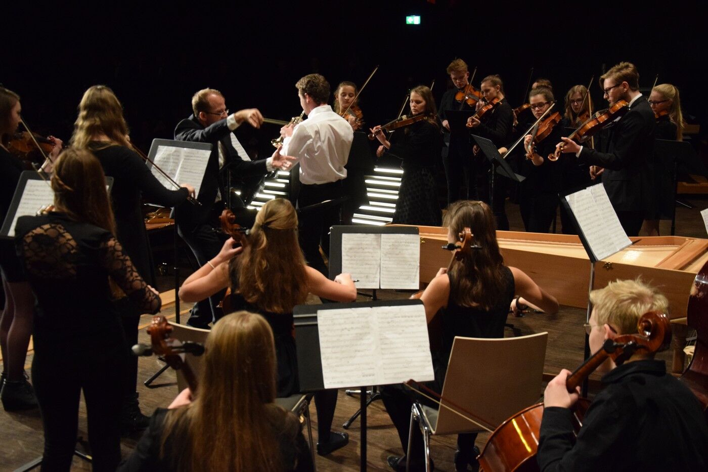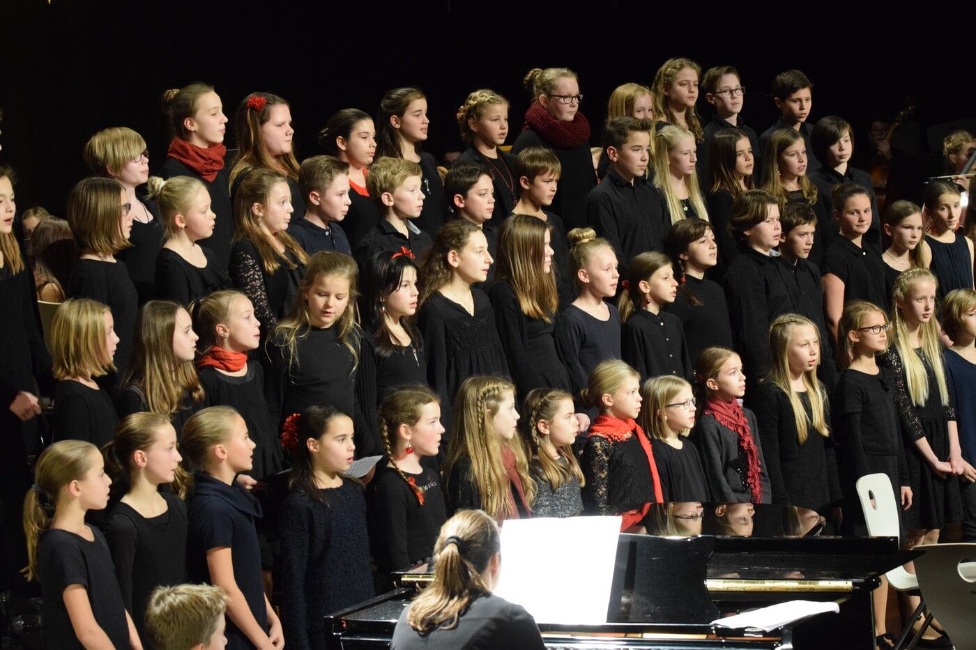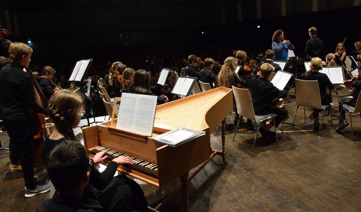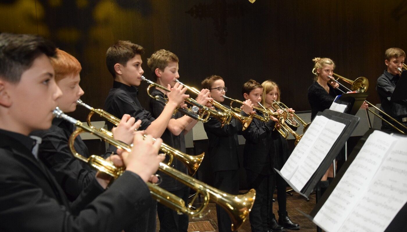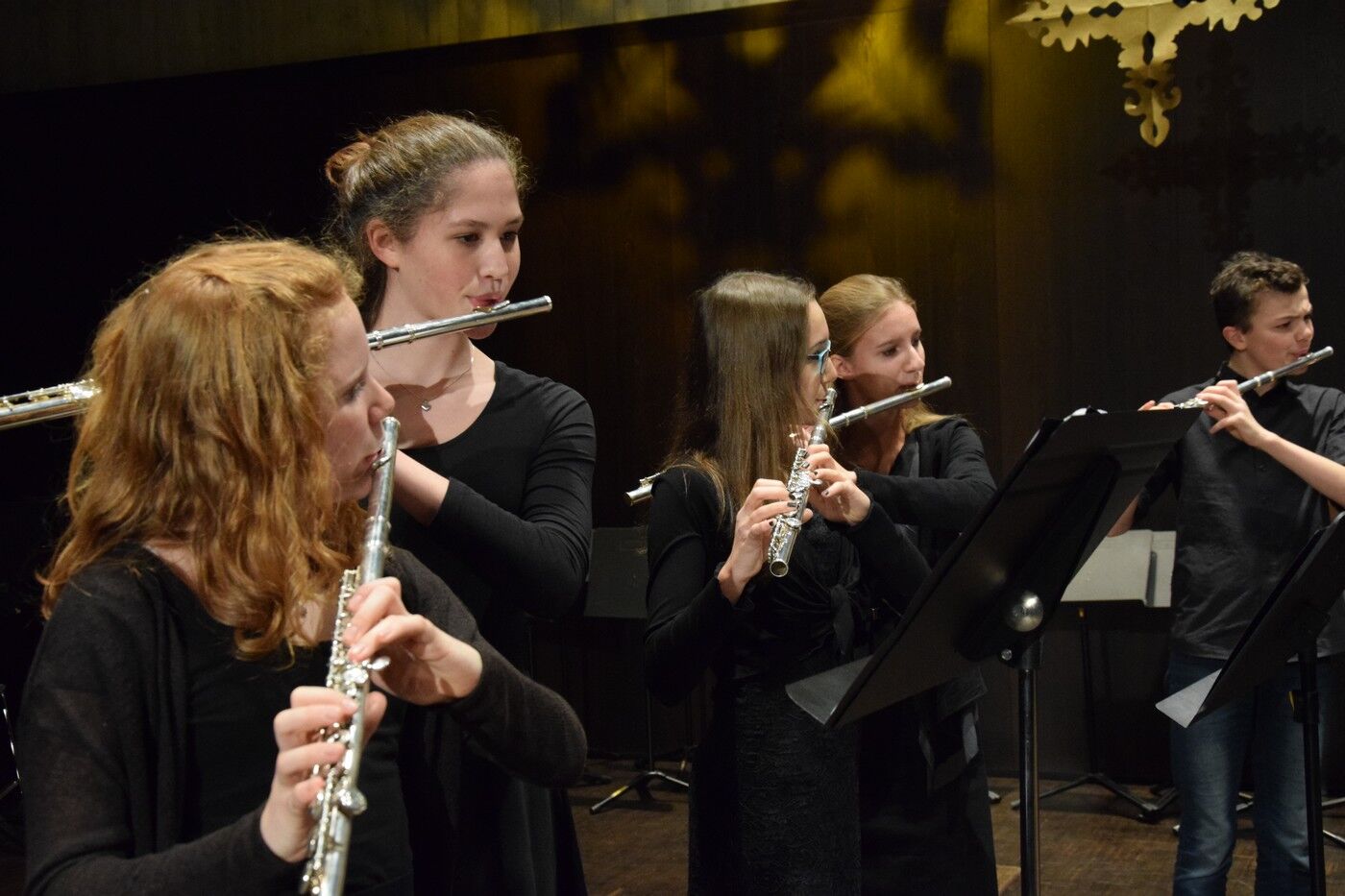 Von diesem Klangchaos der intensiven Probenarbeit war dann bei den beiden Konzertabenden nichts mehr zu hören. Die verschiedenen Ensembles präsentierten zusammen mit ihren Musiklehrkräften beispielsweise beim Montags-Konzert der Jahrgangsstufen fünf bis acht ein buntes und abwechslungsreiches Programm. Für den schwungvollen Auftakt sorgte das Jugendstreichorchester mit Antonin Vivaldis „Konzert für Blockflöte und Streicher in C-Dur“. Der Jugendchor der 5. und 6. Klassen stimmte mit „Zu Bethlehem übern Stall“ und „Angel’s Carol“ ebenso auf Weihnachten ein wie auch das Jugendholzbläserensemble mit „Jingle Bells“ oder „Rudolp, the rednose reindeer.“ Das Jugendblechbläserensemble glänzte beispielsweise mit Canalis „Canzona per sonare no. 18“ und der Jugendchor mit Johann Michael Haydns „Puer natus in Bethlehem“. Alle Chöre und das große Jugendsinfonieorchester versammelten sich am Ende zum großen Finale auf der Bühne. Mit Felix Mendelssohn-Barholdys „Hark! The Herald Angels Sing“, arrangiert von Ted Ricketts verabschiedeten sich die Schülerinnen und Schüler das Publikum.