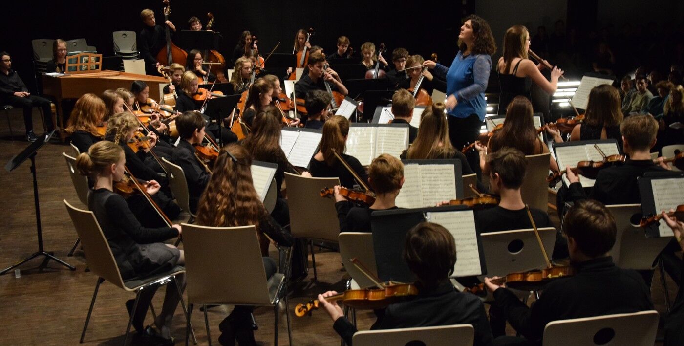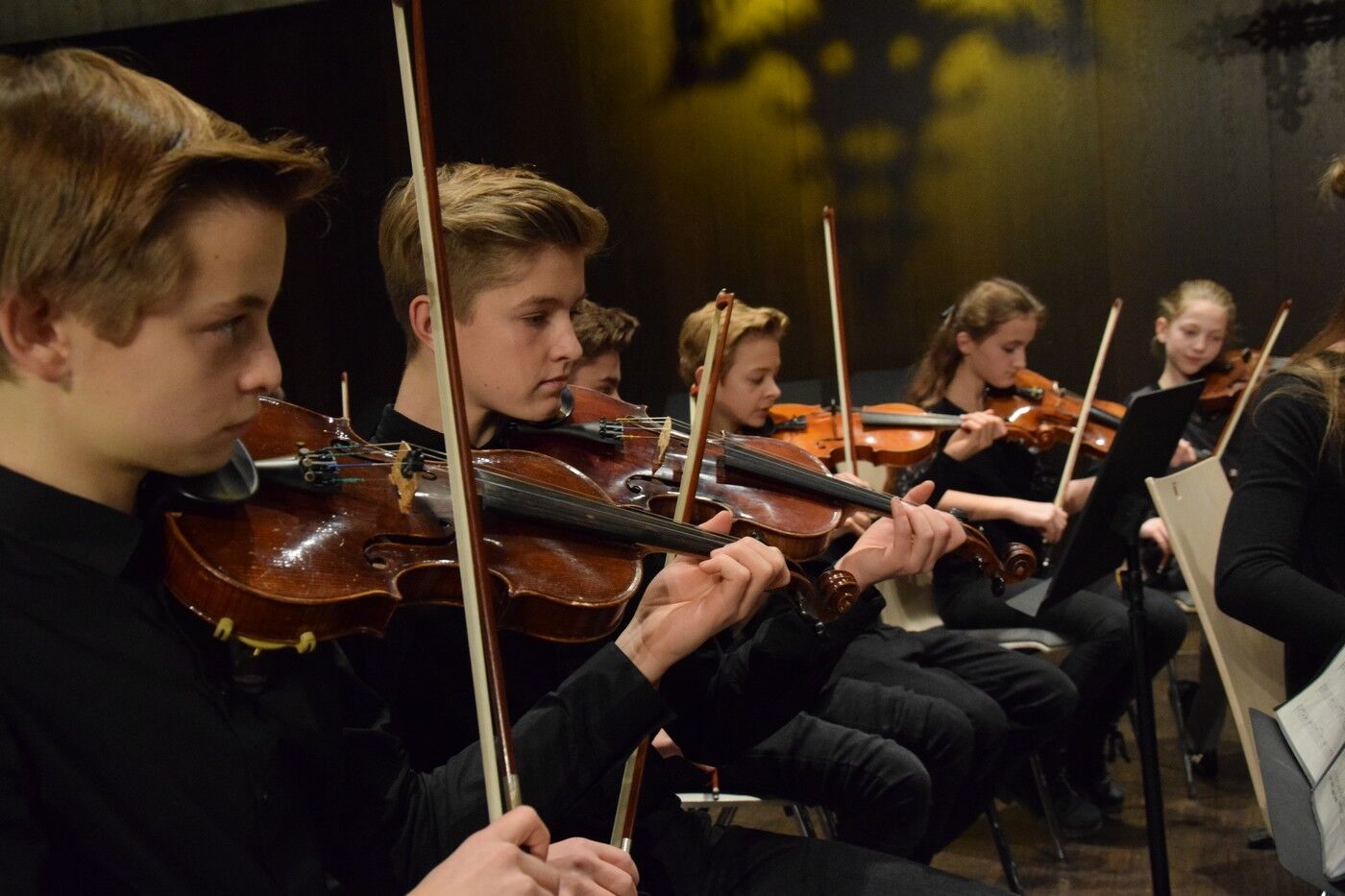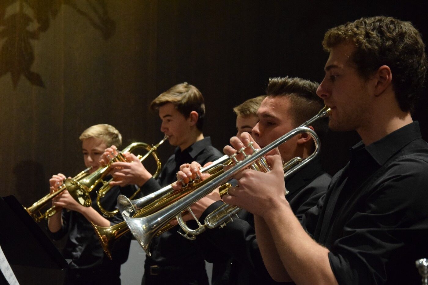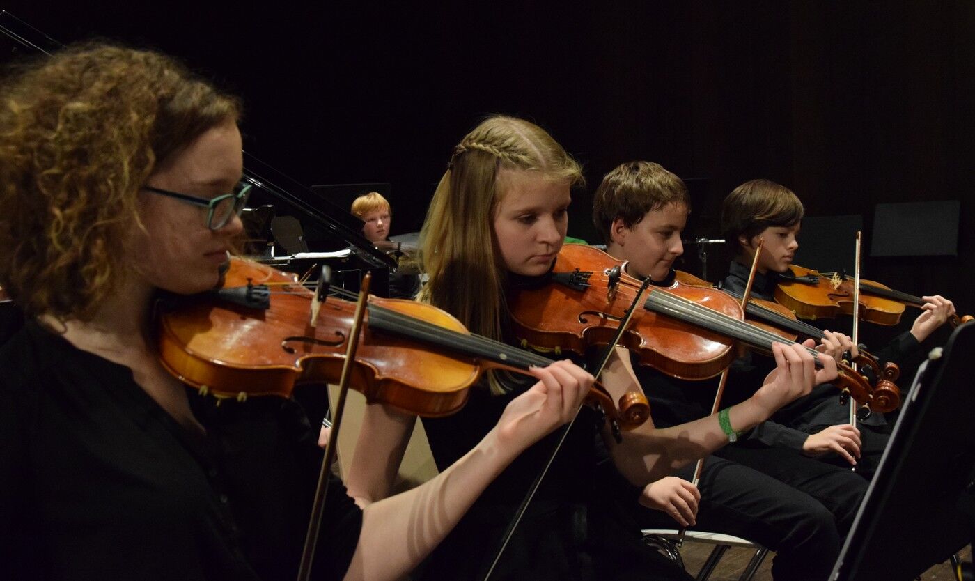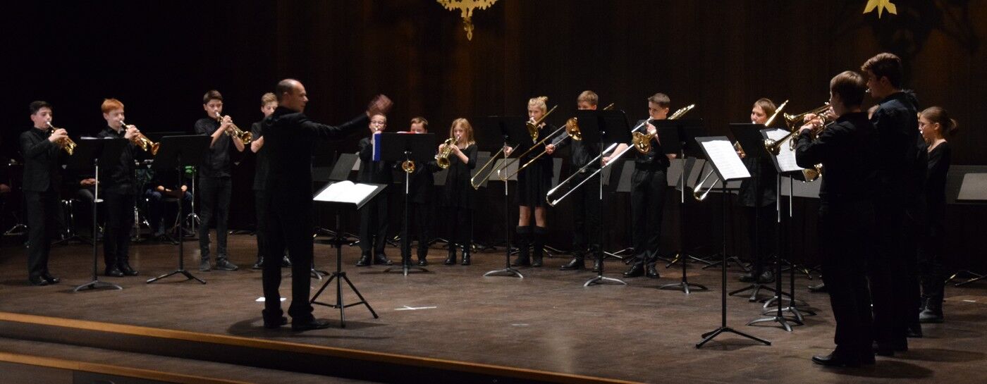 Von diesem Klangchaos der intensiven Probenarbeit war dann bei den beiden Konzertabenden nichts mehr zu hören. Die verschiedenen Ensembles präsentierten zusammen mit ihren Musiklehrkräften beispielsweise beim Montags-Konzert der Jahrgangsstufen fünf bis acht ein buntes und abwechslungsreiches Programm. Für den schwungvollen Auftakt sorgte das Jugendstreichorchester mit Antonin Vivaldis „Konzert für Blockflöte und Streicher in C-Dur“. Der Jugendchor der 5. und 6. Klassen stimmte mit „Zu Bethlehem übern Stall“ und „Angel’s Carol“ ebenso auf Weihnachten ein wie auch das Jugendholzbläserensemble mit „Jingle Bells“ oder „Rudolp, the rednose reindeer.“ Das Jugendblechbläserensemble glänzte beispielsweise mit Canalis „Canzona per sonare no. 18“ und der Jugendchor mit Johann Michael Haydns „Puer natus in Bethlehem“. Alle Chöre und das große Jugendsinfonieorchester versammelten sich am Ende zum großen Finale auf der Bühne. Mit Felix Mendelssohn-Barholdys „Hark! The Herald Angels Sing“, arrangiert von Ted Ricketts verabschiedeten sich die Schülerinnen und Schüler das Publikum.