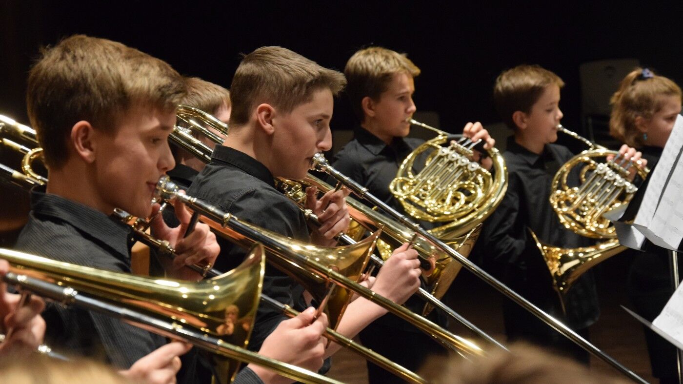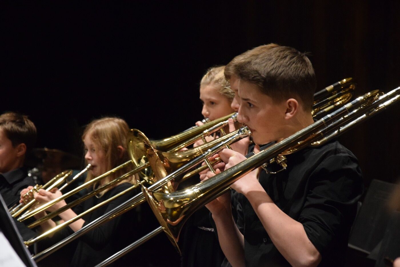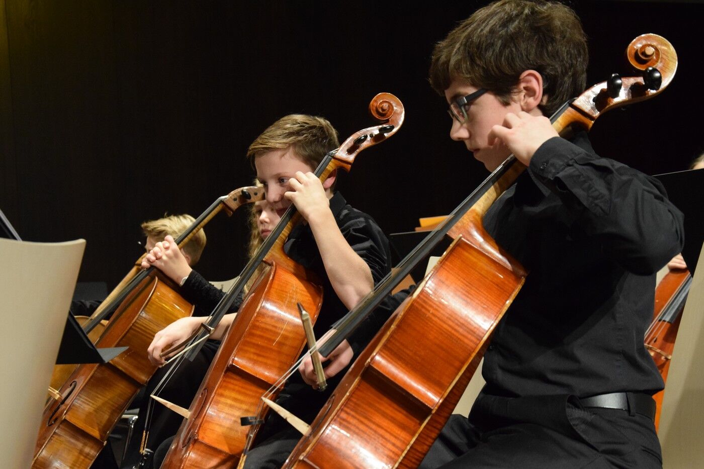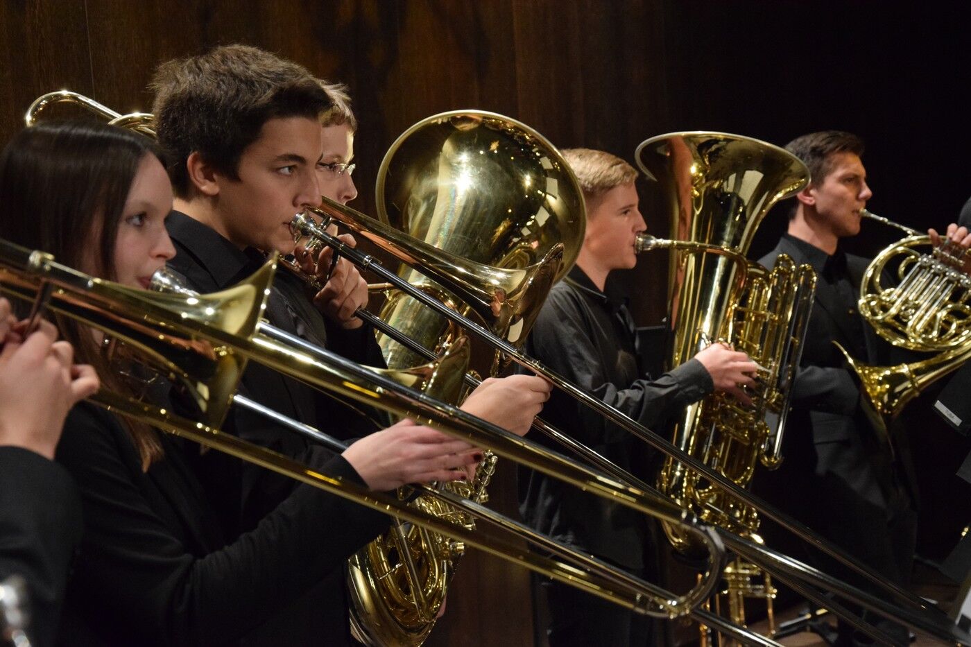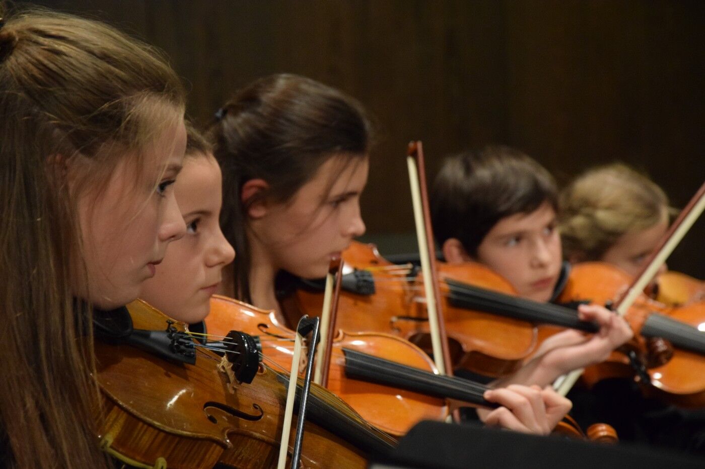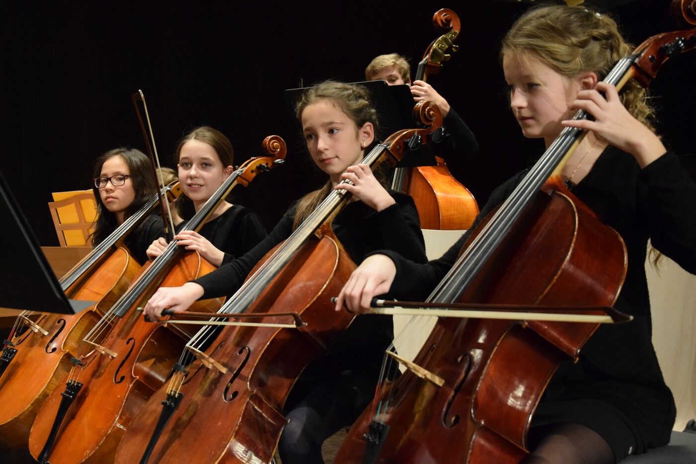 Von diesem Klangchaos der intensiven Probenarbeit war dann bei den beiden Konzertabenden nichts mehr zu hören. Die verschiedenen Ensembles präsentierten zusammen mit ihren Musiklehrkräften beispielsweise beim Montags-Konzert der Jahrgangsstufen fünf bis acht ein buntes und abwechslungsreiches Programm. Für den schwungvollen Auftakt sorgte das Jugendstreichorchester mit Antonin Vivaldis „Konzert für Blockflöte und Streicher in C-Dur“. Der Jugendchor der 5. und 6. Klassen stimmte mit „Zu Bethlehem übern Stall“ und „Angel’s Carol“ ebenso auf Weihnachten ein wie auch das Jugendholzbläserensemble mit „Jingle Bells“ oder „Rudolp, the rednose reindeer.“ Das Jugendblechbläserensemble glänzte beispielsweise mit Canalis „Canzona per sonare no. 18“ und der Jugendchor mit Johann Michael Haydns „Puer natus in Bethlehem“. Alle Chöre und das große Jugendsinfonieorchester versammelten sich am Ende zum großen Finale auf der Bühne. Mit Felix Mendelssohn-Barholdys „Hark! The Herald Angels Sing“, arrangiert von Ted Ricketts verabschiedeten sich die Schülerinnen und Schüler das Publikum.