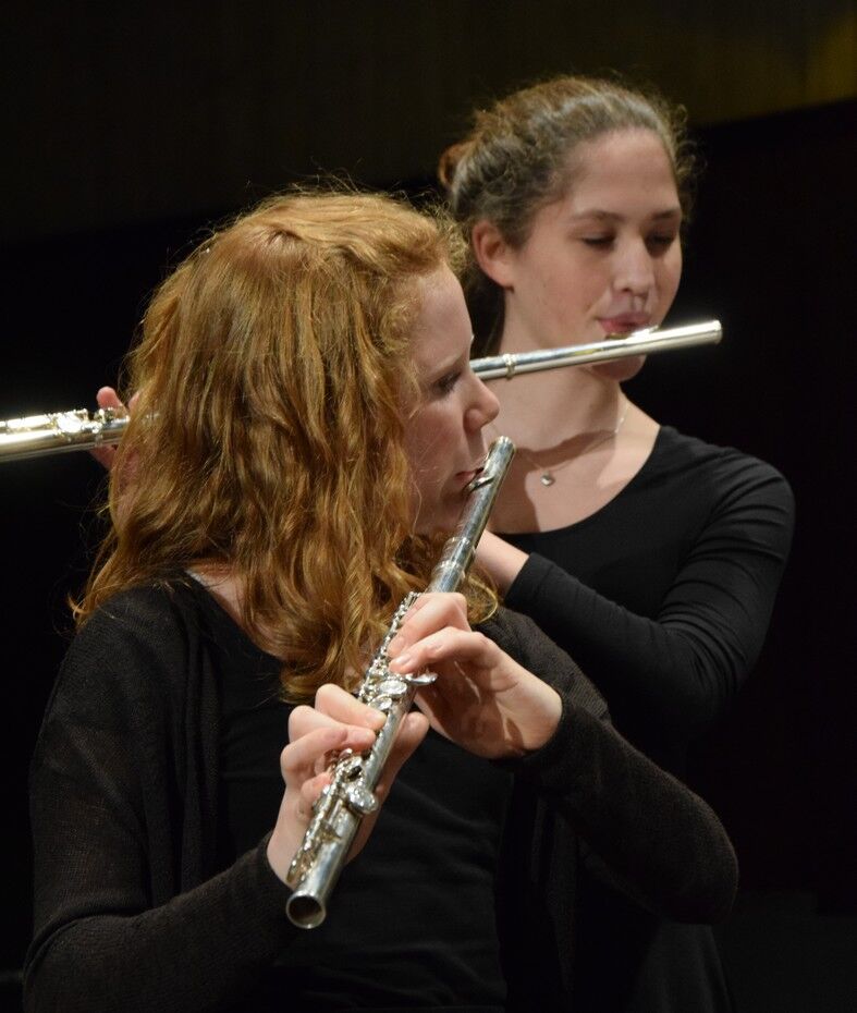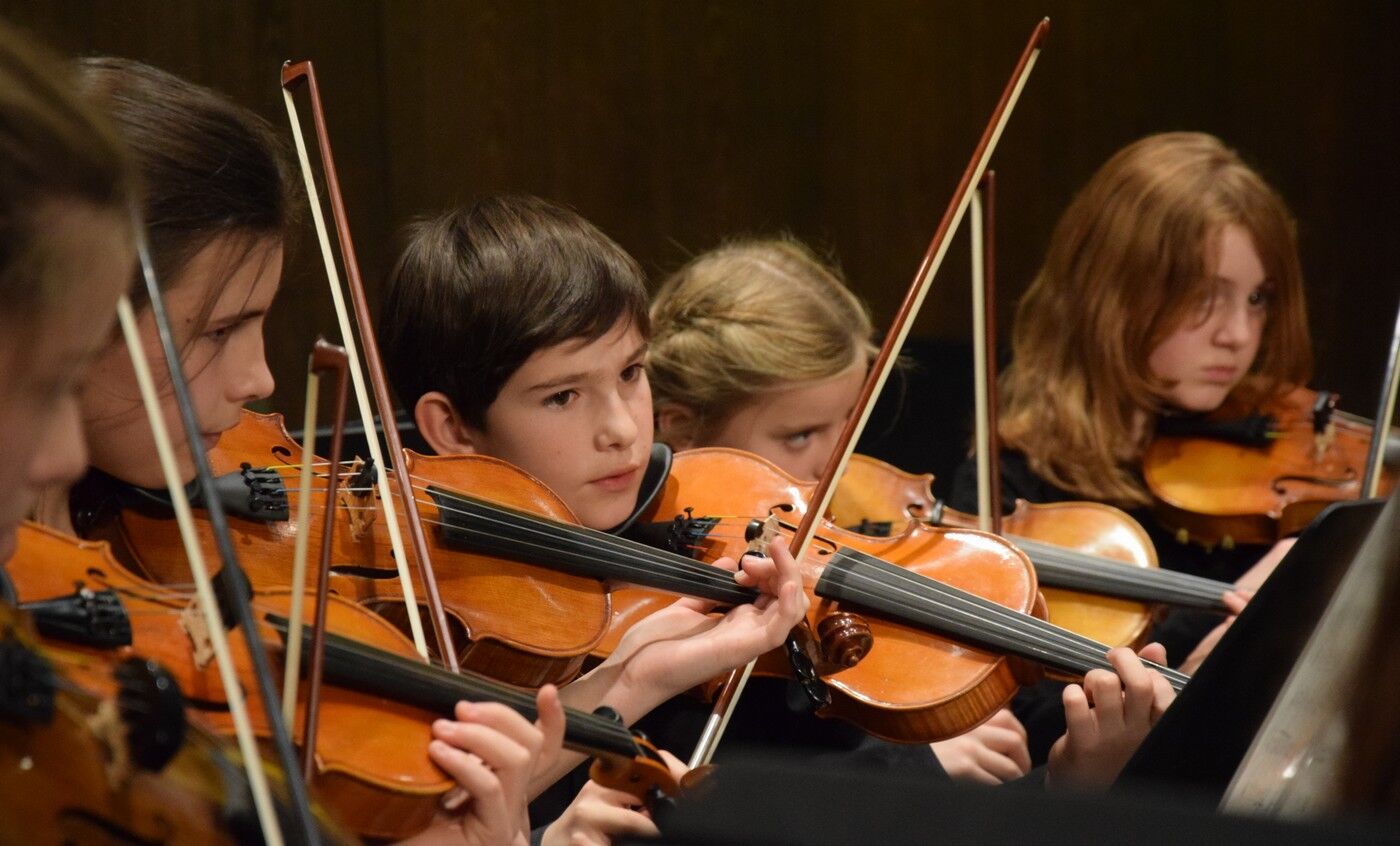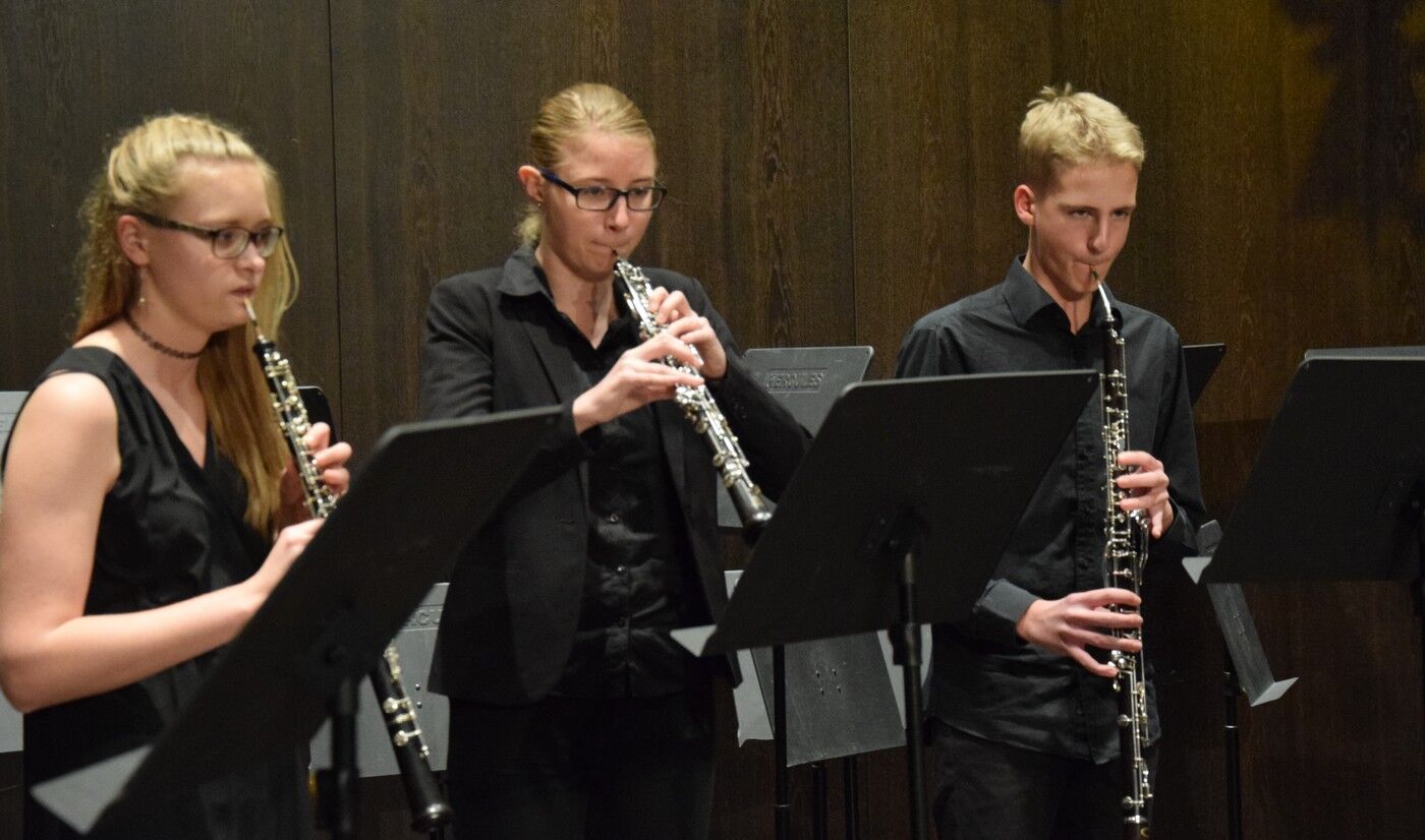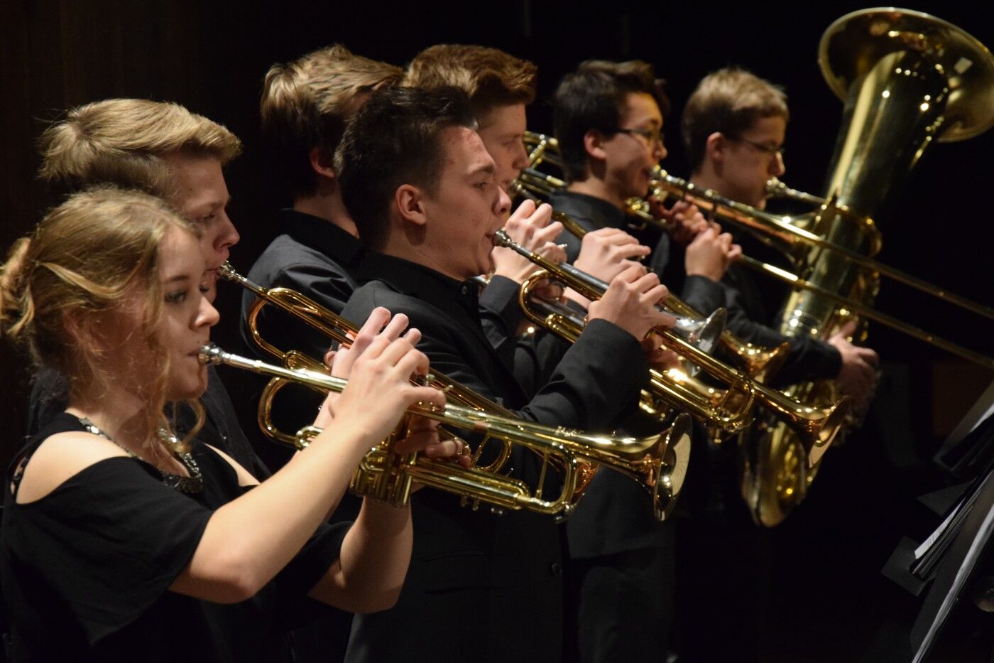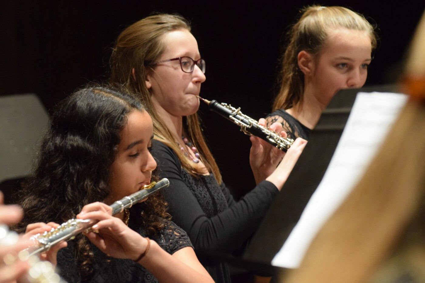 Von diesem Klangchaos der intensiven Probenarbeit war dann bei den beiden Konzertabenden nichts mehr zu hören. Die verschiedenen Ensembles präsentierten zusammen mit ihren Musiklehrkräften beispielsweise beim Montags-Konzert der Jahrgangsstufen fünf bis acht ein buntes und abwechslungsreiches Programm. Für den schwungvollen Auftakt sorgte das Jugendstreichorchester mit Antonin Vivaldis „Konzert für Blockflöte und Streicher in C-Dur“. Der Jugendchor der 5. und 6. Klassen stimmte mit „Zu Bethlehem übern Stall“ und „Angel’s Carol“ ebenso auf Weihnachten ein wie auch das Jugendholzbläserensemble mit „Jingle Bells“ oder „Rudolp, the rednose reindeer.“ Das Jugendblechbläserensemble glänzte beispielsweise mit Canalis „Canzona per sonare no. 18“ und der Jugendchor mit Johann Michael Haydns „Puer natus in Bethlehem“. Alle Chöre und das große Jugendsinfonieorchester versammelten sich am Ende zum großen Finale auf der Bühne. Mit Felix Mendelssohn-Barholdys „Hark! The Herald Angels Sing“, arrangiert von Ted Ricketts verabschiedeten sich die Schülerinnen und Schüler das Publikum.