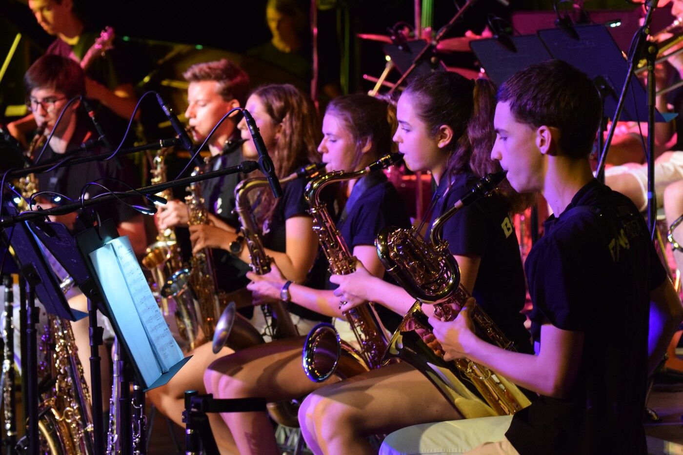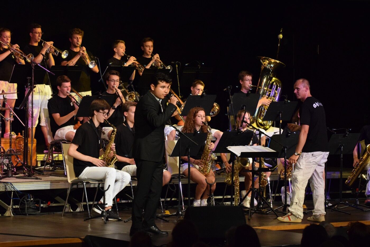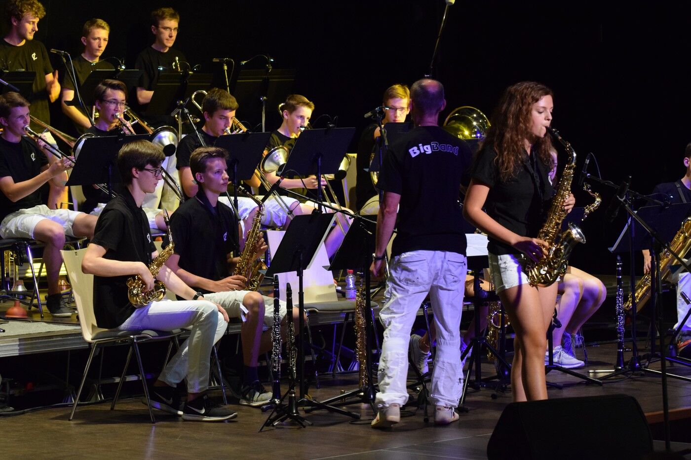 Mit Brian Setzers „Rock This Time“ sorgte die Camerloher-Bigband am Donnerstagabend (6.7.2017) gleich für einen rasanten Konzert-Start. Bei dieser bekannten Rock-Nummer ging die Post ab. Wie Moderator Julien Dumat, der kurzweilig und professionell durch den Abend führte, angekündigt hatte, blieb im Publikum kein Fuß unbewegt am Boden. Und so schwungvoll ging’s dann auch weiter. Die vier Abiturientinnen und Abiturienten, die sich aus der Bigband verabschieden mussten, durften durch Solis noch einmal glänzen: Saxophonistin Laura Achatz in „Here, There & Everywhere“ (Beatles), Saxophonistin Anja Kirnberger in „Aigainst All Odda“ (Phil Collins), Trompeter Florian Apold in „Smoke Gets In Your Eyes“ (Otto Harbach, Jerome Kern) und Gitarrist Jakob Melzer in „Enter Sandman“ (Metallica).