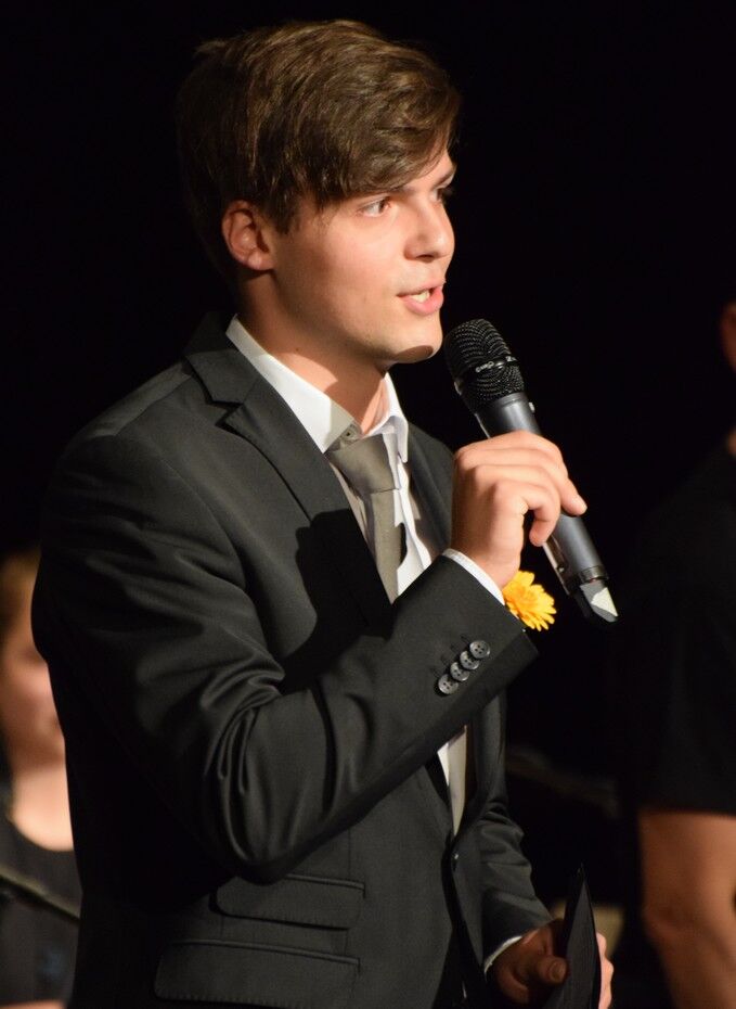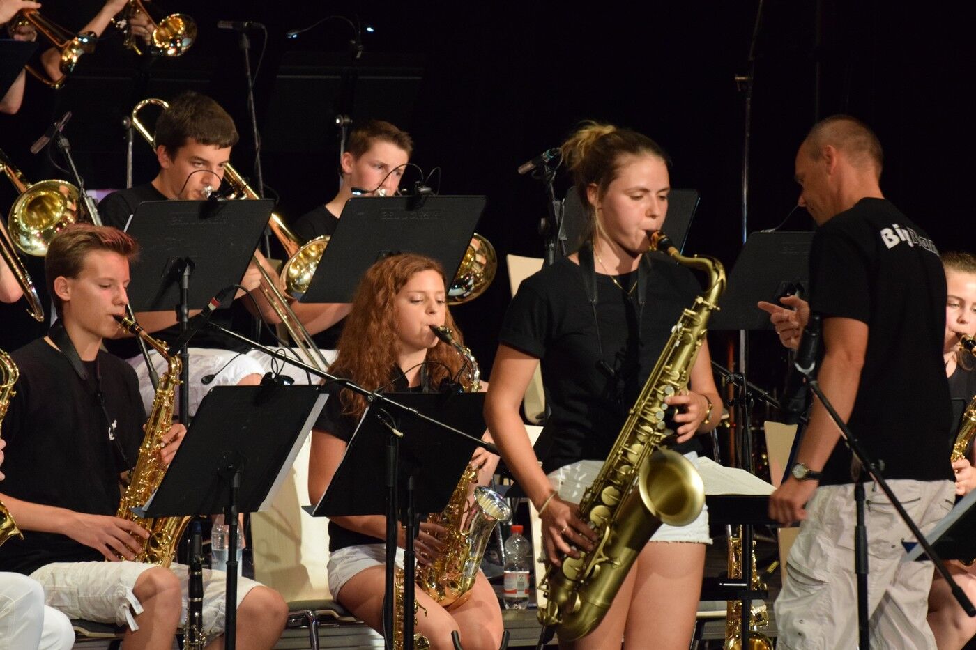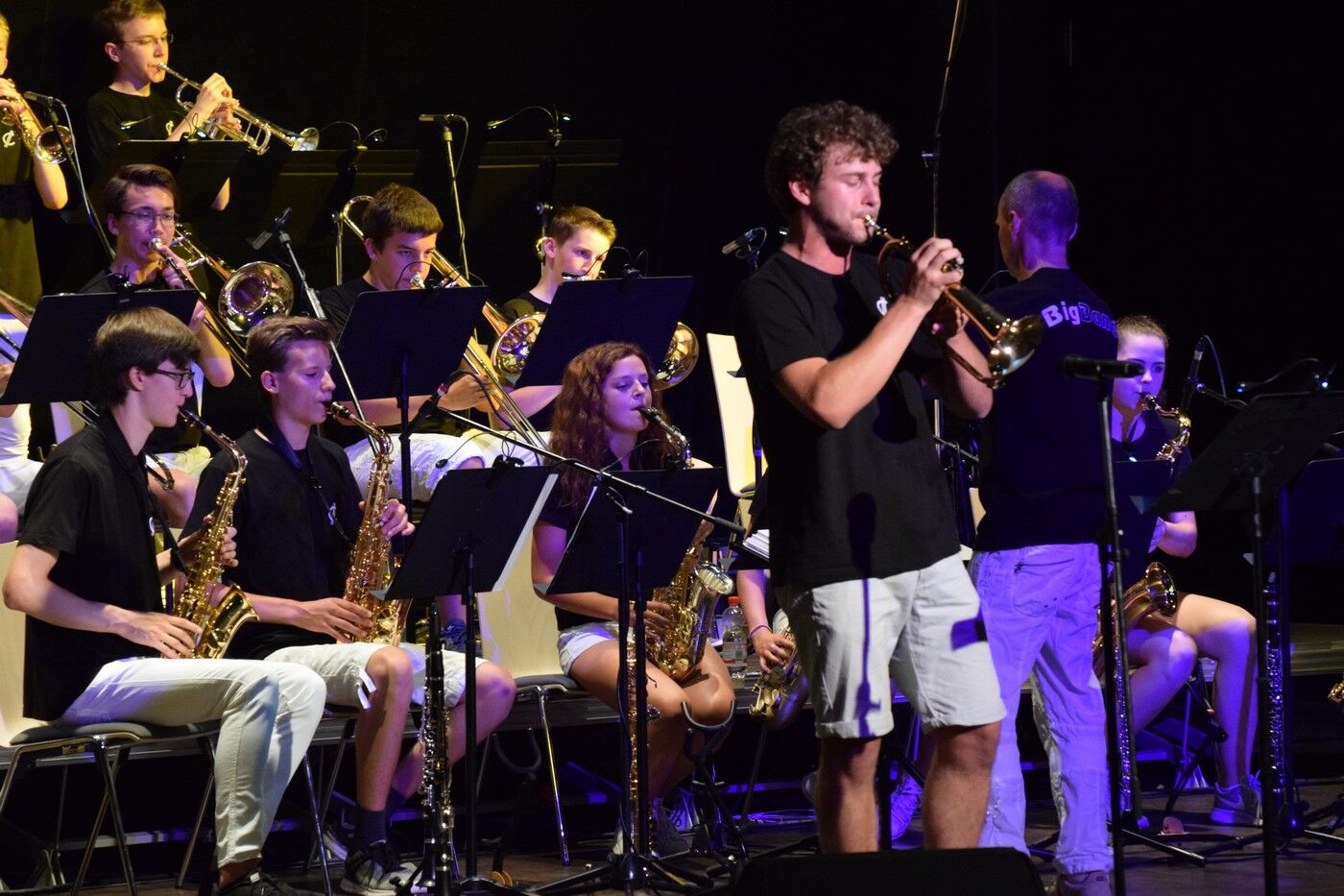 Mit Brian Setzers „Rock This Time“ sorgte die Camerloher-Bigband am Donnerstagabend (6.7.2017) gleich für einen rasanten Konzert-Start. Bei dieser bekannten Rock-Nummer ging die Post ab. Wie Moderator Julien Dumat, der kurzweilig und professionell durch den Abend führte, angekündigt hatte, blieb im Publikum kein Fuß unbewegt am Boden. Und so schwungvoll ging’s dann auch weiter. Die vier Abiturientinnen und Abiturienten, die sich aus der Bigband verabschieden mussten, durften durch Solis noch einmal glänzen: Saxophonistin Laura Achatz in „Here, There & Everywhere“ (Beatles), Saxophonistin Anja Kirnberger in „Aigainst All Odda“ (Phil Collins), Trompeter Florian Apold in „Smoke Gets In Your Eyes“ (Otto Harbach, Jerome Kern) und Gitarrist Jakob Melzer in „Enter Sandman“ (Metallica).