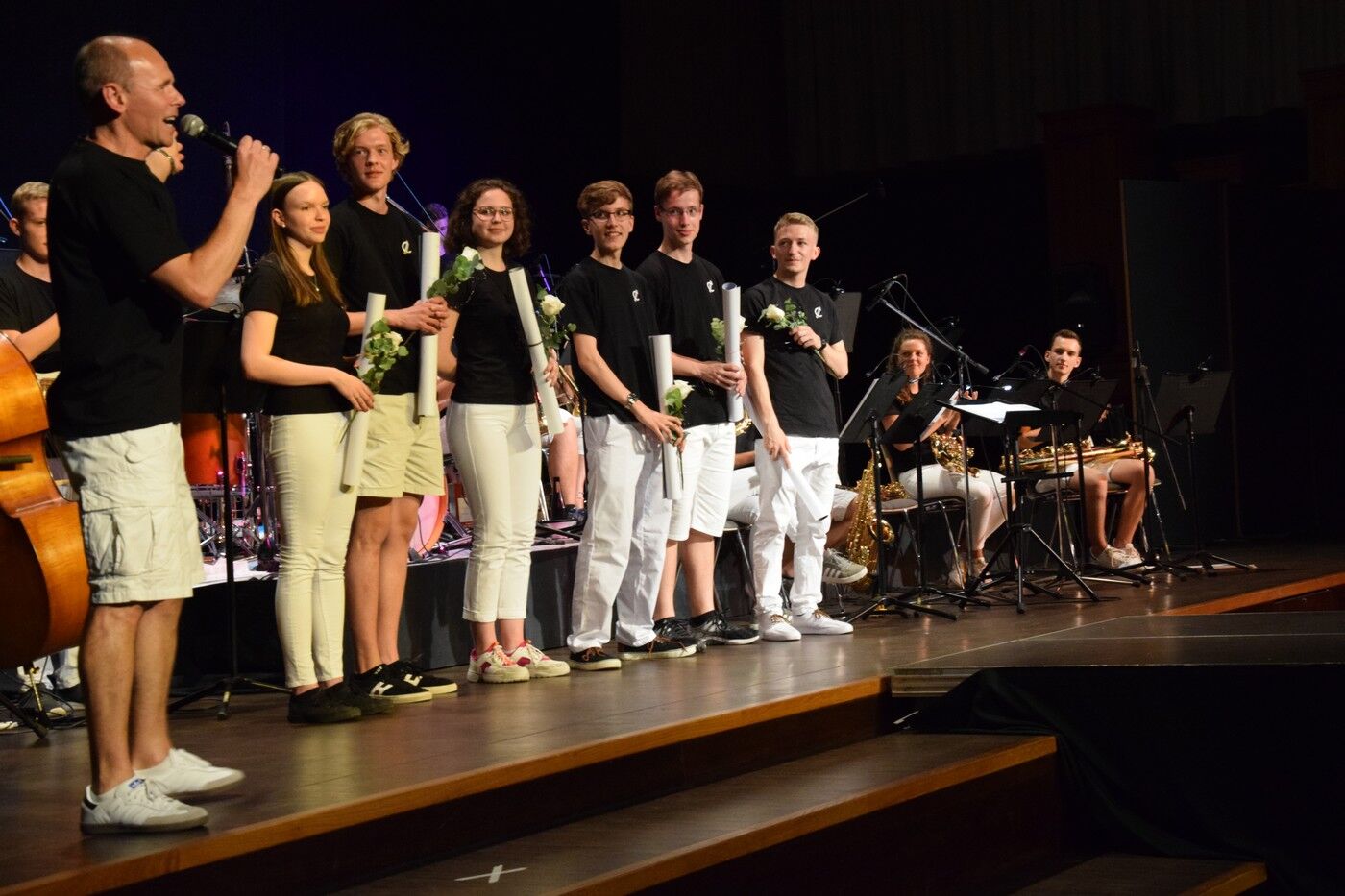 Die Qualität der Camerloher-Bigband zeigt sich nicht in ihren dynamisch und fehlerfrei vorgetragenen Nummern, sondern auch darin, dass fast alle Mitglieder in der Lage sind, mit Solis zu glänzen. So gab es in allen Stücken gleich mehrere Soloauftritte. Und so durften sich vor allem die scheidenden Abiturientinnen und Abiturienten jeweils mit einem langen Solo aus der Band verabschieden: Aaron Schwarz mit einem Trompetensolo, Michael Nauderer mit einem am Flügelhorn. Cordula Kraetzl am Tenorsaxophon im Wechsel mit Emanuel Kirschner am Vibraphon. Und schließlich Bernhard Mottinger mit einem mitreißendem Schlagzeugsolo.