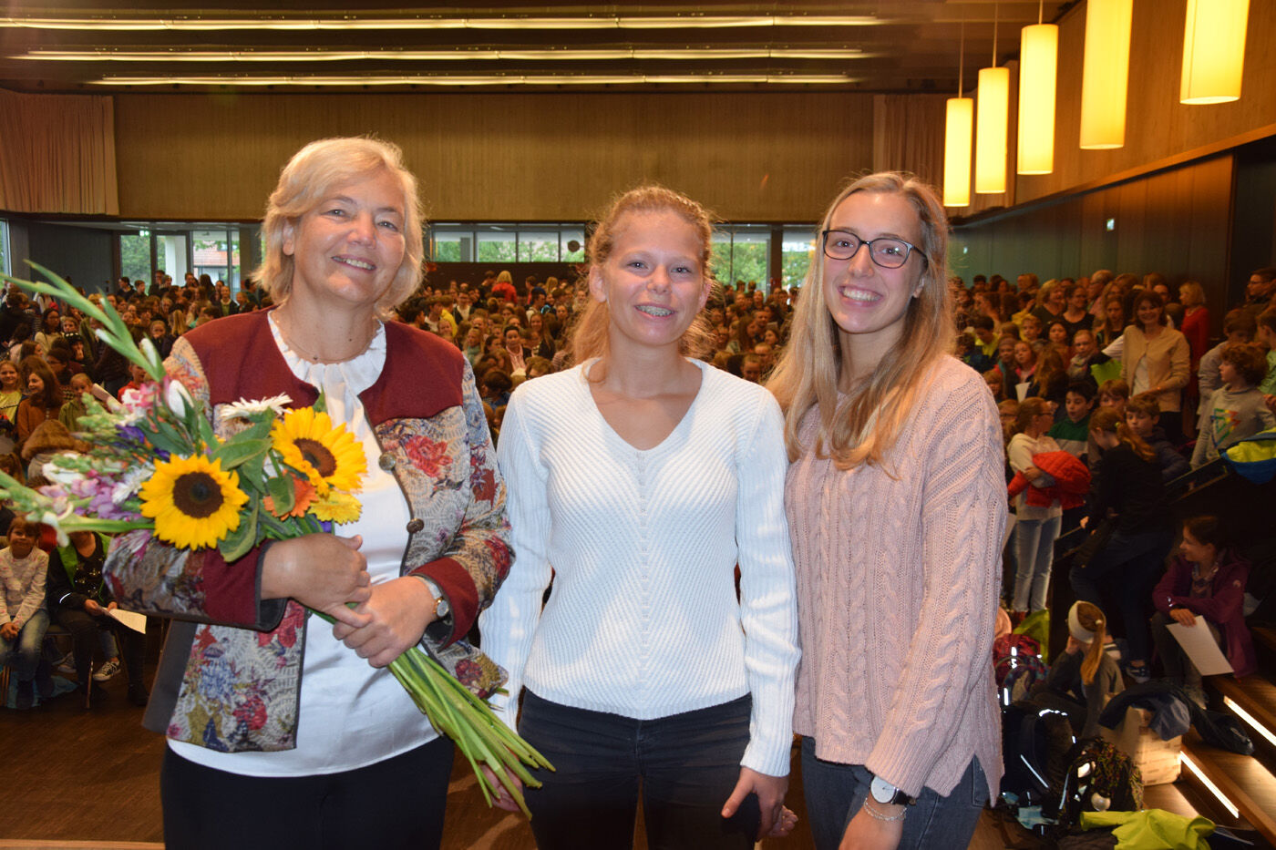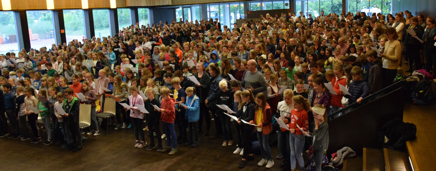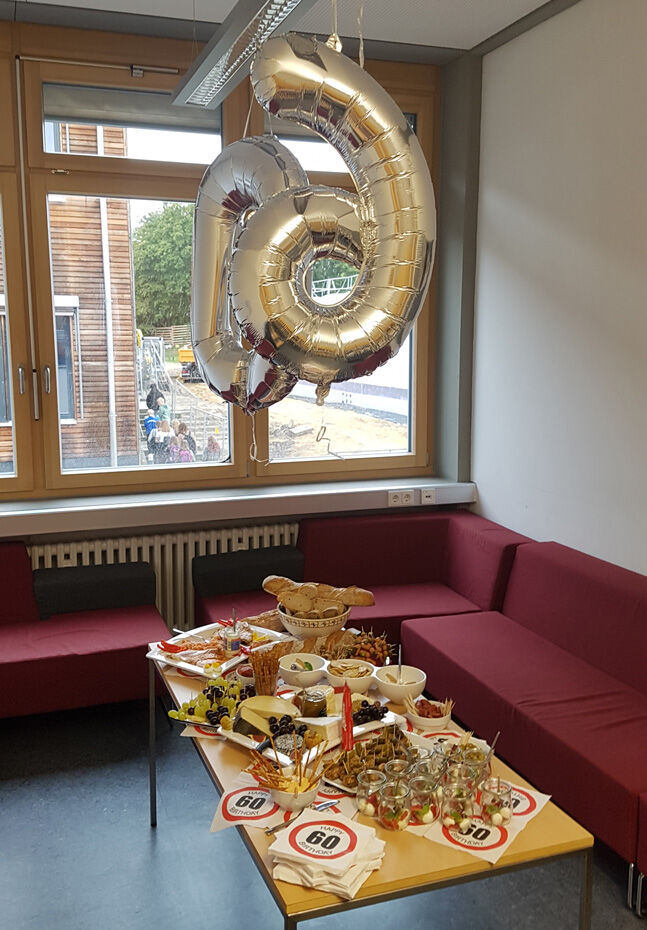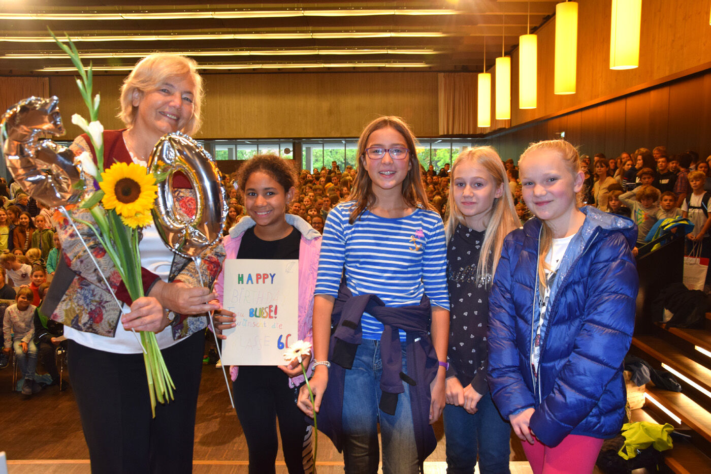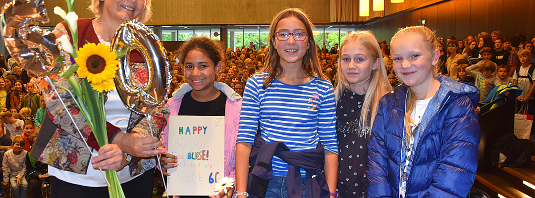 Schulleiterin Andrea Bliese hatte ihren 60. Geburtstag und die Schulfamilie wollte ihr natürlich ausgiebig gratulieren. Wie es sich für ein Musisches Gymnasium gehört, stimmten die 800 Schülerinnen und Schüler und die hundert Lehrkräfte mit den Sekretärinnen ein Geburtstagsständchen an. Die Fachschaft Musik hatte einen Trinkkanon von Wolfgang Amadeus Mozart umgetextet, in dem es u.a. heißt: „Es leb‘ die Chefin … Wer könnt auf Erden wicht’ger sein? Vivat, vivat, vivat, sie lebe Hoch.“ Das Geburtstagskind, Schulleiterin Andrea Bliese, war sichtlich überrascht und gerührt: „So ein Geburtstagsständchen, das von so vielen gesungen wird, ist schon sehr beeindruckend.“ Damit nicht genug: Jede Klasse und die SMV schickte eine Abordnung zur „Chefin“ und überreichte neben Blumen auch ein eigens gestaltetes Bild zum runden Geburtstag. Und von ihrem Kollegium erhielt die Schulleiterin natürlich auch ein Geschenk. sp