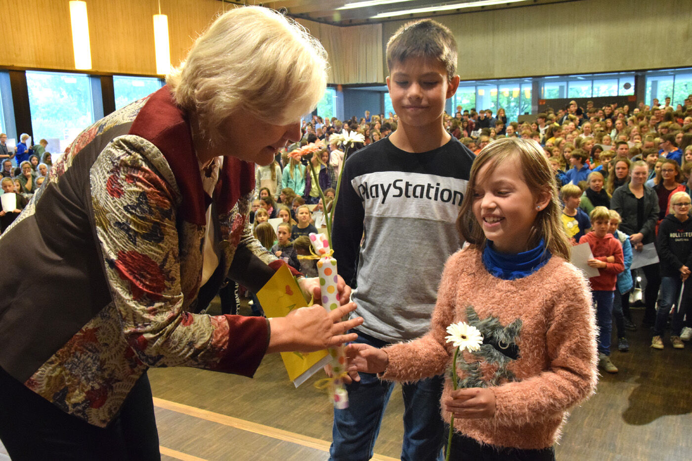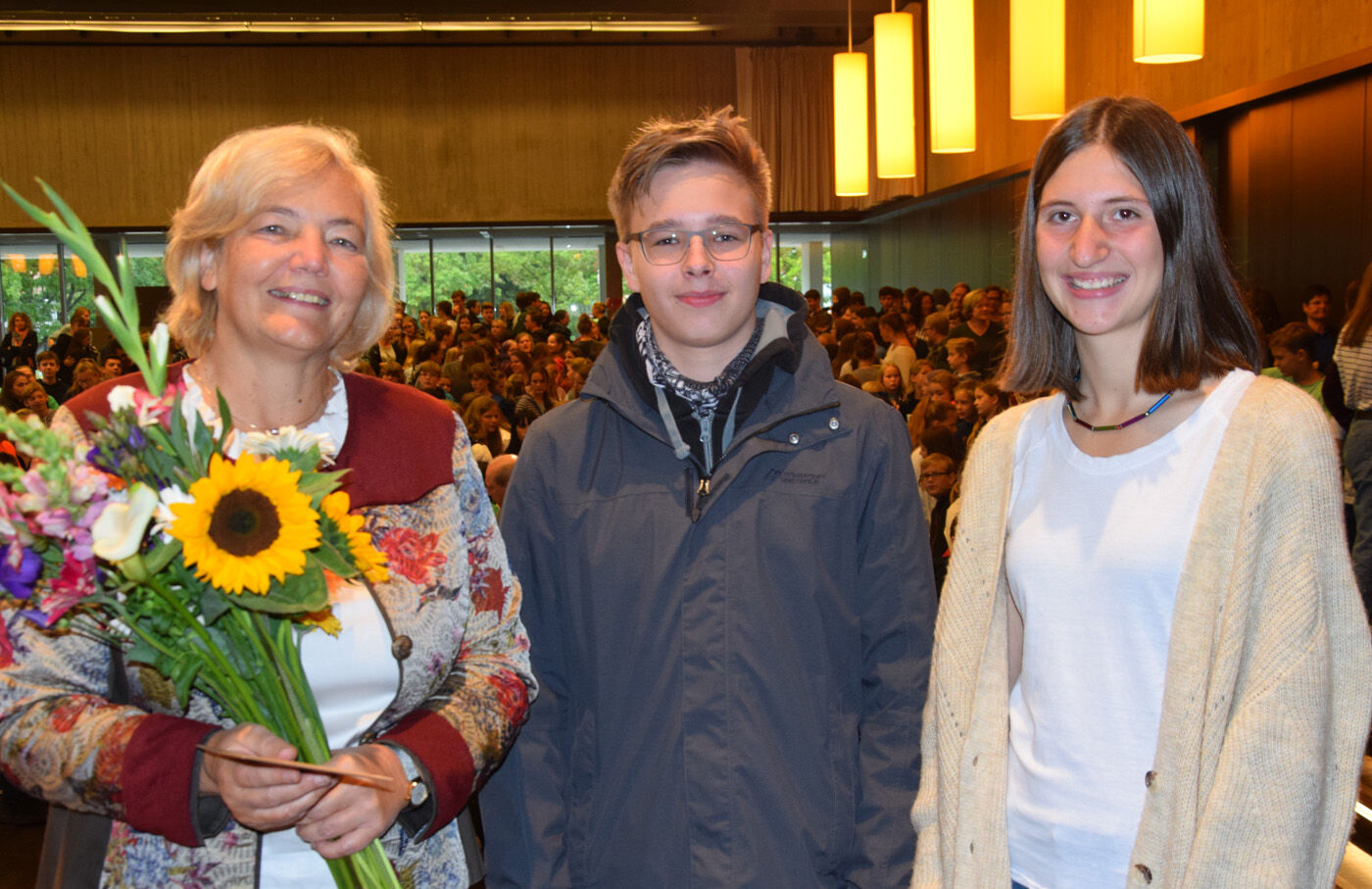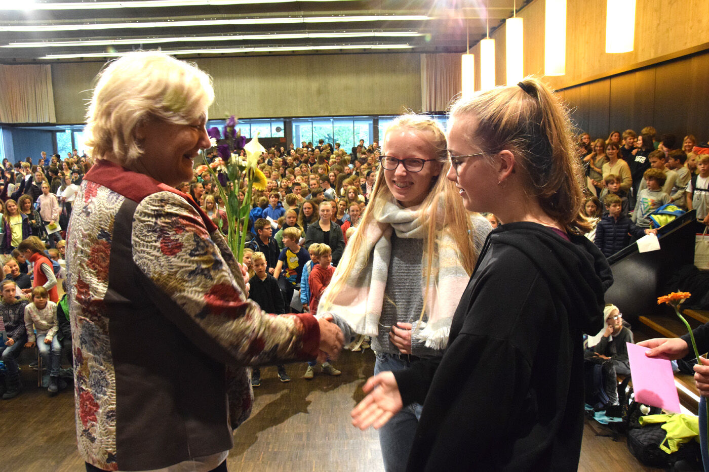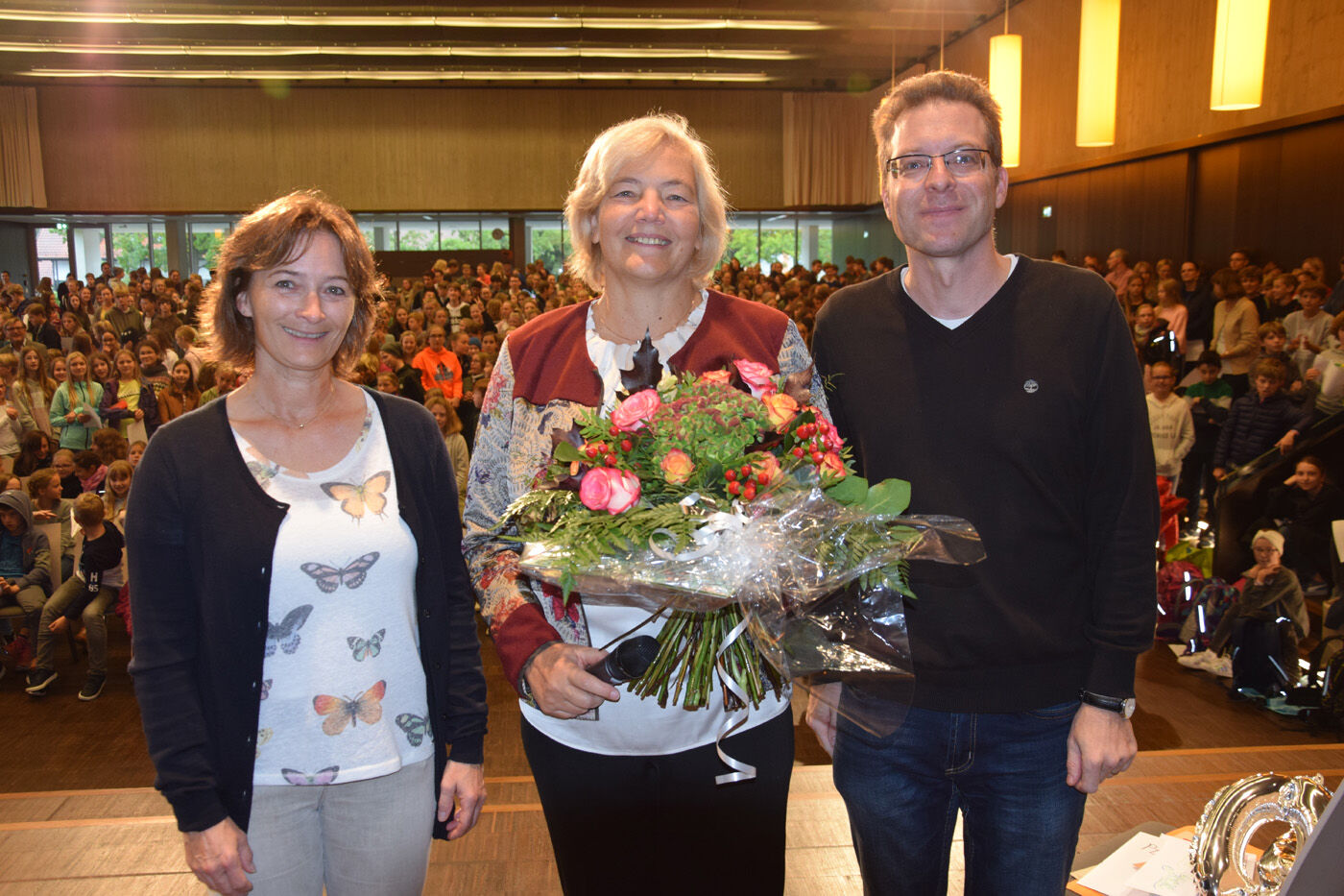 Schulleiterin Andrea Bliese hatte ihren 60. Geburtstag und die Schulfamilie wollte ihr natürlich ausgiebig gratulieren. Wie es sich für ein Musisches Gymnasium gehört, stimmten die 800 Schülerinnen und Schüler und die hundert Lehrkräfte mit den Sekretärinnen ein Geburtstagsständchen an. Die Fachschaft Musik hatte einen Trinkkanon von Wolfgang Amadeus Mozart umgetextet, in dem es u.a. heißt: „Es leb‘ die Chefin … Wer könnt auf Erden wicht’ger sein? Vivat, vivat, vivat, sie lebe Hoch.“ Das Geburtstagskind, Schulleiterin Andrea Bliese, war sichtlich überrascht und gerührt: „So ein Geburtstagsständchen, das von so vielen gesungen wird, ist schon sehr beeindruckend.“ Damit nicht genug: Jede Klasse und die SMV schickte eine Abordnung zur „Chefin“ und überreichte neben Blumen auch ein eigens gestaltetes Bild zum runden Geburtstag. Und von ihrem Kollegium erhielt die Schulleiterin natürlich auch ein Geschenk. sp