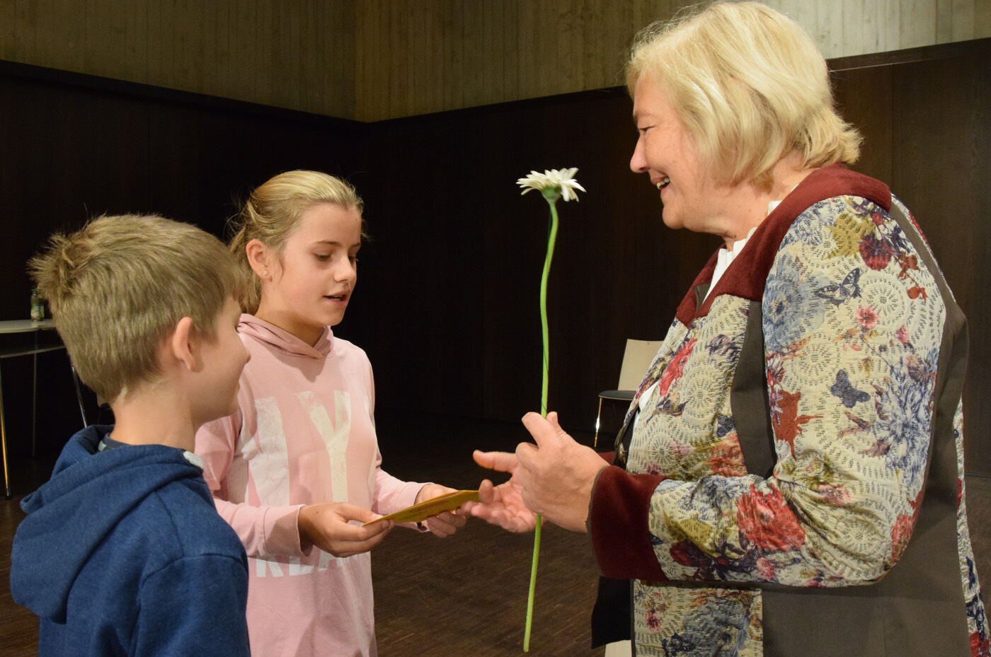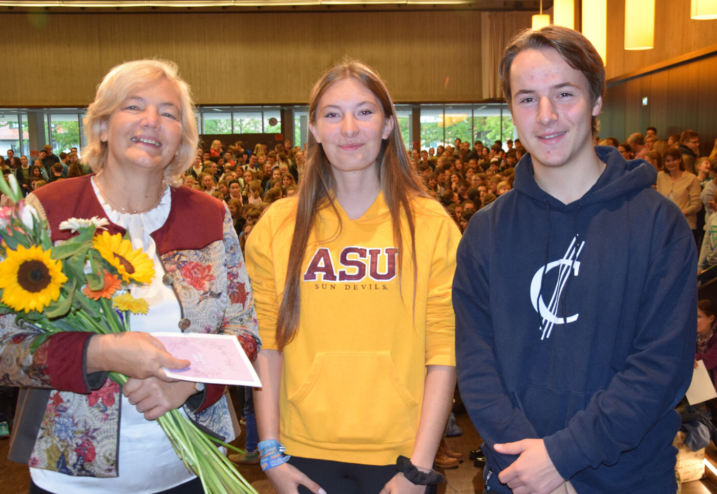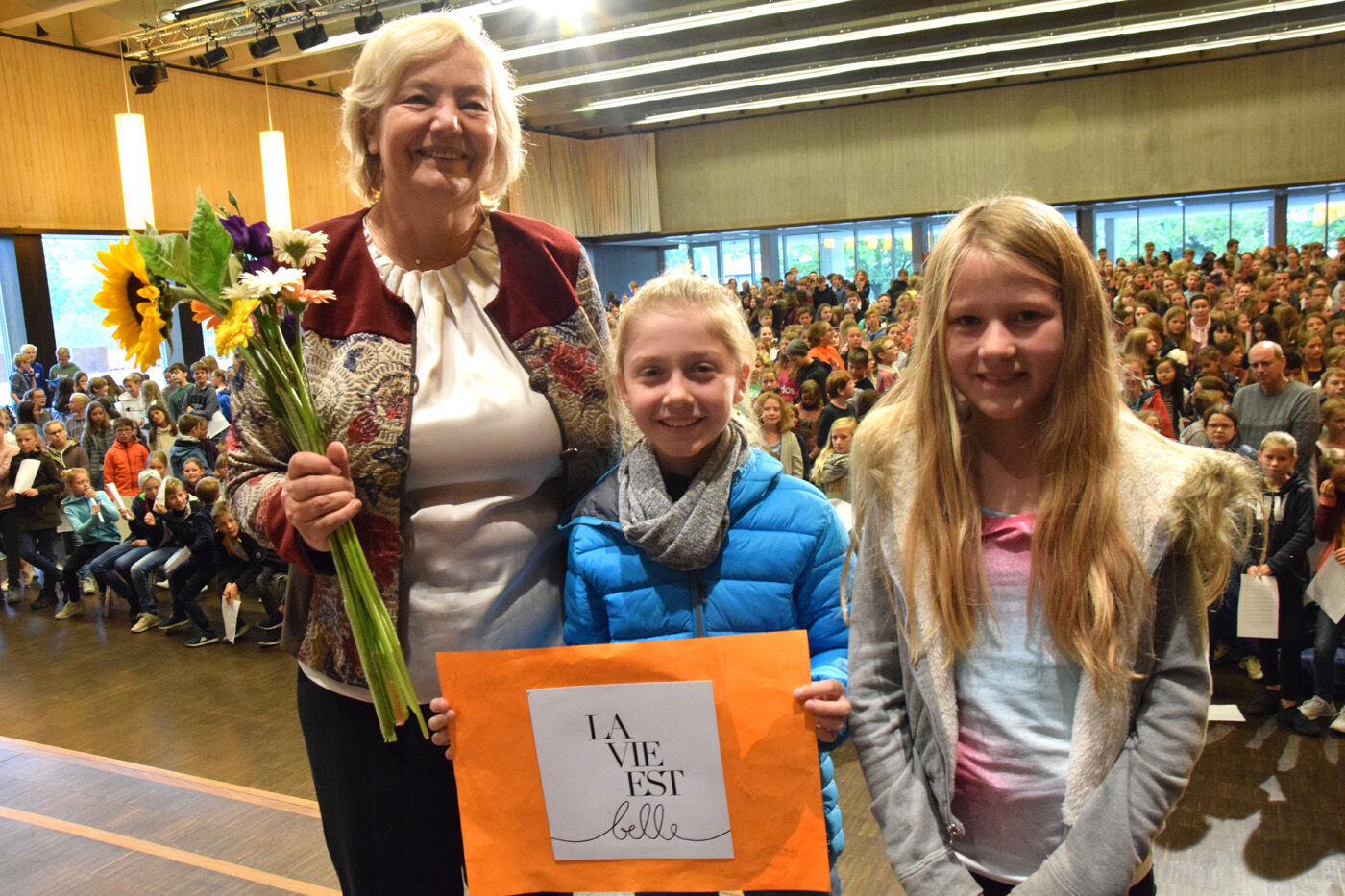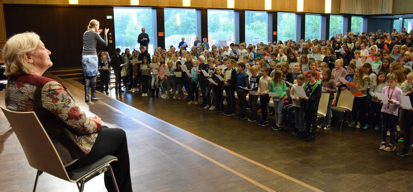 Schulleiterin Andrea Bliese hatte ihren 60. Geburtstag und die Schulfamilie wollte ihr natürlich ausgiebig gratulieren. Wie es sich für ein Musisches Gymnasium gehört, stimmten die 800 Schülerinnen und Schüler und die hundert Lehrkräfte mit den Sekretärinnen ein Geburtstagsständchen an. Die Fachschaft Musik hatte einen Trinkkanon von Wolfgang Amadeus Mozart umgetextet, in dem es u.a. heißt: „Es leb‘ die Chefin … Wer könnt auf Erden wicht’ger sein? Vivat, vivat, vivat, sie lebe Hoch.“ Das Geburtstagskind, Schulleiterin Andrea Bliese, war sichtlich überrascht und gerührt: „So ein Geburtstagsständchen, das von so vielen gesungen wird, ist schon sehr beeindruckend.“ Damit nicht genug: Jede Klasse und die SMV schickte eine Abordnung zur „Chefin“ und überreichte neben Blumen auch ein eigens gestaltetes Bild zum runden Geburtstag. Und von ihrem Kollegium erhielt die Schulleiterin natürlich auch ein Geschenk. sp