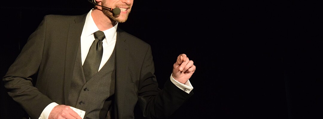 „Credo“ ist Lateinisch und bedeutet „Ich glaube“. Was soll man nach seinem knapp zweistündigen sehr unterhaltsamen Programm Andreas Maier alles glauben. Na gut! Er sagte selber, dass unsere Wahrnehmung sehr selektiv sei, wir nur das sehen, was wir sehen wollen. Das machte er deutlich an dem optischen Trick mit dem Schatten einer Flasche, die sich in den Schatten eines Weinglases verwandelt. Er verriet den Trick. So weit so gut! Die Zuschauer waren ihrer Illusion durch die Erklärung von Andreas Maier beraubt. Als er dann freilich aus einer Papiertüte eine Flasche Wein zog, die wieder reinsteckte, stattdessen ein volles Weinglas rausholte und dann sofort die Papiertüte zerknüllte, war das Staunen im Publikum wieder groß.