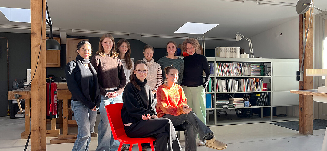 Mitarbeiter Max Rohregger stellte auf sehr anschauliche Weise vor, wie einige Klassiker, z.B. der Stuhl „Houdini" (in leuchtendem Orange zu sehen auf dem Gruppenbild) oder die Leuchte „Ayno" entwickelt wurden, gab aber auch Einblick in laufende Projekte. Die Schülerinnen hatten Gelegenheit über Fragen ins Gespräch zu kommen und konnten durch ganz konkrete Beispiele wie Skizzenbücher, Materialproben, Reihen von Prototypen, Anwendungsmöglichkeiten von Entwurfsprogrammen und 3D-Druckern einen Einblick in unterschiedliche Designprojekte bekommen. Besonders anschaulich wurde dabei, wie lange die Entwicklungsphase dauert, bis ein fertiges Produkt auf den Markt kommen kann und dass es im kreativen Prozess unabdingbar ist, erste Entwürfe immer wieder zu überarbeiten und auf Rückmeldungen aus dem Team oder durch den Auftraggeber zu reagieren oder neue Materialien und technische Lösungen zu finden. Das hängt auch mit dem hohen Arbeitsethos zusammen, dem sich das Studio Stefan Diez verschrieben hat. Eine zentrale Rolle bei allen Projekten kommt der Nachhaltigkeit zu. Es ist allen Mitarbeitern ein besonderes Anliegen, die Produkte so zu entwickeln, dass sie eine möglichst lange Nutzungsdauer besitzen, Einzelteile ausgetauscht und repariert werden können und es nach Möglichkeit vermieden wird, Verbundwerkstoffe einzusetzen, so dass die Materialien am Ende des Gebrauchs sauber voneinander getrennt und einem Recycling zugeführt werden können. Neben einem niedrigen Ressourcenverbrauch bei der Herstellung ist dem Designbüro auch ein möglichst platzsparender Transport wichtig. Die Umsetzung dieser hohen Ziele erhöht zwar den Entwicklungsaufwand, ermöglicht es aber im Sinne des „Circular Design" auch, gesellschaftliche Verantwortung zu übernehmen und das Mindset für den Ressourcenverbrauch in der Zukunft positiv zu beeinflussen.