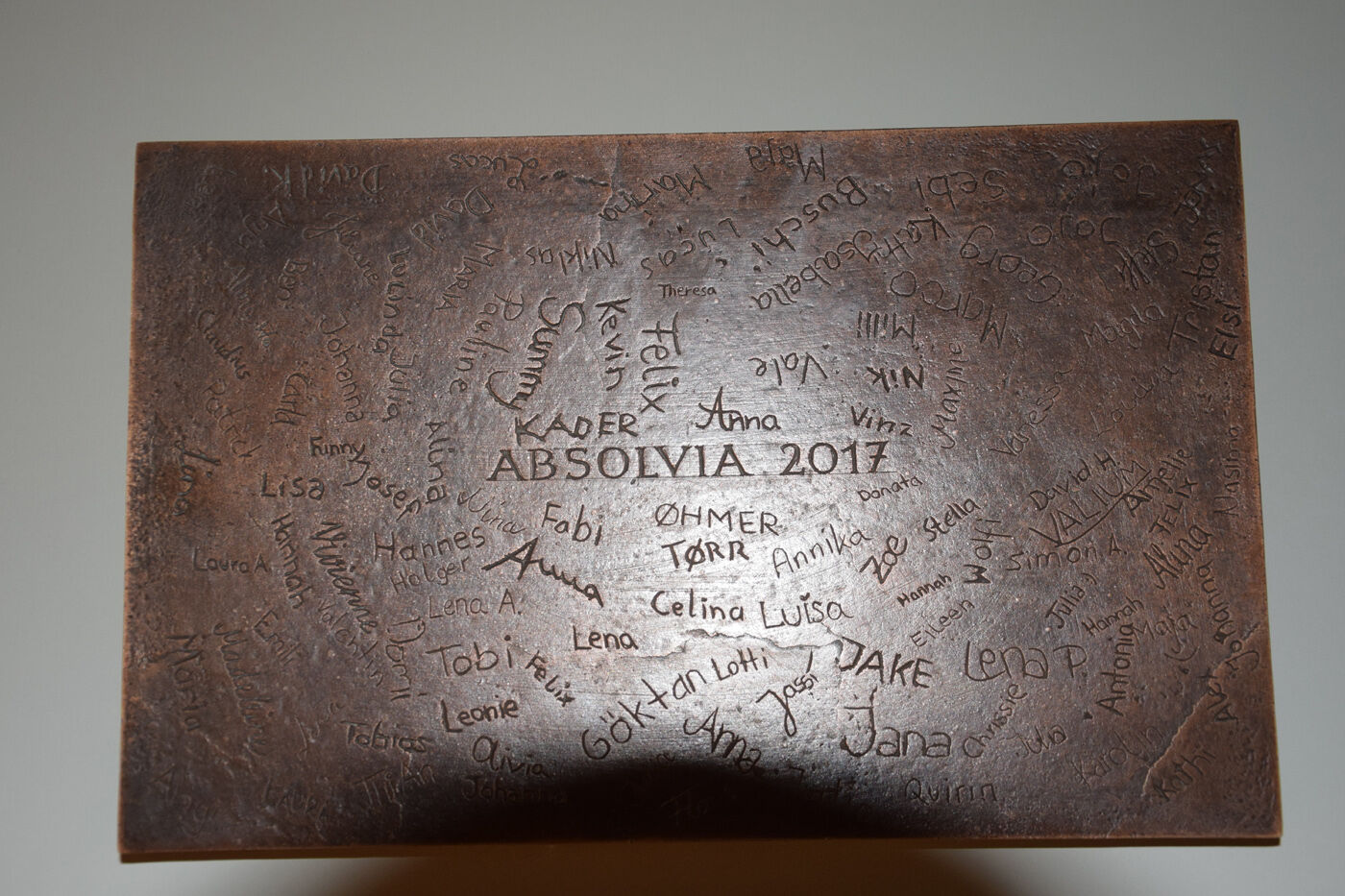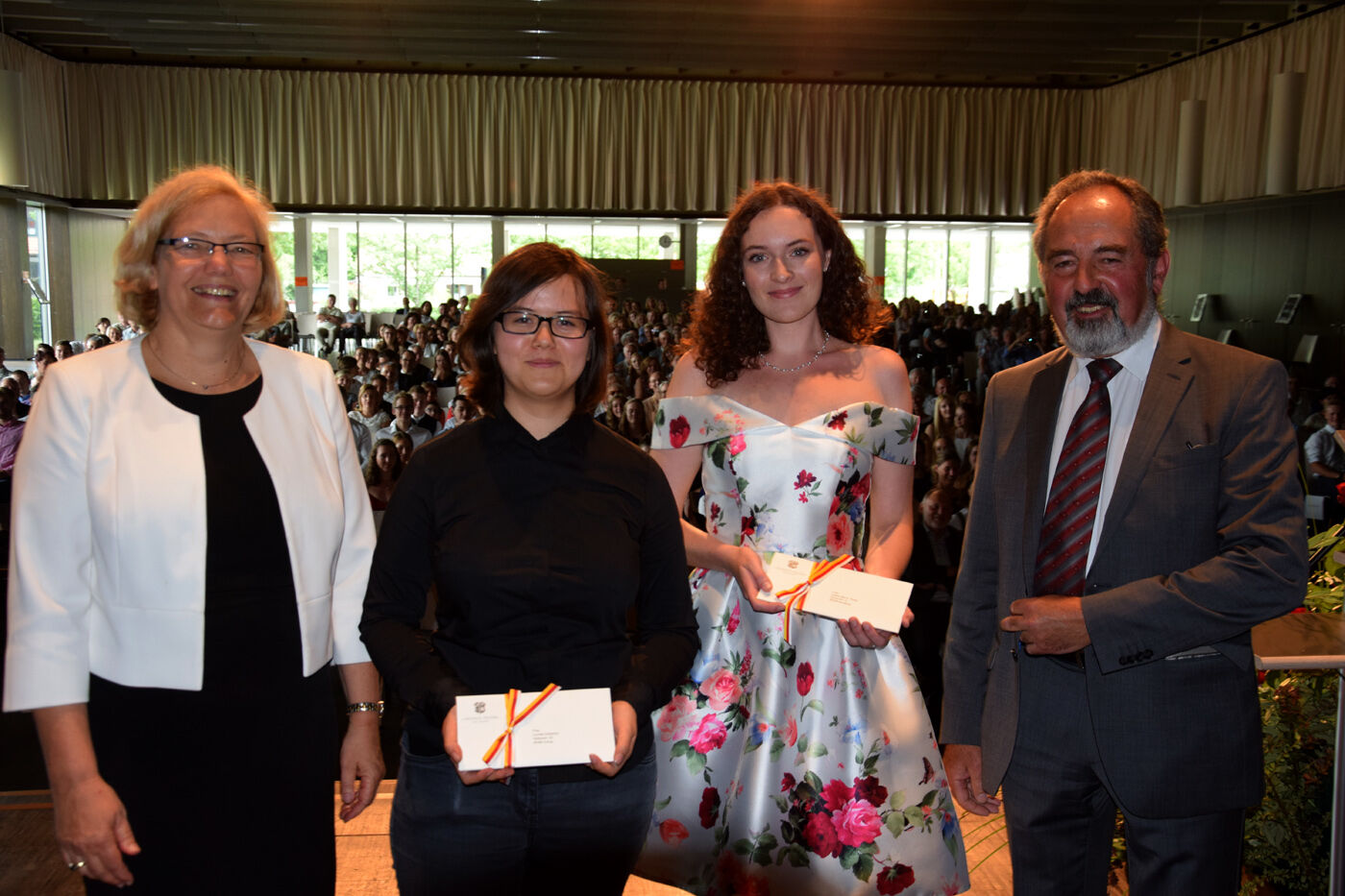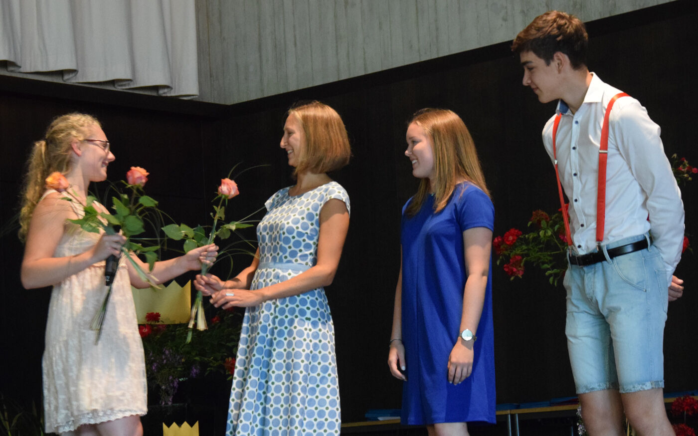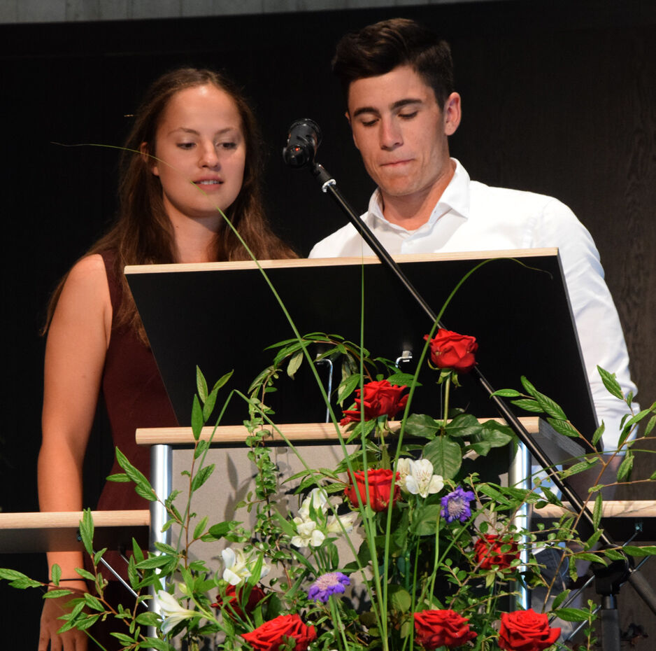 Ein Highlight der Verabschiedung war zweifelsfrei die Rede der Vertreter der Absolvia 2017. Carla Dörffel und Lucas Obermeier präsentierten in ihrer geschliffenen, elaborierten und kurzweiligen Rede einen Rückblick auf zwölf Jahre Schulzeit – meist positiv, aber durchaus auch mit kritischen Randbemerkungen. Sie bedankten sich bei allen, die ihnen auf dem langen Weg zum Abitur geholfen haben. Dank an die Eltern, an die Lehrkräfte, die ihnen bis zum Schluss unter die Arme gegriffen haben, Dank an die Schulleitung für die Offenheit, Dank aber vor allem an Oberstufenkoordinatorin Silvia Betz. „Silvia, vielen Dank für Dein Engagement, für Dein Einfühlungsvermögen und Dein Organisationstalent“, so Carla Dörffel und Lucas Obermeier. Am Ende lautete die Botschaft der beiden: Einerseits blicke man mit einem lachenden Auge auf die schöne Schulzeit zurück, anderseits müsse man aber den Blick auch nach vorne richten. „Wohin unsere Reise jetzt geht, ist noch unklar. Aber uns stehen alle Möglichkeiten offen.“