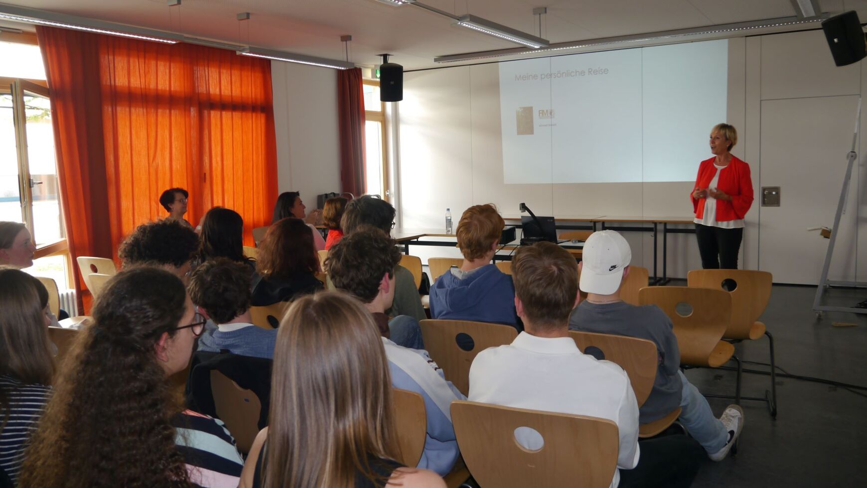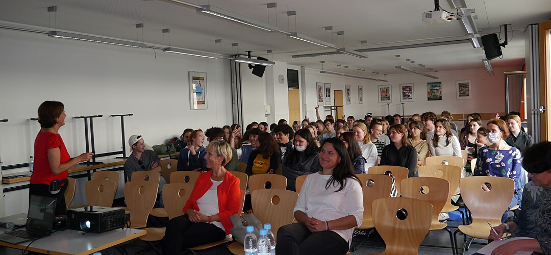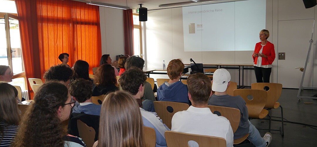 „Wir bringen in Unternehmen die passenden Menschen zusammen. So wie Parship – nur nicht romantisch …“ Mit diesem Satz brachte Rosmarie Steininger, Gründerin und Geschäftsführerin der Chemistree GmbH in München, ihre Geschäftsidee anschaulich auf den Punkt und hatte zugleich die Lacher und die Aufmerksamkeit des Publikums auf ihrer Seite. Rund 80 Schülerinnen und Schüler der Q11 waren der Einladung von Katrin Westermeier und der IHK für München und Oberbayern gefolgt und wollten Frau Steininger kennen lernen und dabei vor allem erfahren, was sie daran fasziniert, Unternehmerin zu sein. „Die Selbstständigkeit als berufliche Option kann gar nicht früh genug in die Köpfe der Jugendlichen, insbesondere der Mädchen gepflanzt werden“, betonte Elfi Kerschl, IHK-Referatsleiterin für Fachkräfte, Weiterbildung, Frauen in der Wirtschaft und Initiatorin der Einladung: „Deshalb haben wir die Reihe ‚Unternehmerinnen machen Schule‘ entwickelt.“ Im Rahmen dieser Reihe besuchen Unternehmerinnen den Schulunterricht, erklären ihr Geschäftsmodell, beschreiben, was das Unternehmerinnentum ihnen bedeutet, was sie daran begeistert, und wirken so als Role-Model für zukünftige junge Gründer – und vor allem eben auch Gründerinnen.