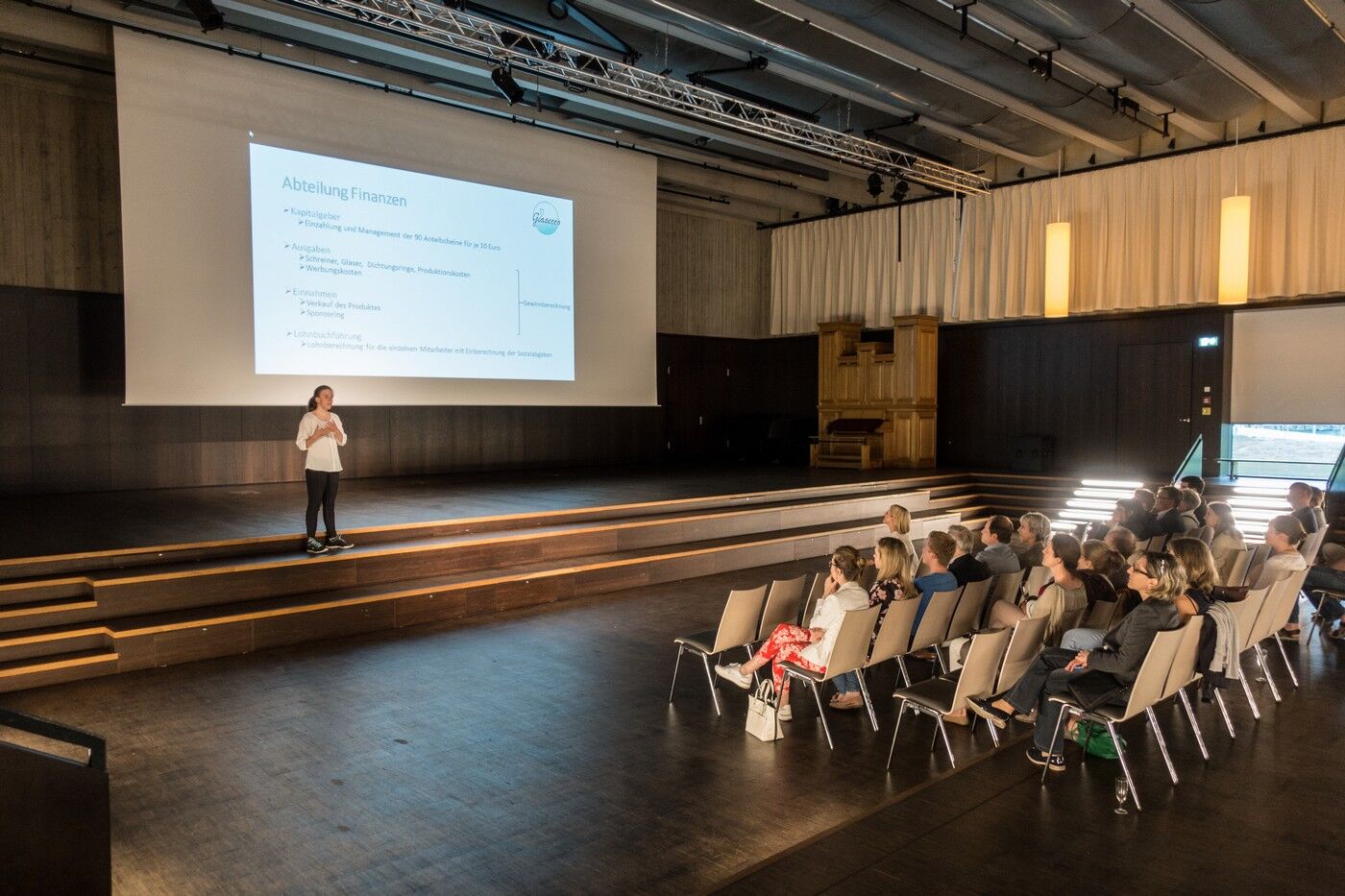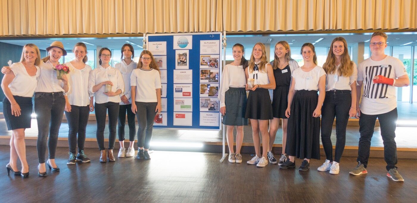 Am 06. Juni 2019 fand in der Aula die erste Hauptversammlung des Schüler-Unternehmens „glasecco“ statt. Im Rahmen des P-Seminars „Wirtschaftsunternehmen“ mit Leitfach Wirtschaft und Recht haben wir im März unser eigenes Unternehmen gegründet, welches unser gleichnamiges Produkt „glasecco“ herstellt und vermarktet. „glasecco“ ist ein nachhaltiges Produkt, bestehend aus einem sehr schönen Glasgefäß aus Milchglas, das mit einem edlen Holzdeckel verschließbar ist und als Vorratsgefäß oder als Dekorationsobjekt Verwendung finden kann.