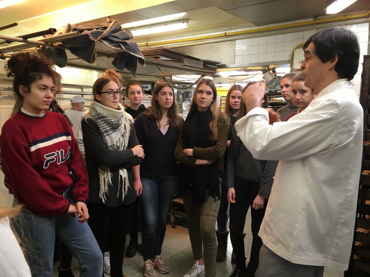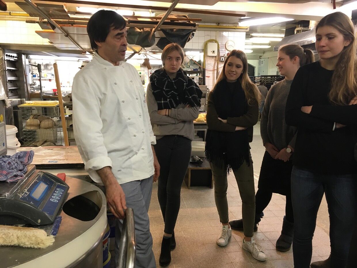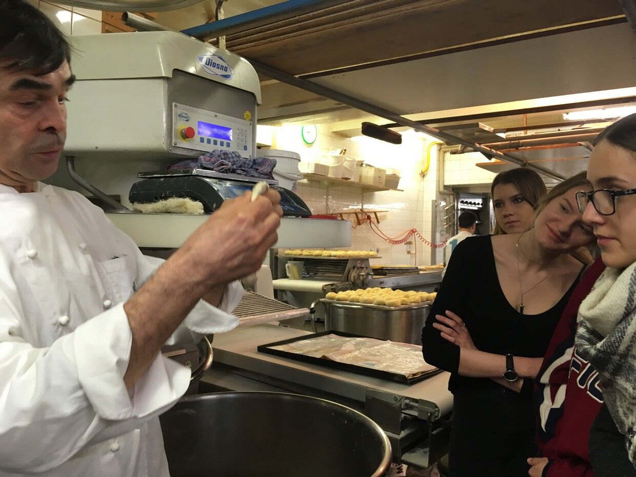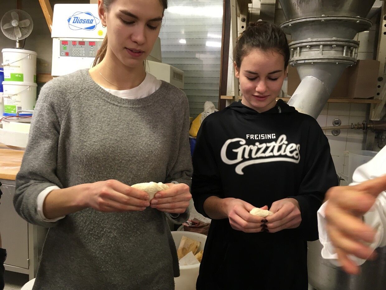 Der Bäckermeister Herr Muschler empfing uns am 15. Februar um halb acht in seiner Backstube, in der schon seit Stunden reger Betrieb herrschte. Mit einer Einführung über die chemischen Hintergründe (z.B. Milchsäuregärung, Hefekulturen, Sauerteig…), die für das Gelingen vieler Backwaren eine große Rolle spielen, konnten wir unser Wissen aus dem Biologie- und vor allem Chemieunterricht mit der Praxis des Backens verknüpfen. Anschließend bekamen wir einen Überblick über die verschiedenen Stationen, die anschließend zum fertigen Brot bzw. Gebäck führen: von der Auswahl des Mehls, über die Teigknetmaschine, bis hin zum Formen von Hand. Da unser Exkursionstermin in die Hochsaison für Krapfen fiel, konnten wir einen ganzen Raum der Backstube voller Krapfen betrachten und sogar selbst einige befüllen und probieren. Die ganze Zeit über hatten wir die Gelegenheit, unsere Fragen zu stellen und ein ganz neues Gefühl dafür zu erlangen, was alles passieren muss, damit wir in der Faschingszeit in einen Krapfen beißen (5000 Eier werden in der Woche allein für Faschingskrapfen aufgeschlagen!) oder am Sonntag morgen mit frischen Semmeln frühstücken können.