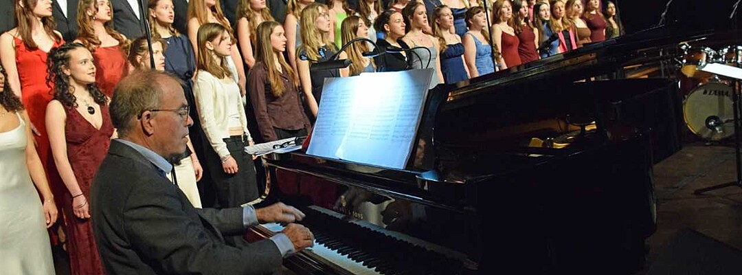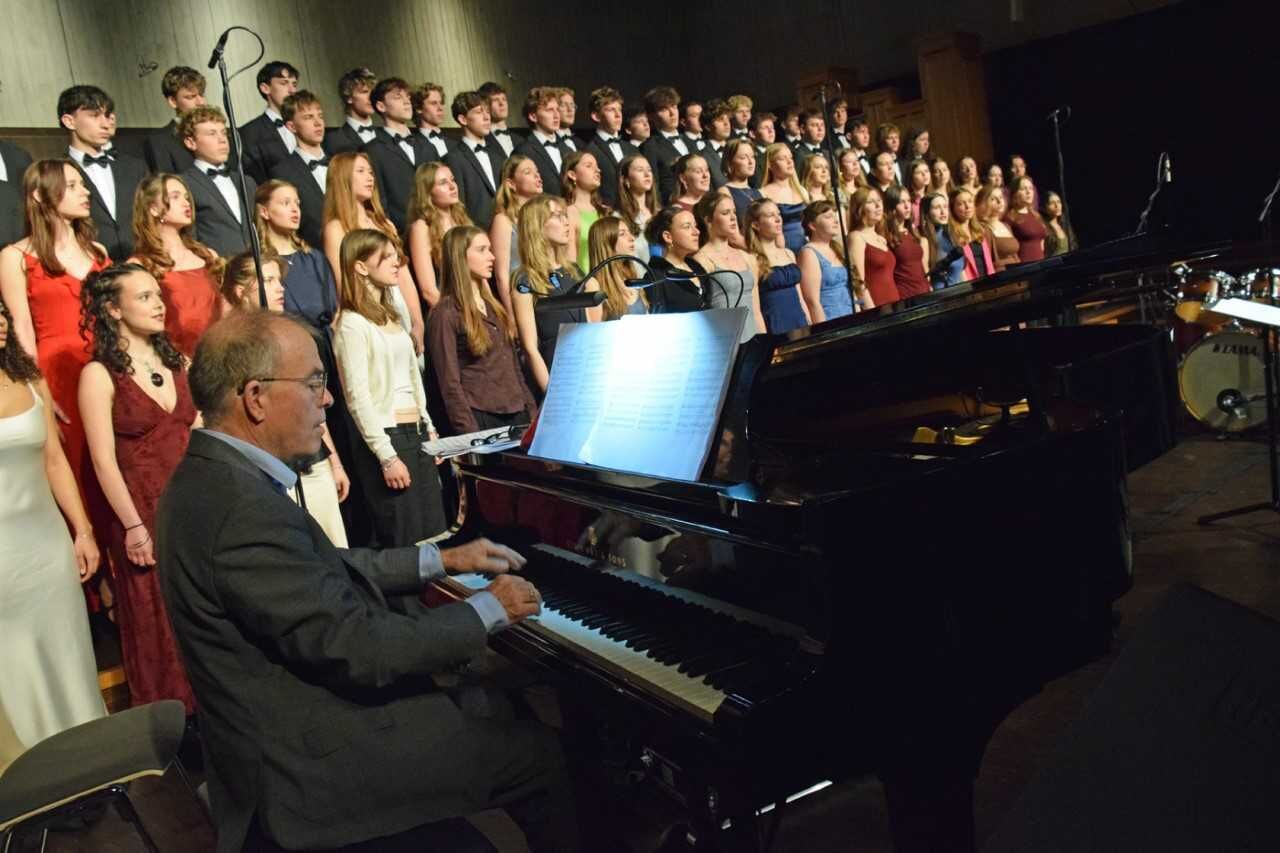 Nach der Pause ging es genauso fulminant und rauschend weiter, wie es vor der Pause geendet hatte. Den zweiten Teil eröffnete dieses Mal der Neunt- und Zehntklasschor mit „Sing“, dem sich der Elftklasschor mit „Human“ anschlosss. Das von Till Neumann dirigierte Sinfonieorchester begeisterte im Anschluss daran mit einem Mix aus der Filmmusik von „Jurassic Parc“. Anschließend brachte das gleiche Ensemble, das nun wieder Sebastian Brand leitete, die Aula mit „In the mood“ zum Swingen, bevor es kurz wehmütig wurde: Der Oberstufenchor trug zu Ehren Thomas Noichls den „Piano man“ vor, wobei Selbiger wie gefühlt schon immer am Camerloher am Klavier begleitete. Für den äußerst geschätzten Kollegen war es sein letztes Frühjahrskonzert, bevor er nach diesem Schuljahr wohlverdient den Ruhestand antreten wird. Der weltberühmten Hit „Africa“ wurde im großen Finale von allen Ensembles zusammen unter der Leitung von Mimi Neumair auf die Bühne gebracht – ein weiterer Gänsehautmoment, an dem es an den beiden Abenden jeweils viele gab.