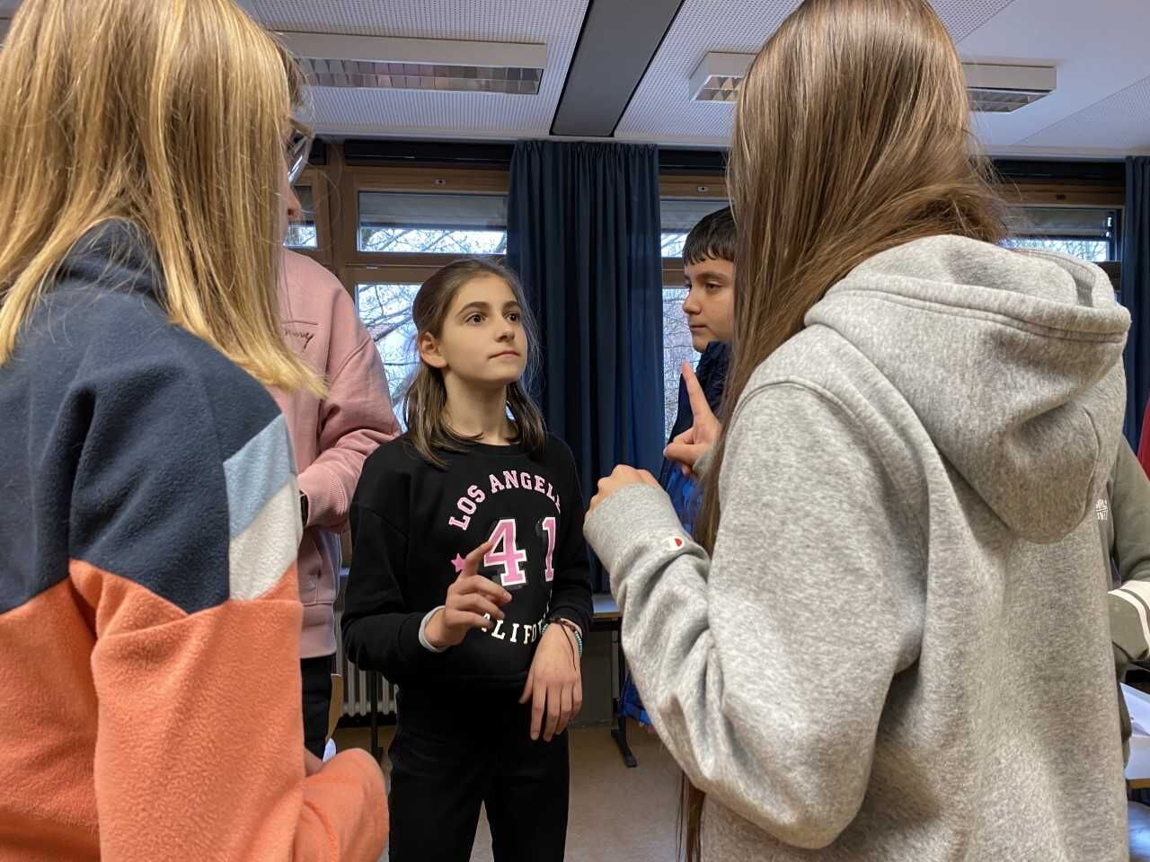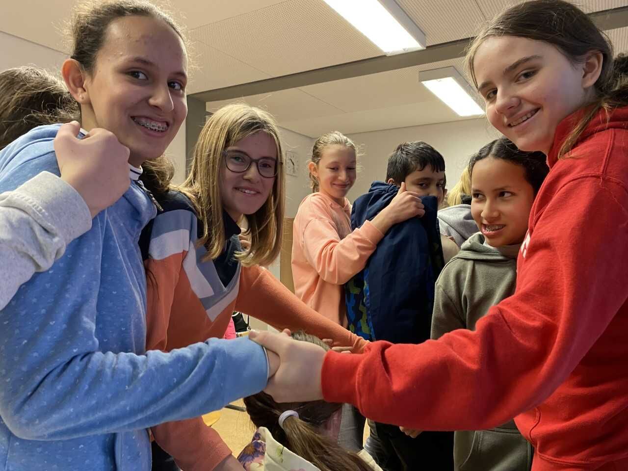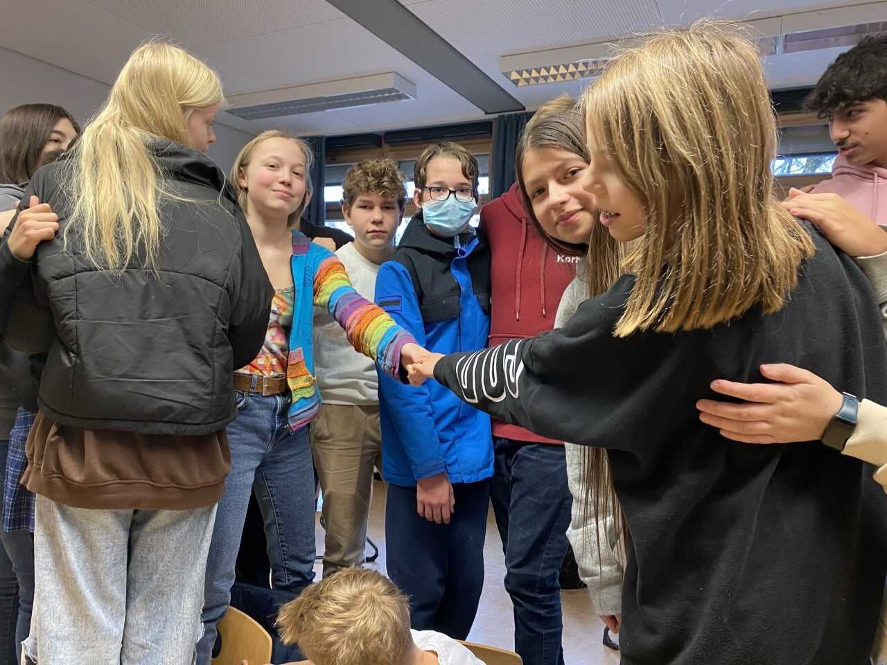 Wer ist wann geboren und wer ist der Jüngste oder die Älteste in der Klasse? – Eigentlich einfache Fragen, wenn man sie mit Worten klären kann. Aber wie schaut es aus, wenn die Klärung non-verbal innerhalb der Klasse erfolgen soll und dann gibt es auch noch den Auftrag, sich in der richtigen chronologischen Reihenfolge auf Stühlen aufzustellen. Da braucht es Geschick, genaues Beobachten der Zeichensprache des anderen, Unterstützung beim Positionswechsel auf den wackligen Stühlen: Kurzum es braucht Zusammenarbeit und Zusammenhalt! Und genau darum geht es bei „Zammgrauft“, dem Sozialtraining für die 7. Jahrgangsstufe.