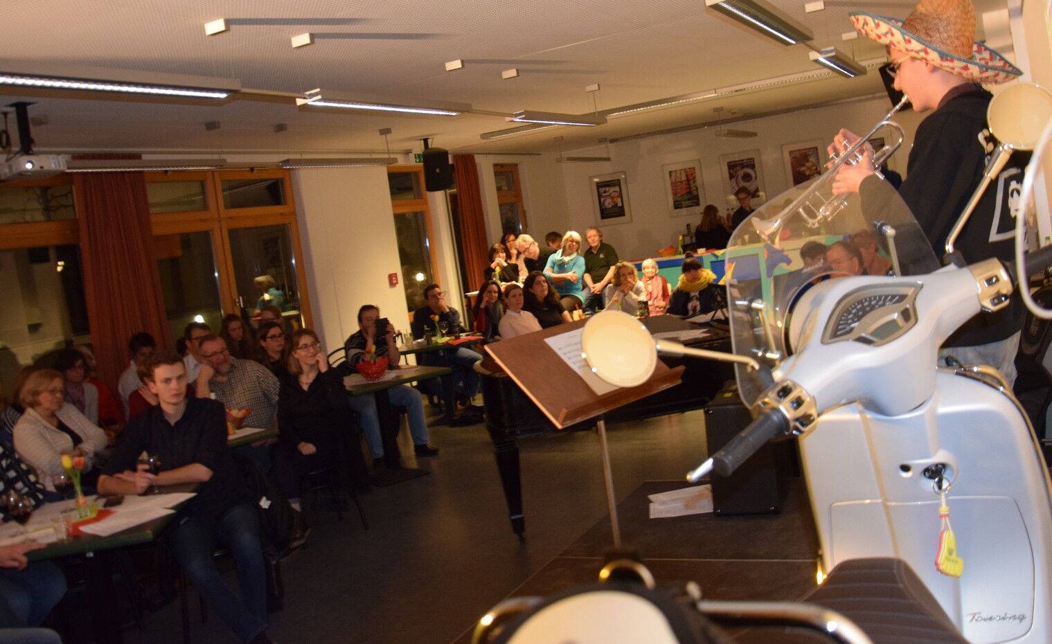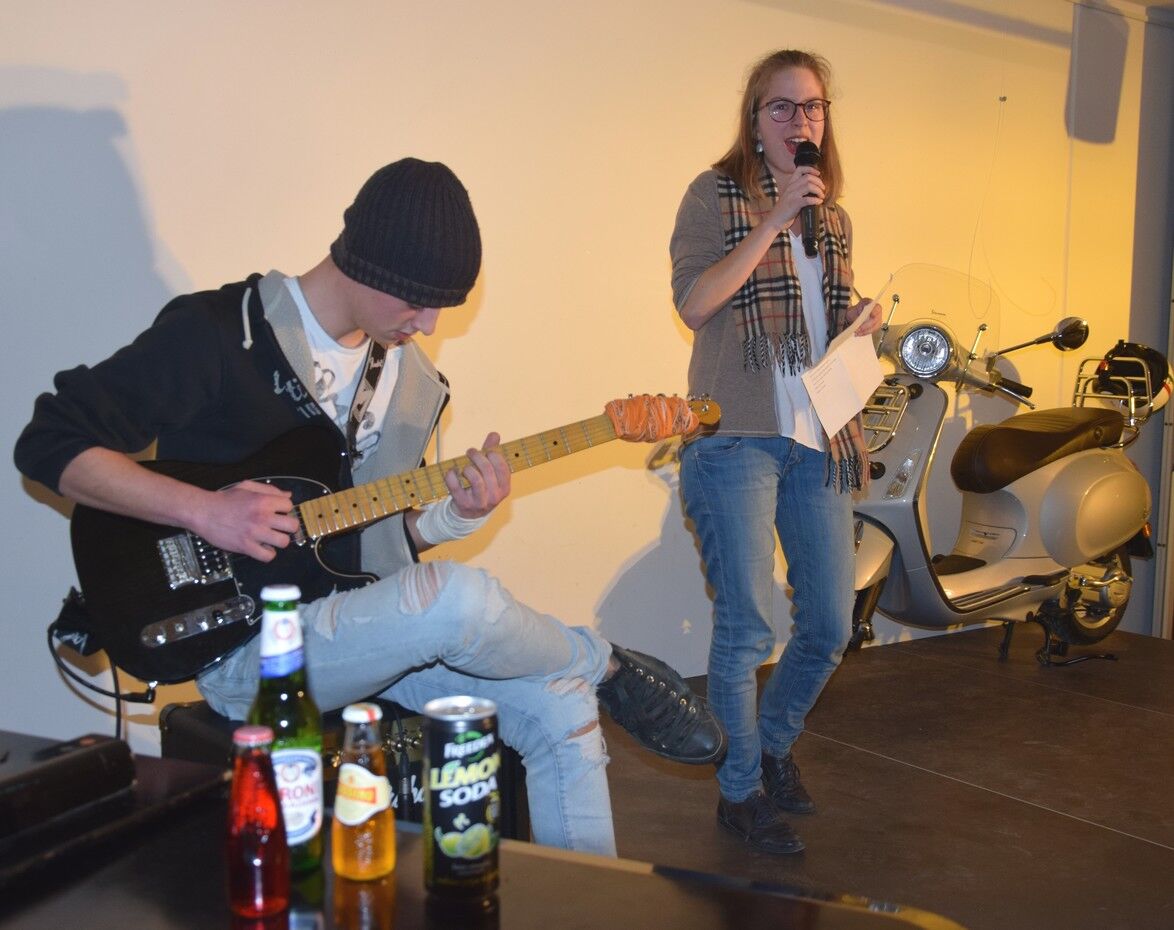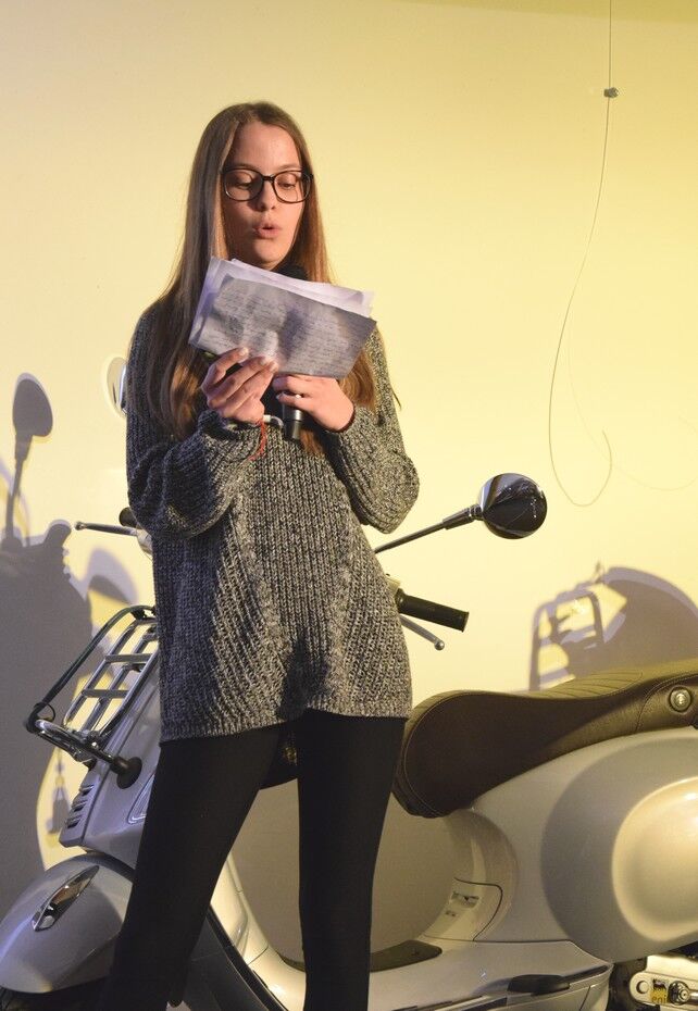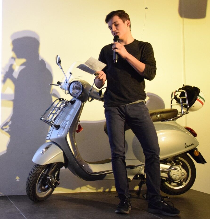 Darüber hinaus hatten die Schülerinnen und Schüler viele Fotos vom Schüler-Austausch mit Rovigo dabei. Amelie Endl verriet viele lustige Episoden des Austausches. Natürlich hatte das Café-Camerloher-Team keine Kosten und Mühen gescheut, um das Publikum mit echt italienischen Getränken und Snacks zu verwöhnen. Zum echten Italien gehört auch eine Vespa, die blitzblank auf der kleinen Bühne im Café Camerloher stand. Dazu mussten alle das bekannte italiensiche Lied von Luna Pop „50 Special“ singen. In dem geht es um die Vespa, die der Inbegriff der Freiheit ist.