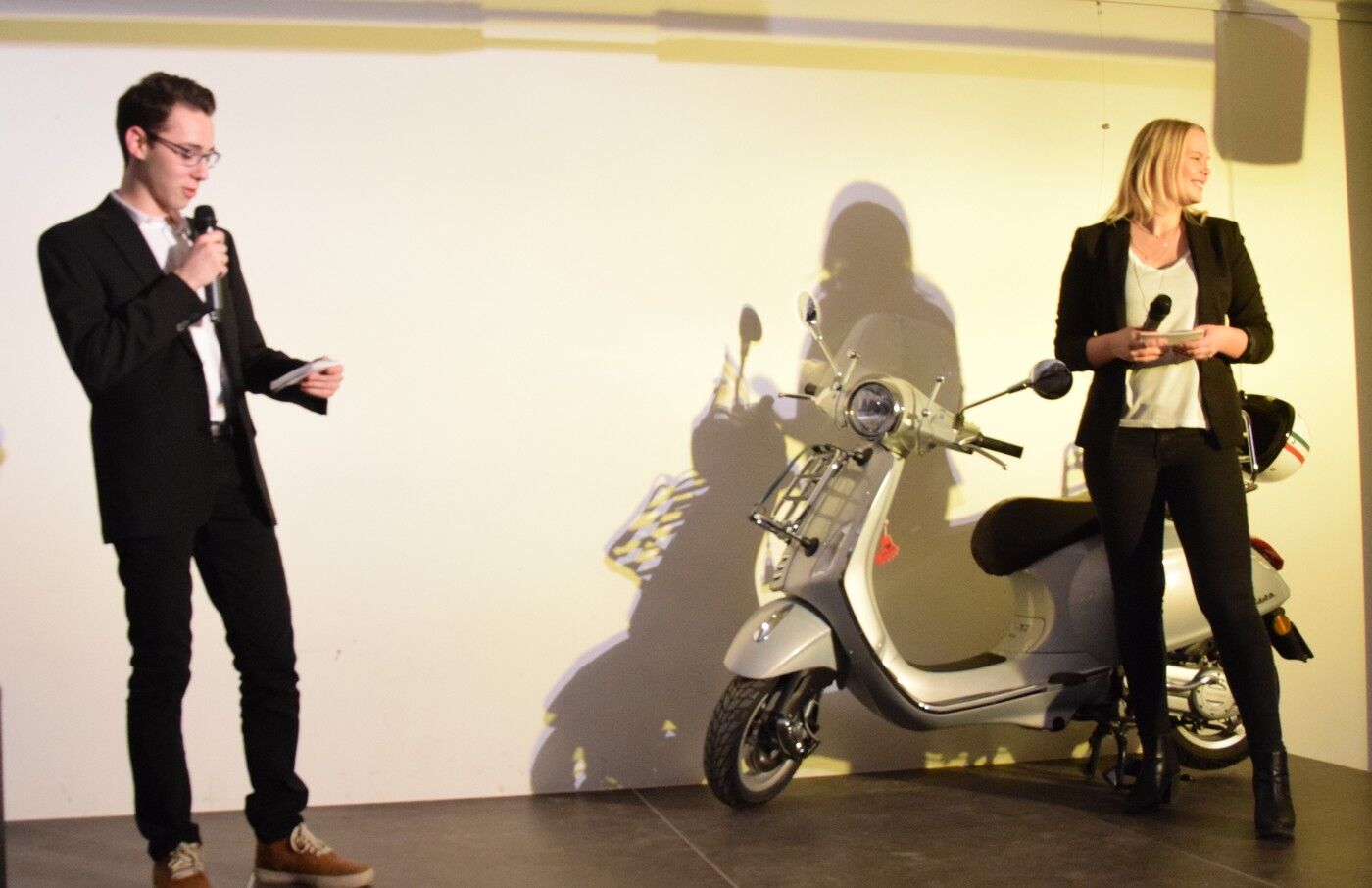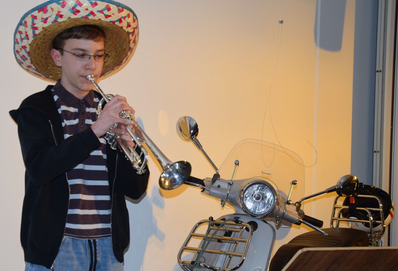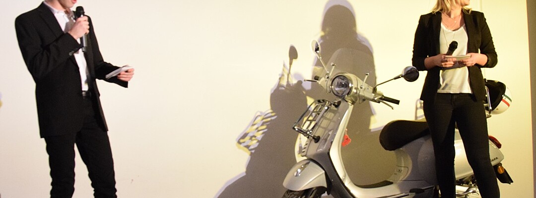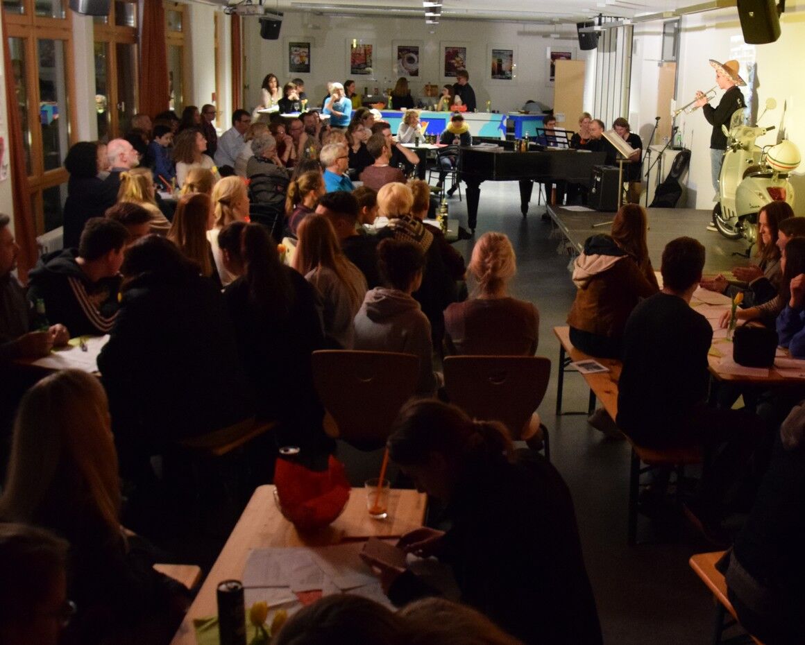 Darüber hinaus hatten die Schülerinnen und Schüler viele Fotos vom Schüler-Austausch mit Rovigo dabei. Amelie Endl verriet viele lustige Episoden des Austausches. Natürlich hatte das Café-Camerloher-Team keine Kosten und Mühen gescheut, um das Publikum mit echt italienischen Getränken und Snacks zu verwöhnen. Zum echten Italien gehört auch eine Vespa, die blitzblank auf der kleinen Bühne im Café Camerloher stand. Dazu mussten alle das bekannte italiensiche Lied von Luna Pop „50 Special“ singen. In dem geht es um die Vespa, die der Inbegriff der Freiheit ist.