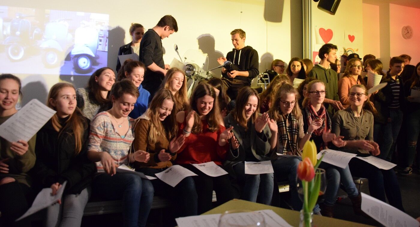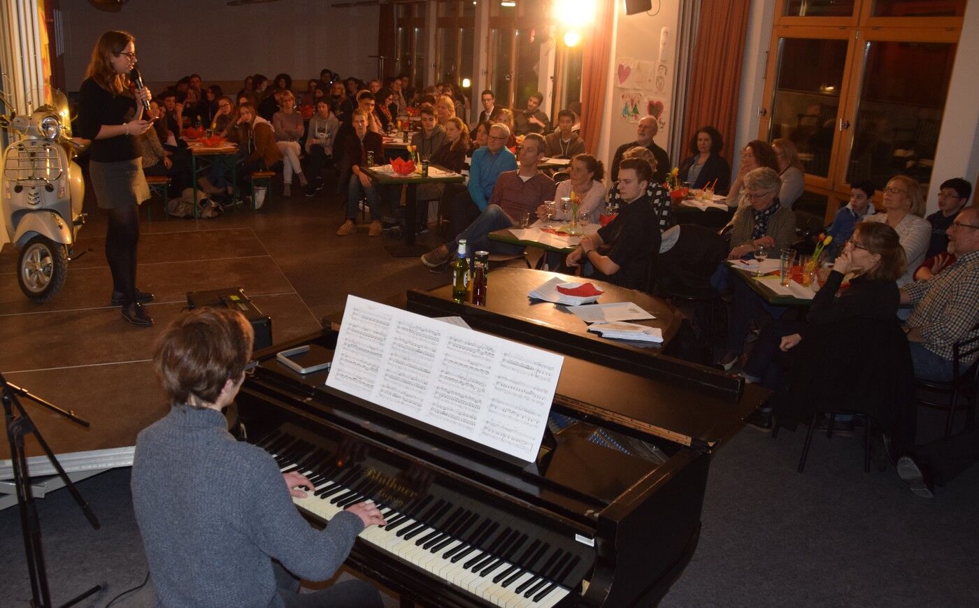 Rechtspopulisten nicht nur in Europa versuchen seit einiger Zeit, Grenzzäune oder sogar Mauern zu errichten, um ihr Land abzuschotten. Wie ein Miteinander in einem geeinten Europa aussehen kann, demonstrierten die Schülerinnen und Schüler des Camerloher-Gymnasiums in ihrer „Bar Roma“ eindrucksvoll. Zoe Kammerlohr und Kevin Scivilia moderierten zweisprachig den zweistündigen kurzweiligen Abend. Zur Einstimmung hatten die 10. Klassen zu einem bekannten Lied von Paolo Conte eine Fotoshow zusammengestellt, die einerseits das Schmuddelwetter im deutschen Frühling zeigte und andererseits strahlende Frühlingsbilder aus der Toskana, von Venedig, Florenz oder Rom gegenüberstellte. Diese stimulierten bei allen die Sehnsucht nach „bella Italia“.