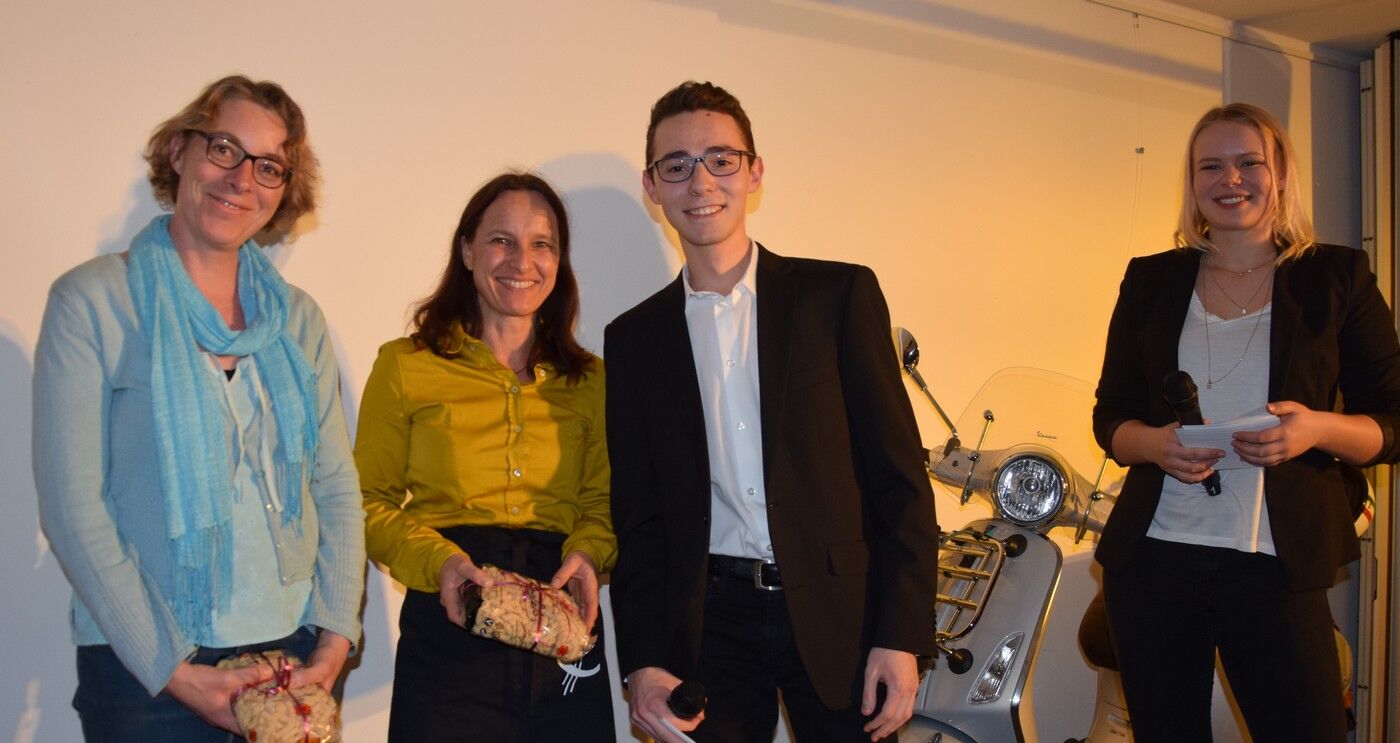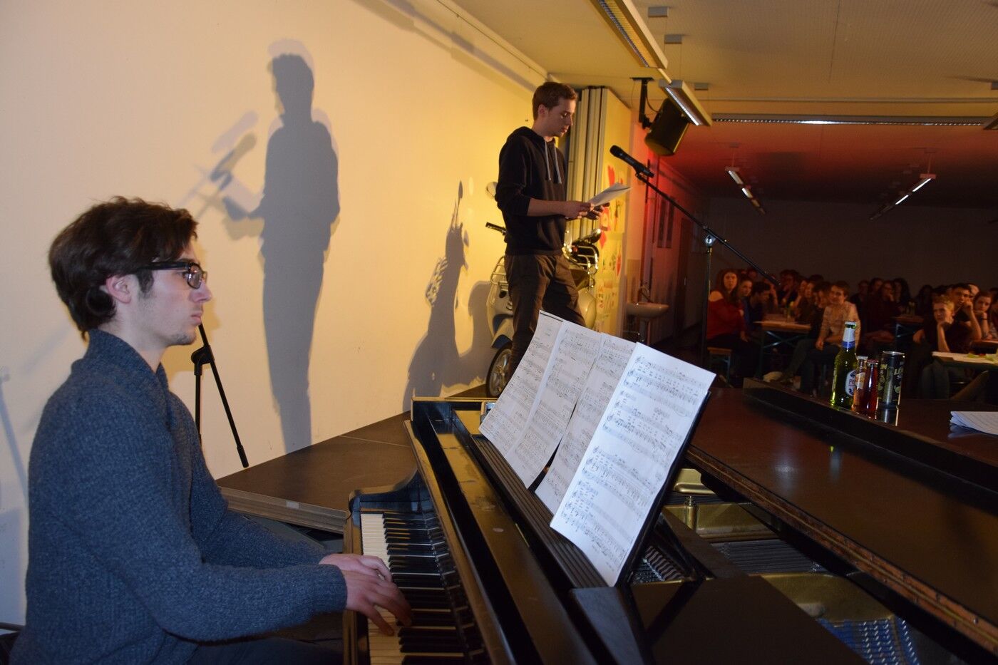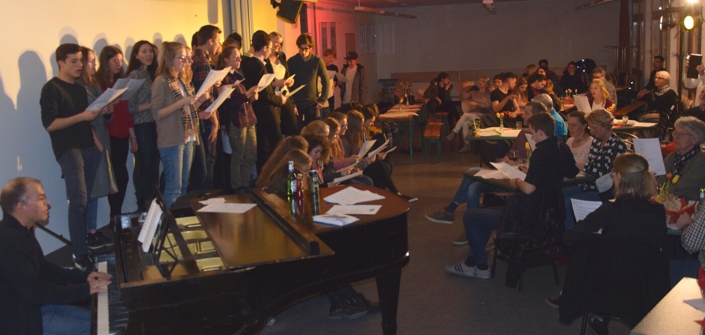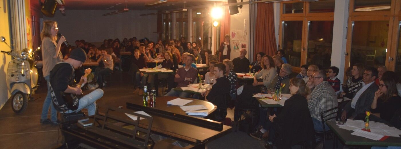 Zwischen all den Vorträgen sorgten die Schülerinnen mit viel Musik für beste Unterhaltung. Lara Pluym, begleitet von Jakob Melzer an der E-Gitarre, rockte „Non me ne frega niente“ von Levante. Klassik („Pur dicesti, o bocca bella“) hatten Leo Niemann (Gesang) und Hannes Lehmann (Piano) in ihrem Reisegepäck mit dabei. Aaron Schwarz (Trompete) und Thomas Noichl (Piano) verwöhnten das Publikum mit dem neapolitanischen Ohrwurm „O sole mio“. Mit voller Hingabe sang Luisa Tafuri Mia Martinis „Minuetto“. Und am Ende des abwechslungsreichen Italiensichen Abends durften alle – wie in den letzten Jahren auch schon – Adriano Celentanos Hit „Azzurro“ singen, um danach in die kühle deutsche Frühlingsnacht entlassen zu werden. Die Fachschaft Italiensch (Veronika Eckl und Lucie Albert) waren sichtlich zufrieden mit dem gelungen Abend. sp
