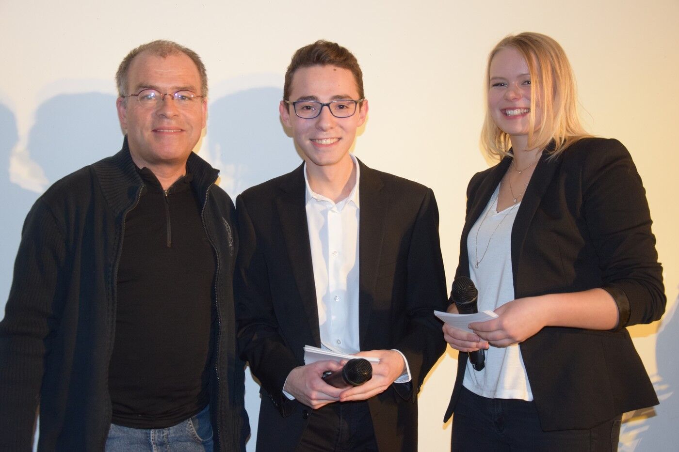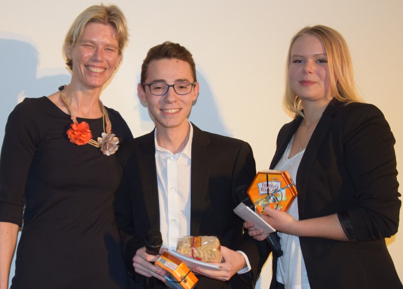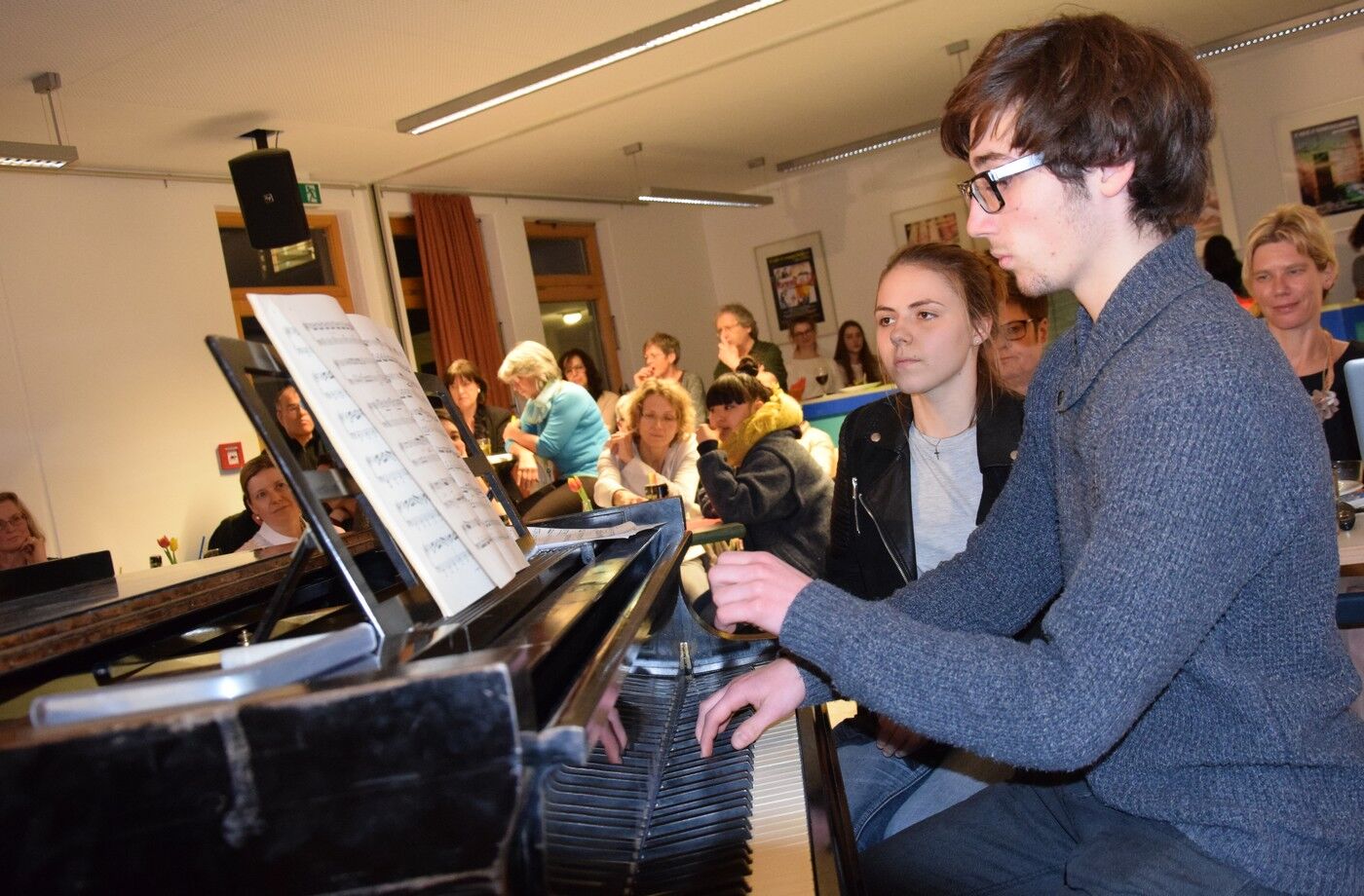 Zwischen all den Vorträgen sorgten die Schülerinnen mit viel Musik für beste Unterhaltung. Lara Pluym, begleitet von Jakob Melzer an der E-Gitarre, rockte „Non me ne frega niente“ von Levante. Klassik („Pur dicesti, o bocca bella“) hatten Leo Niemann (Gesang) und Hannes Lehmann (Piano) in ihrem Reisegepäck mit dabei. Aaron Schwarz (Trompete) und Thomas Noichl (Piano) verwöhnten das Publikum mit dem neapolitanischen Ohrwurm „O sole mio“. Mit voller Hingabe sang Luisa Tafuri Mia Martinis „Minuetto“. Und am Ende des abwechslungsreichen Italiensichen Abends durften alle – wie in den letzten Jahren auch schon – Adriano Celentanos Hit „Azzurro“ singen, um danach in die kühle deutsche Frühlingsnacht entlassen zu werden. Die Fachschaft Italiensch (Veronika Eckl und Lucie Albert) waren sichtlich zufrieden mit dem gelungen Abend. sp