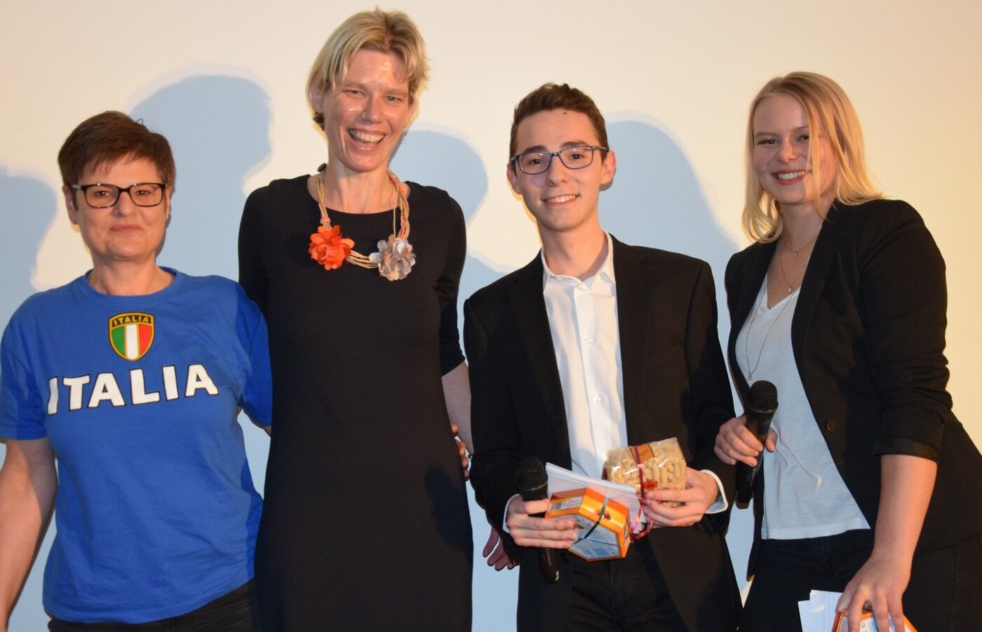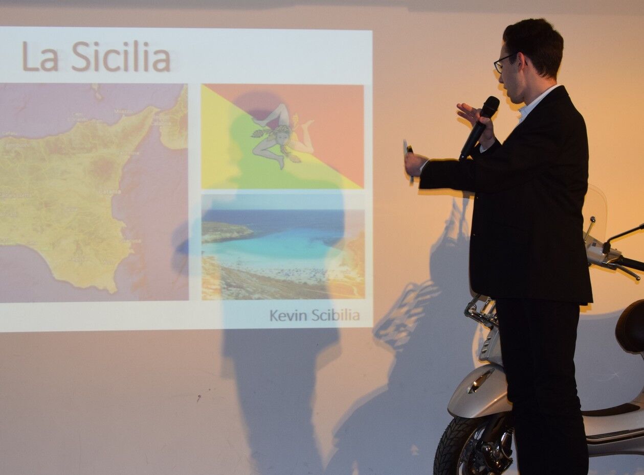 Im Mittelpunkt des Abends standen fünf Schülerinnen und Schüler mit italienischen Wurzeln, die dem Publikum sehr anschaulich und unterhaltsam ihr ganz persönliches Italien präsentierten. Magdalena Unterkofler, in Südtirol aufgewachsen, erzählte beispielsweise von ihrer Oma, die in Zeiten des italienischen Faschismus‘ in Geheimschulen Deutsch lernte. Magdalena Unterkofler switchte perfekt um zwischen Italienisch, Deutsch und ihrem südtiroler Dialekt. „Für mich sind die südtiroler Berge meine Heimat, die ich immer in meinem Herzen tragen werde“, so Magdalena Unterkofler. Die Reise ging dann weiter ins Piemont. Stella Schebesta gewährte Einblicke in ihr Familienleben. Ihre Mutter stammt aus dem Piemont. Ihr Papa ist Deutscher. Die beiden haben sich in Paris kennengelernt, wollten dann eigentlich gar nicht so lange in Deutschland leben. „Aber sie haben dann doch in Deutschland Wurzeln geschlagen“, berichtete Stella Schebesta. Raphael Cera erzählte von seinem Großvater, der auf Sardinen gelebt hat, als Gastarbeiter nach Deutschland gekommen ist und eine Deutsche geheiratet hat. Wie übrigens alle anderen Referenten hatte Raphael Cera seinen Vortrag mit eindrucksvollen Fotos hinterlegt. Luisa Tafuri ist eine echte temperamentvolle Römerin hatte eine Werbekampagne für die „Ewige Stadt“ mit dabei. Wie bei Kevin Scibilia, dessen Vater in Sizilien aufgewachsen ist, kamen die Eltern der beiden wegen eines guten Jobs nach Freising. Kevin Scibilia informierte, dass früher die sizilianischen Bauern auswanderten, heute seien es vor allem junge Akademiker, die ihr Glück im Ausland suchten.