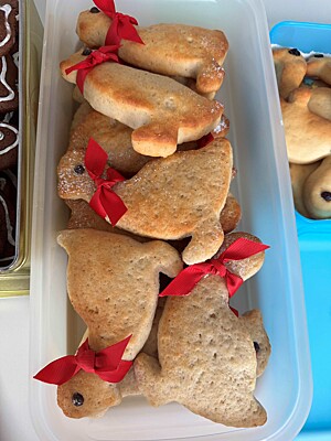 Dank der tollen Unterstützung landete am 11.11.2025 ein riesiger Schwarm von liebevoll verzierten Martinsgänsen am Camerloher und erfüllte unsere Schule wieder mit dem Duft früherer Martinstage. Die Mitglieder des AK Fair Trade haben es geschafft, alle Gänse in den Pausen an die Frau/ den Mann zu bringen. Einige Gänse, die am Dienstag noch nicht den „Abflug“ in die Camerloher Bäuche geschafft hatten, wurden am Mittwoch noch ihrer Bestimmung zugeführt.